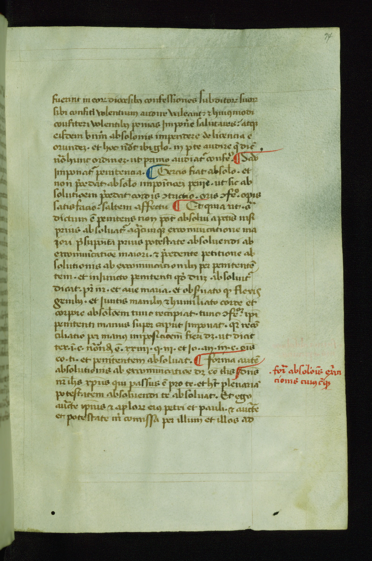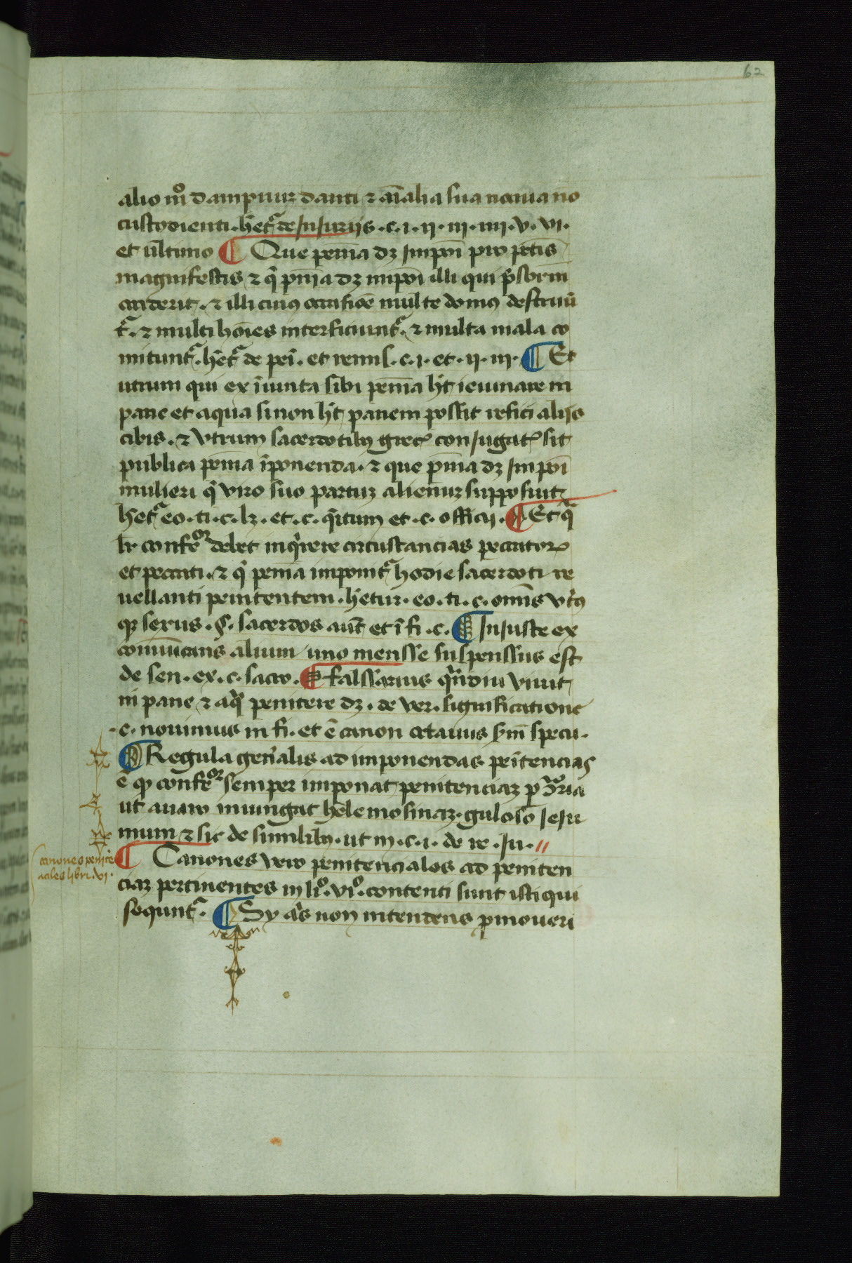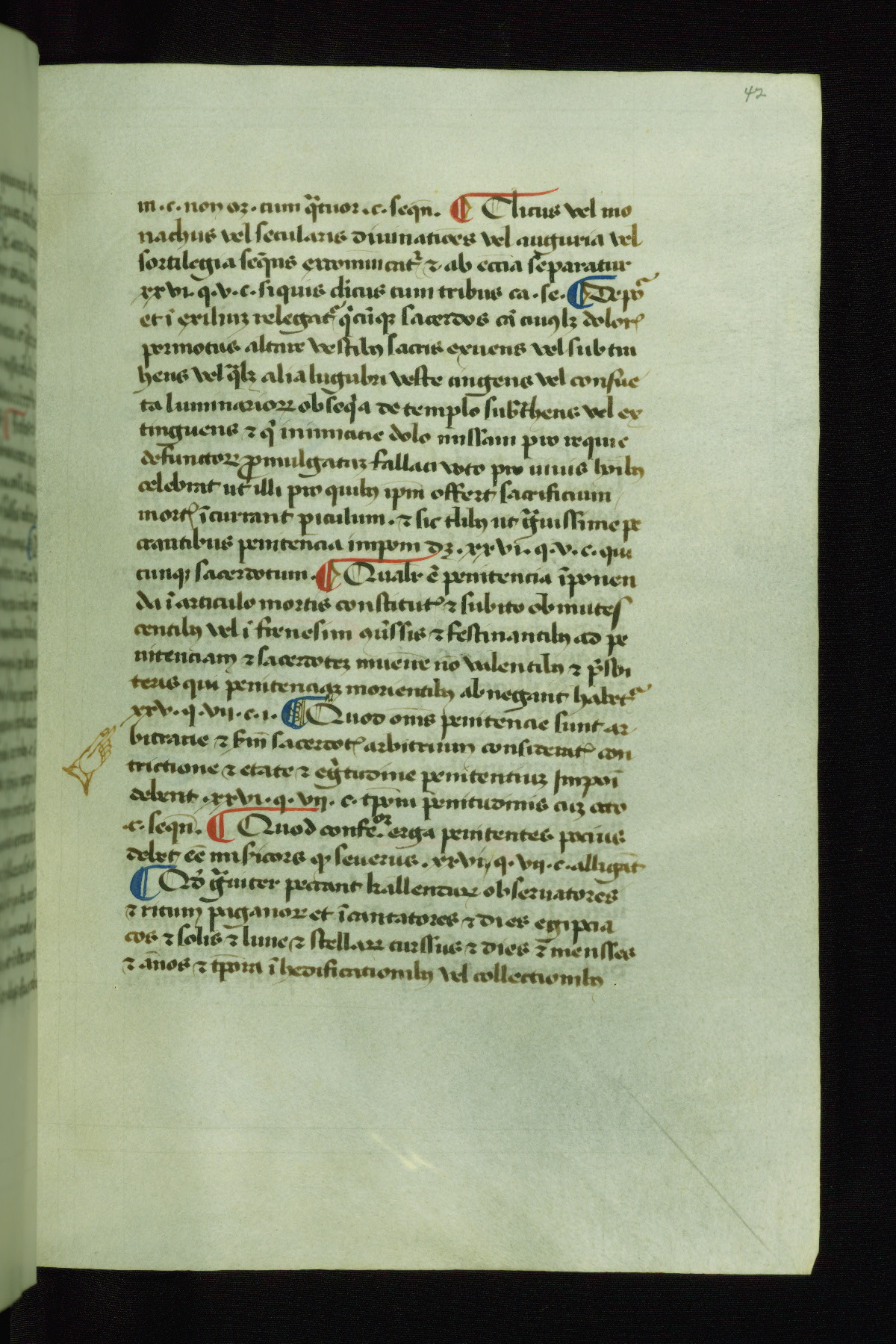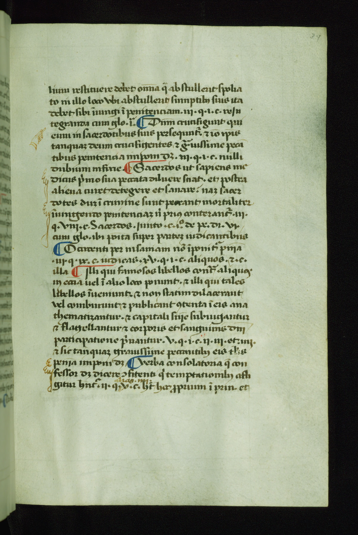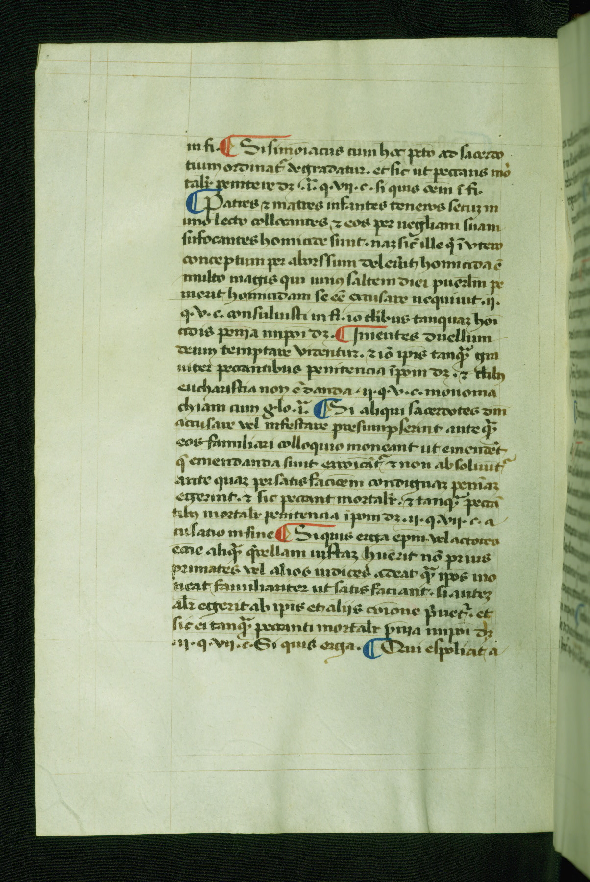 Alphonsus de Benavento wrote the treatise on penitential canons and acts of confession contained in this manuscript. The colophon informs us that Alphonsus was a professor of canon law at the university of Salmanca, Spain, and wrote this manuscript in 1456 in the nearby city of Tejares. At that time there was a pestilence in the city, for which Alphonsus asks for prayers. A historiated initial in which Alphonsus presents the treatise to a bishop begins the text, and the manuscript still retains its original stamped red leather binding.