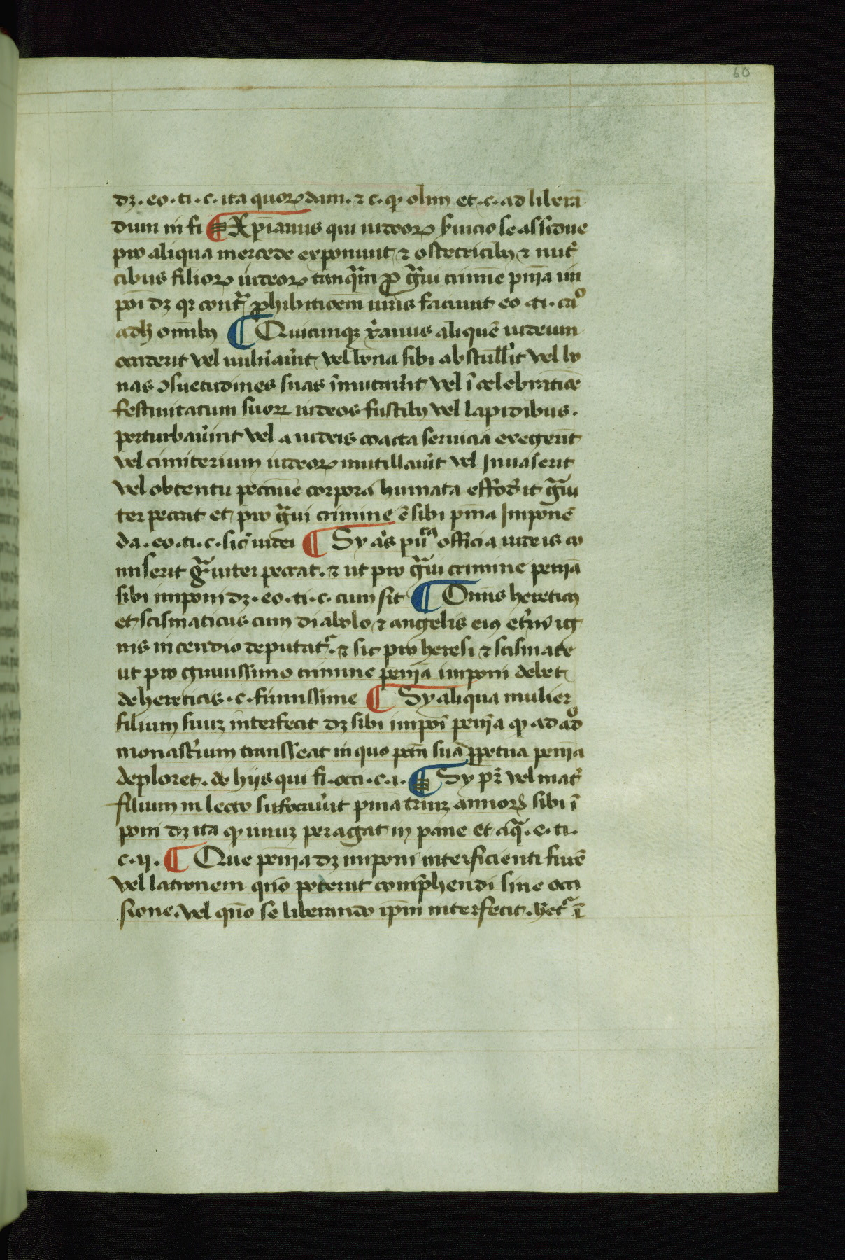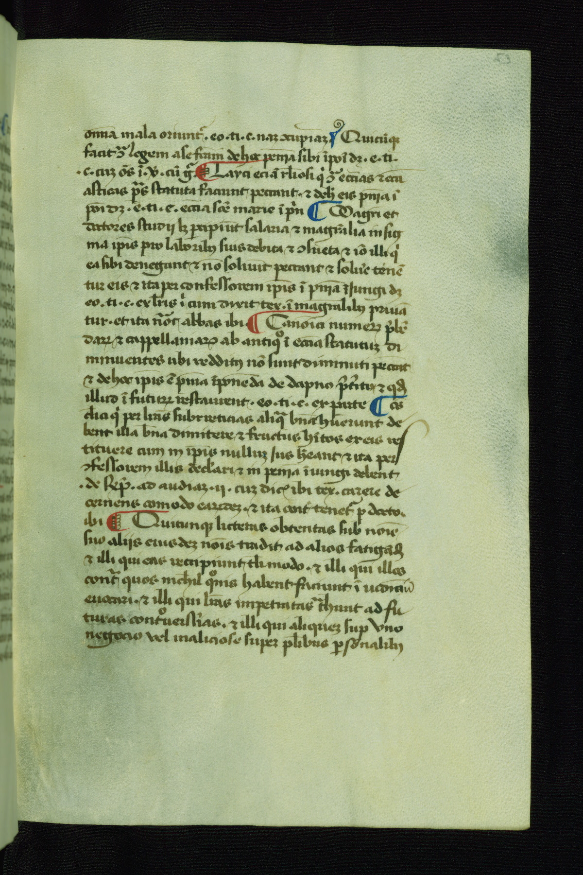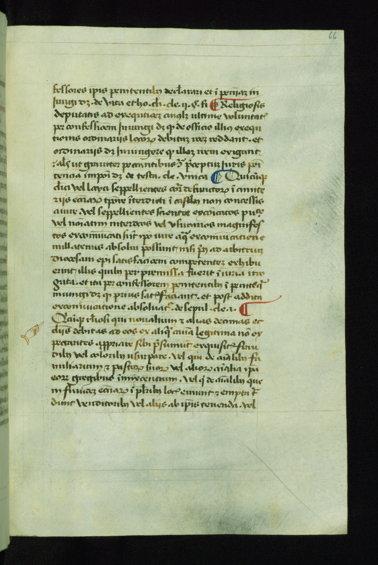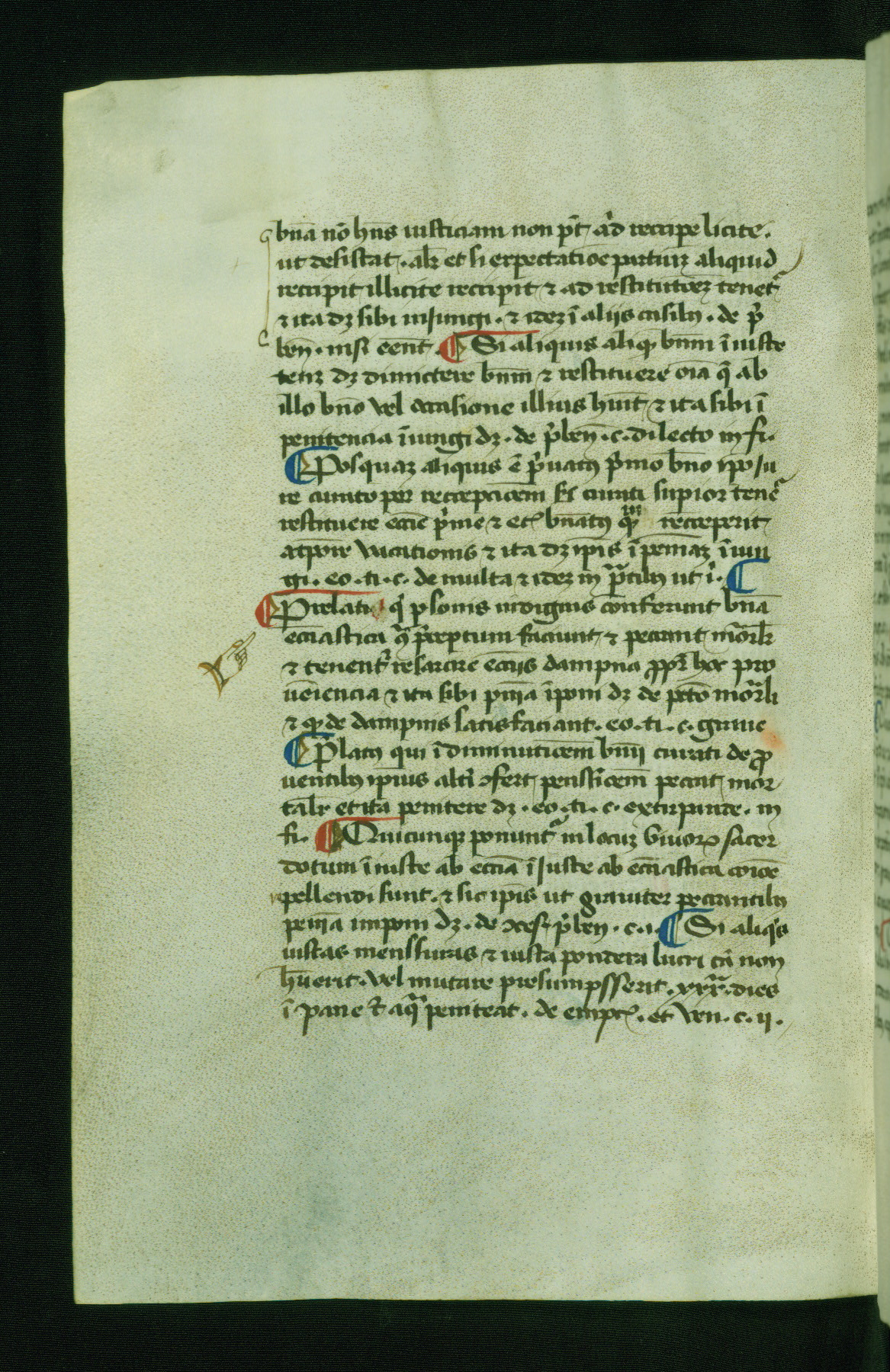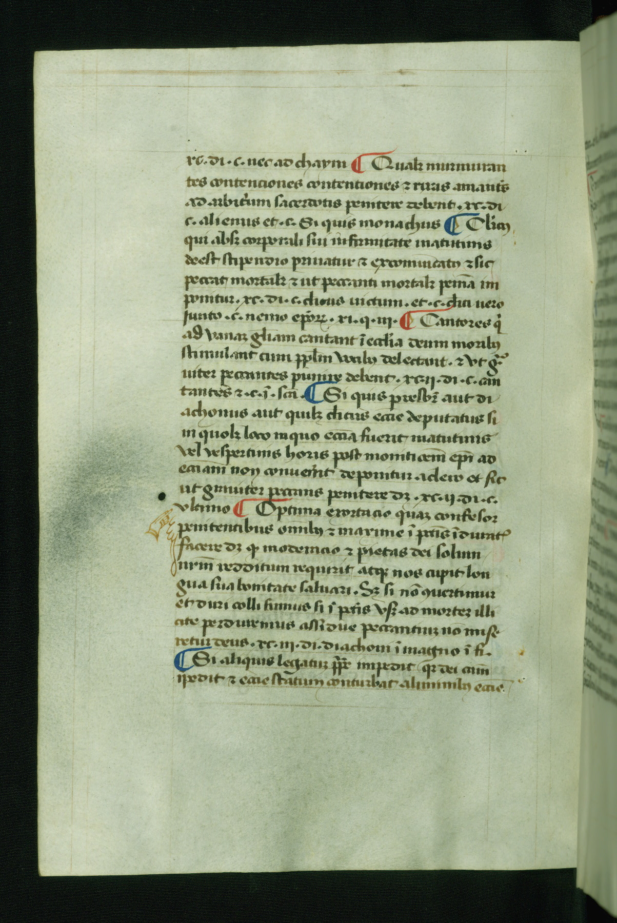 Alphonsus de Benavento wrote the treatise on penitential canons and acts of confession contained in this manuscript. The colophon informs us that Alphonsus was a professor of canon law at the university of Salmanca, Spain, and wrote this manuscript in 1456 in the nearby city of Tejares. At that time there was a pestilence in the city, for which Alphonsus asks for prayers. A historiated initial in which Alphonsus presents the treatise to a bishop begins the text, and the manuscript still retains its original stamped red leather binding.