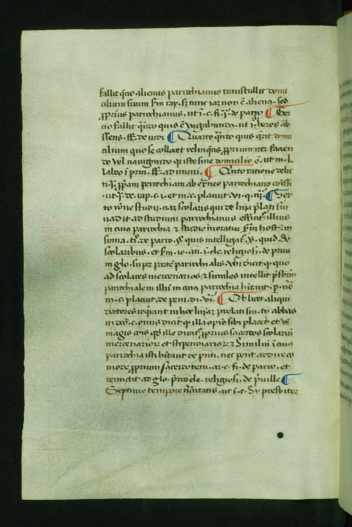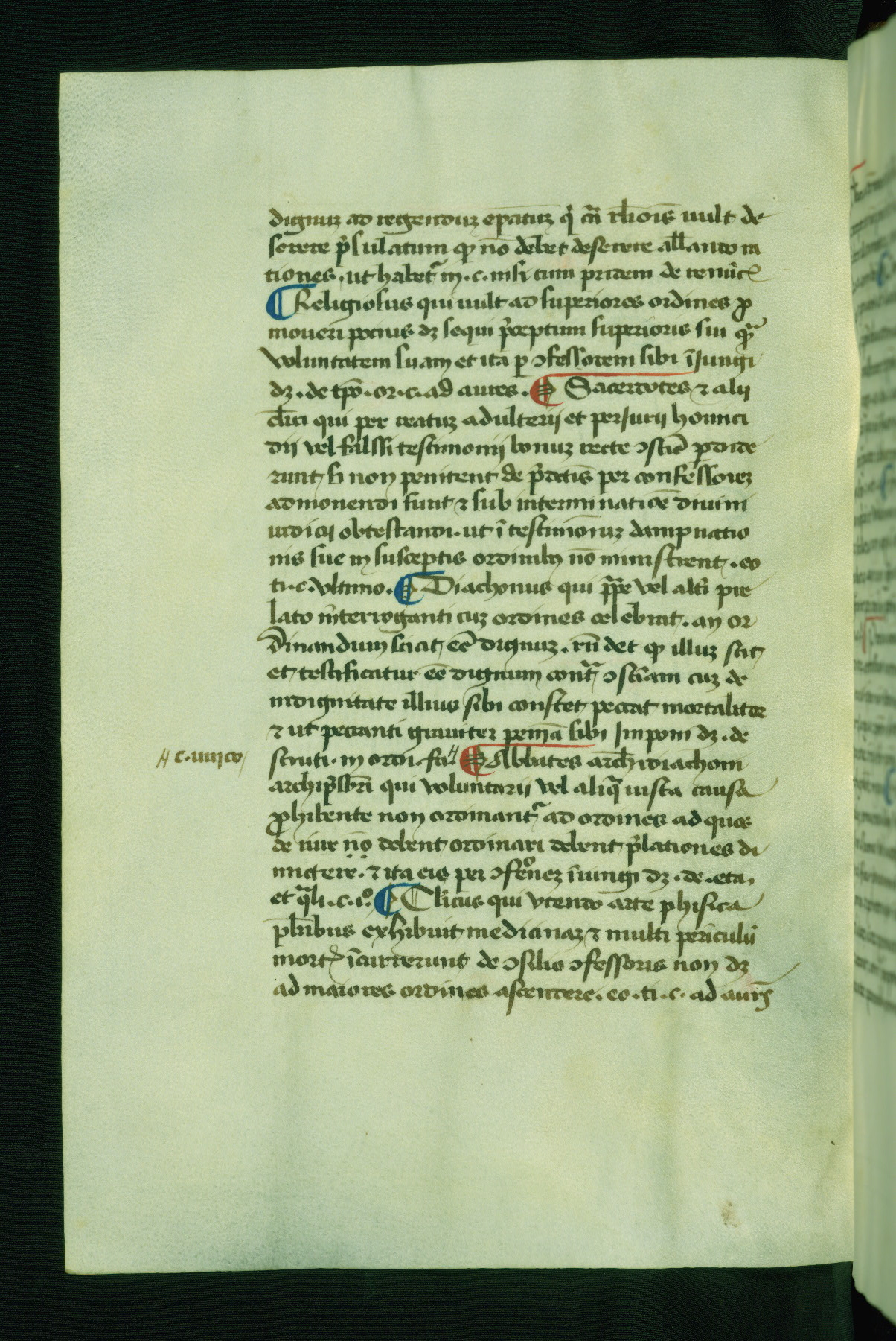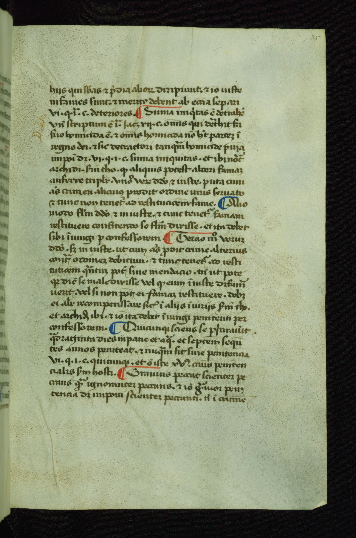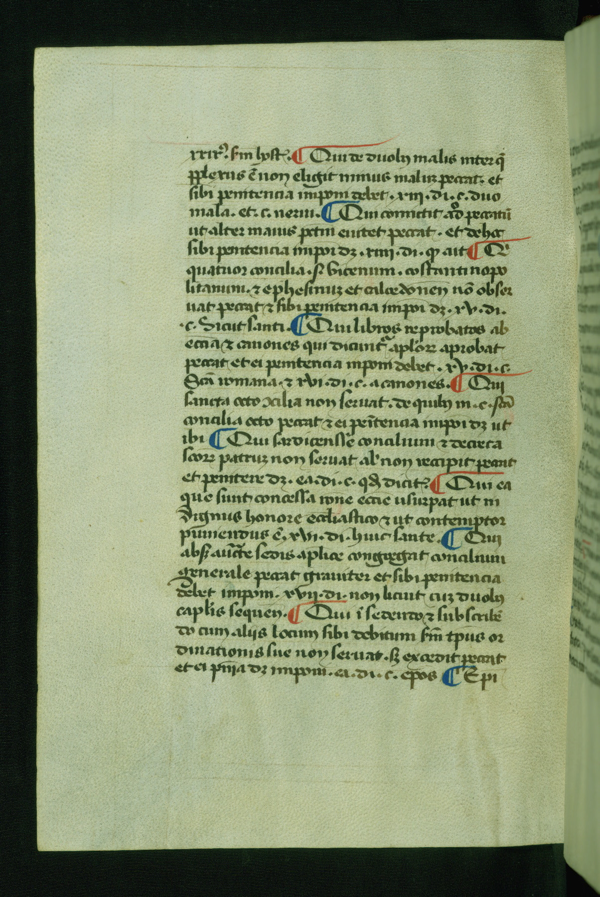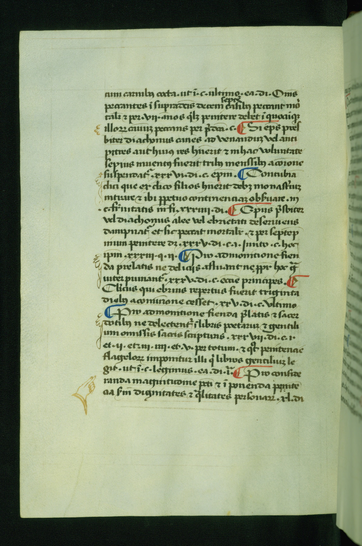 Alphonsus de Benavento wrote the treatise on penitential canons and acts of confession contained in this manuscript. The colophon informs us that Alphonsus was a professor of canon law at the university of Salmanca, Spain, and wrote this manuscript in 1456 in the nearby city of Tejares. At that time there was a pestilence in the city, for which Alphonsus asks for prayers. A historiated initial in which Alphonsus presents the treatise to a bishop begins the text, and the manuscript still retains its original stamped red leather binding.