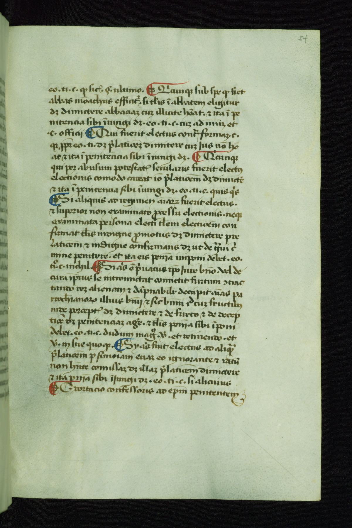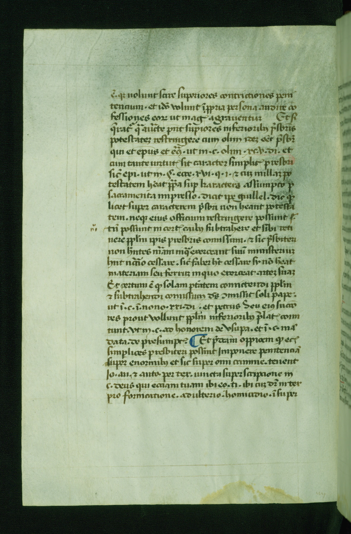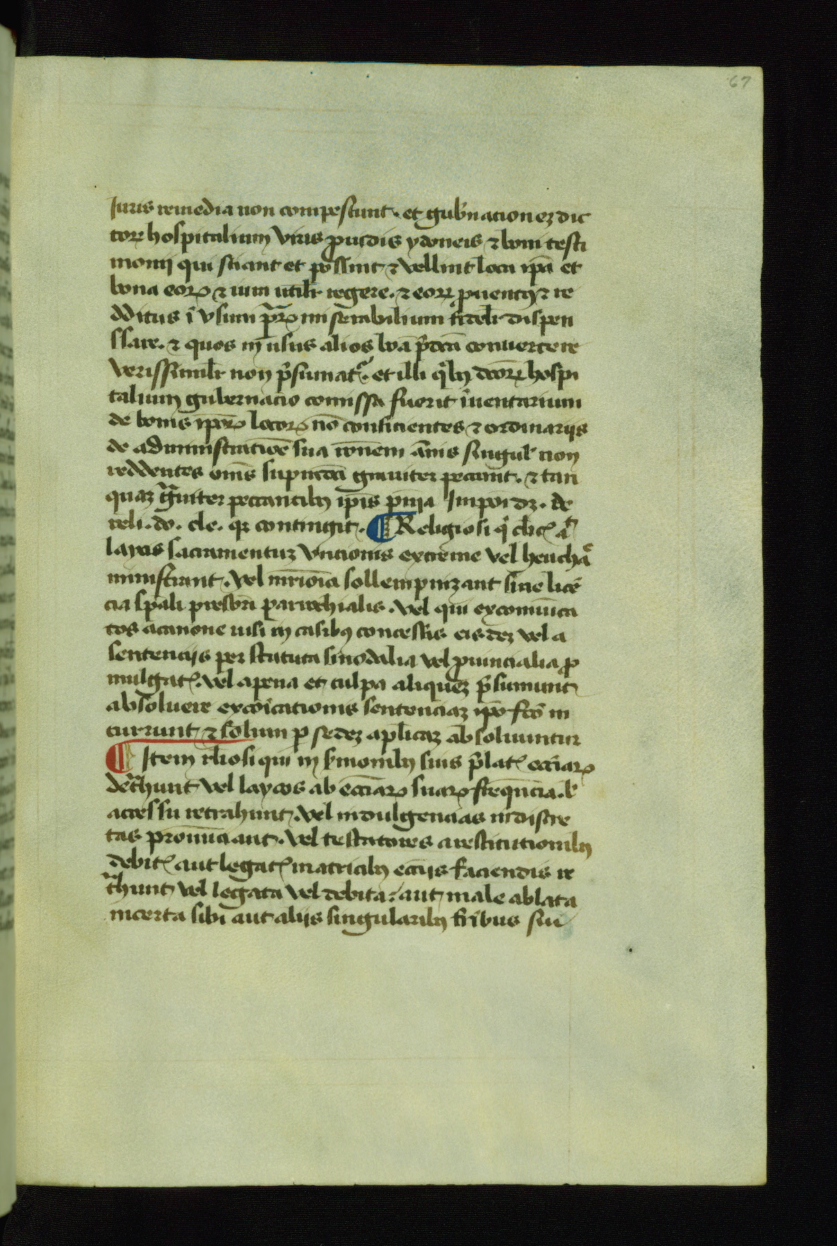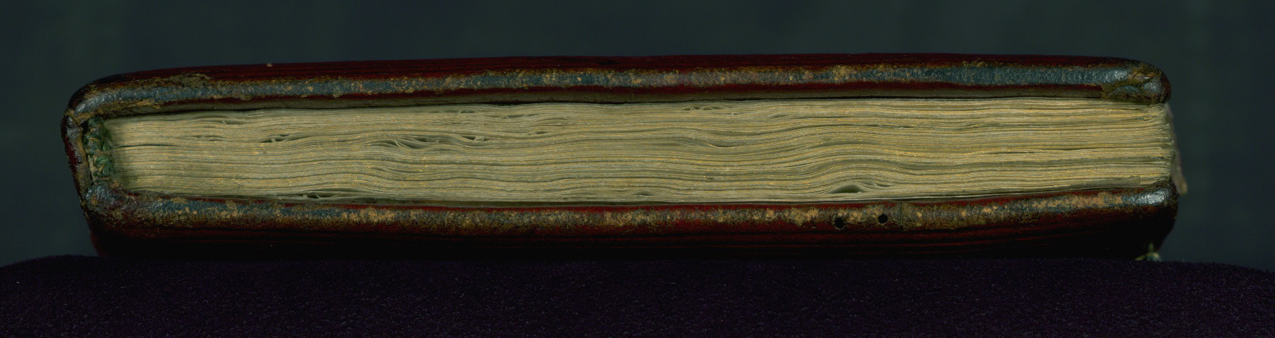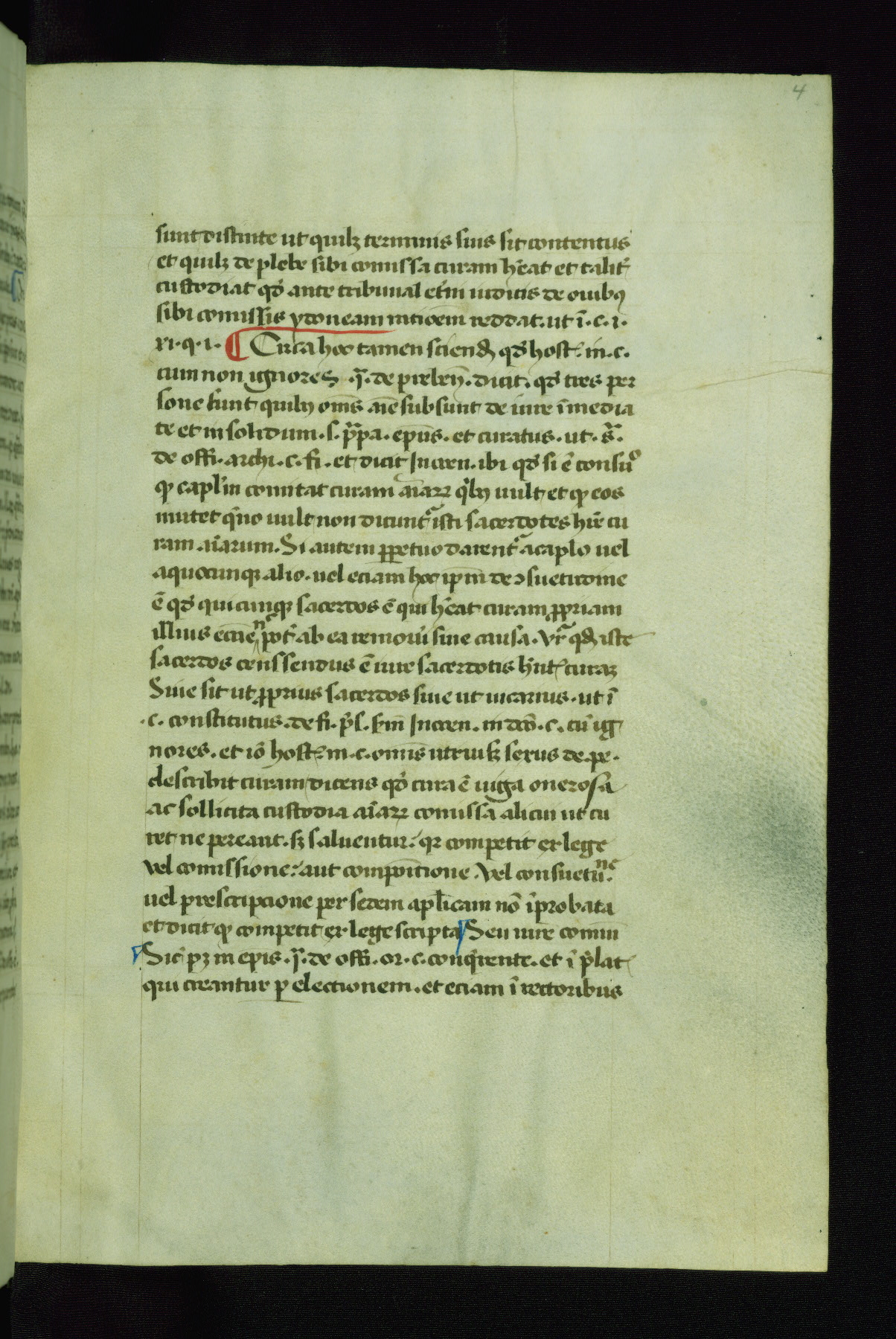 Alphonsus de Benavento wrote the treatise on penitential canons and acts of confession contained in this manuscript. The colophon informs us that Alphonsus was a professor of canon law at the university of Salmanca, Spain, and wrote this manuscript in 1456 in the nearby city of Tejares. At that time there was a pestilence in the city, for which Alphonsus asks for prayers. A historiated initial in which Alphonsus presents the treatise to a bishop begins the text, and the manuscript still retains its original stamped red leather binding.