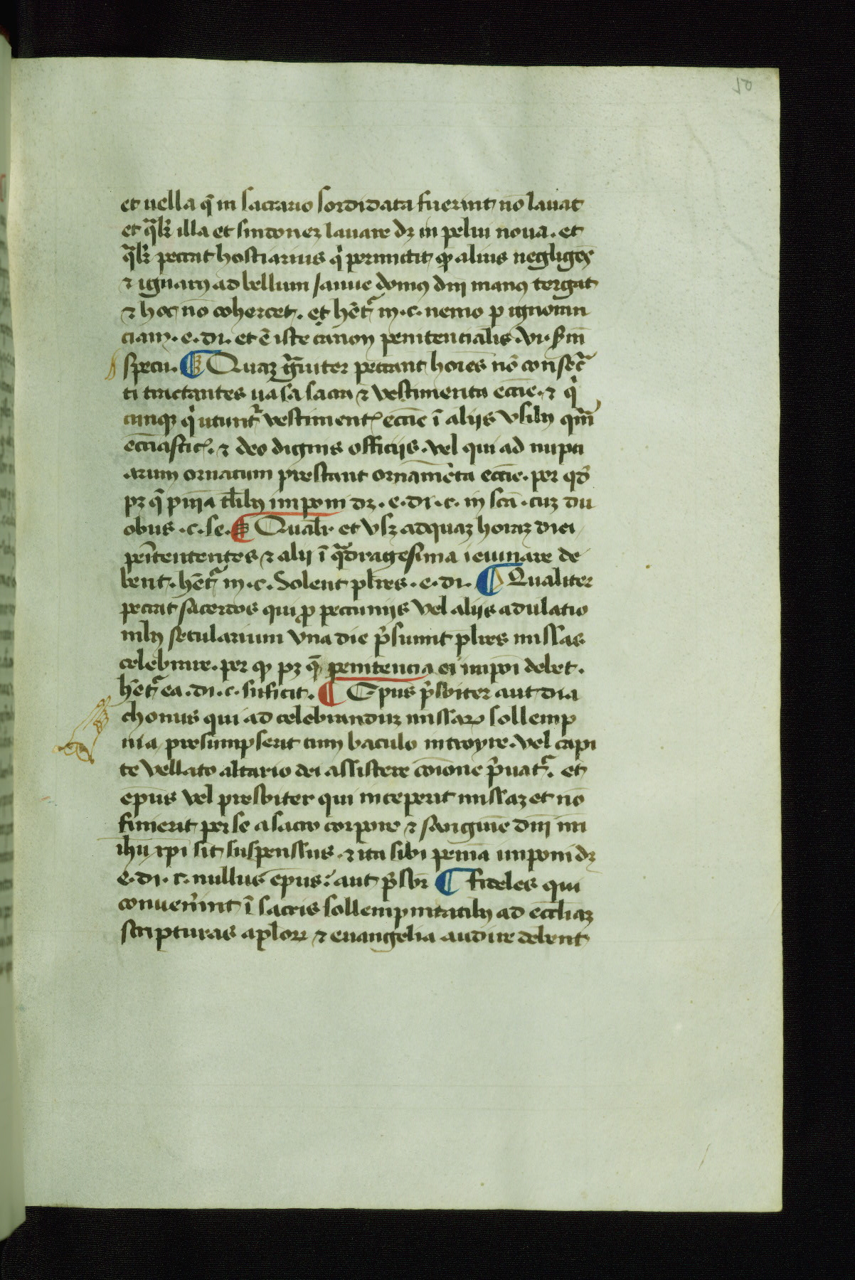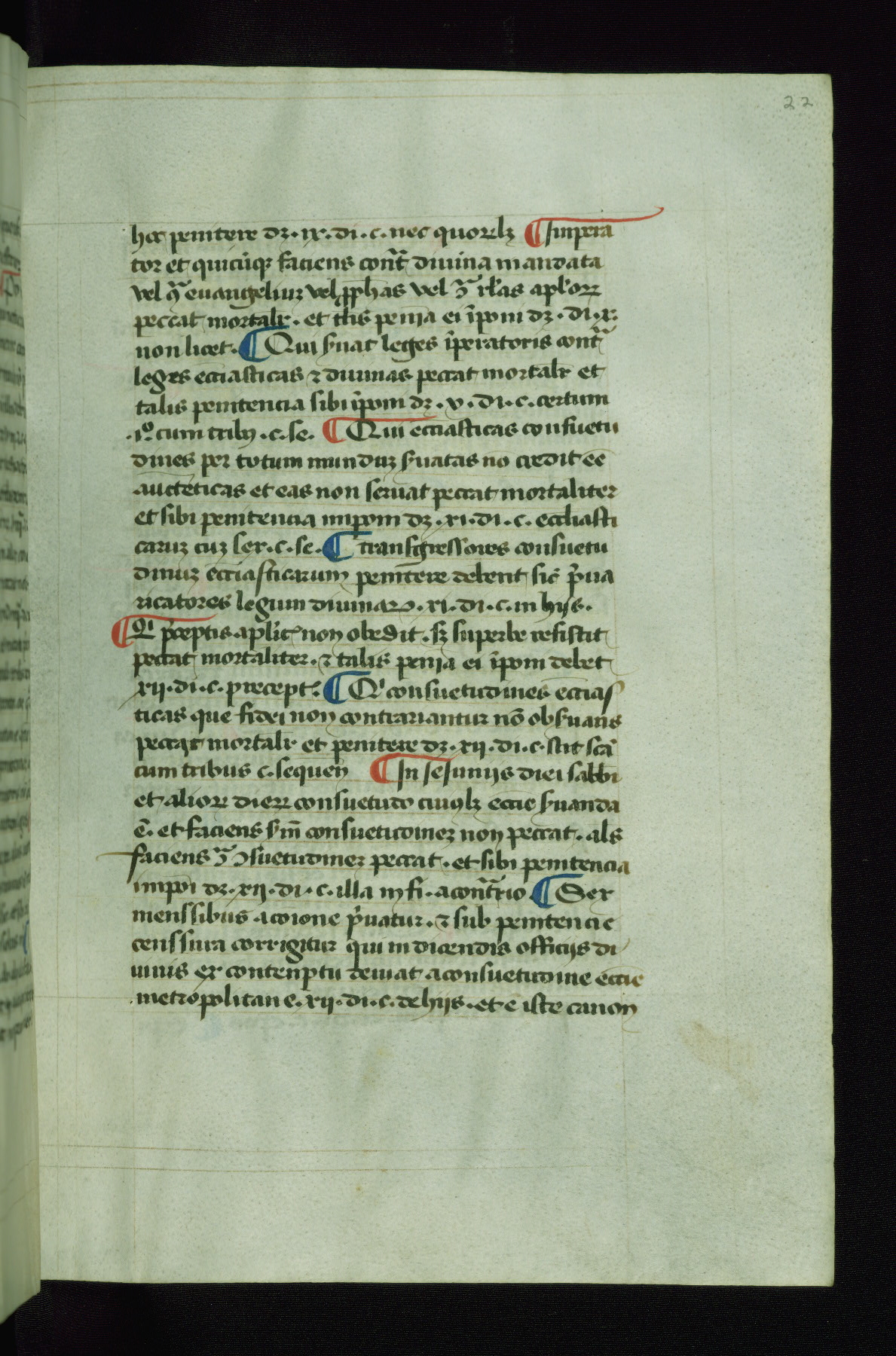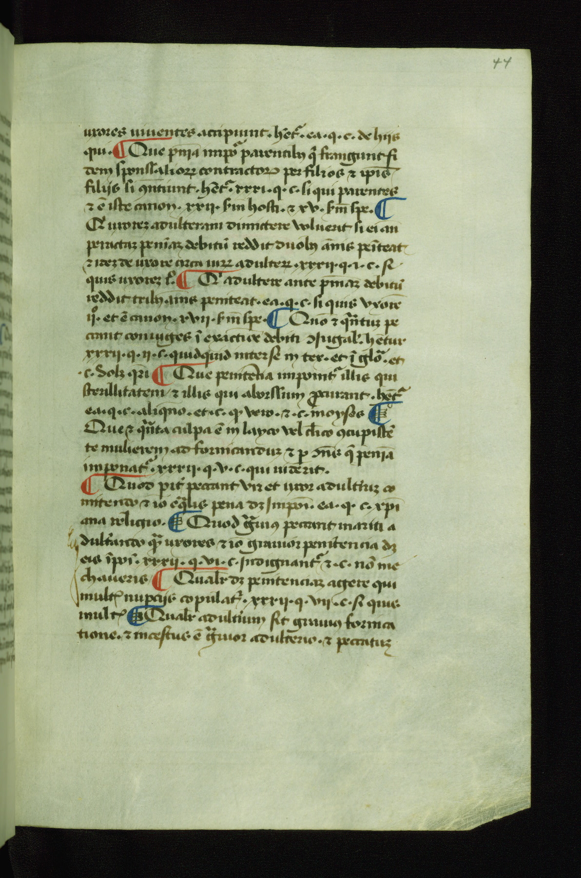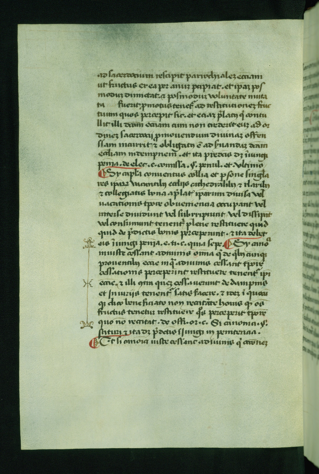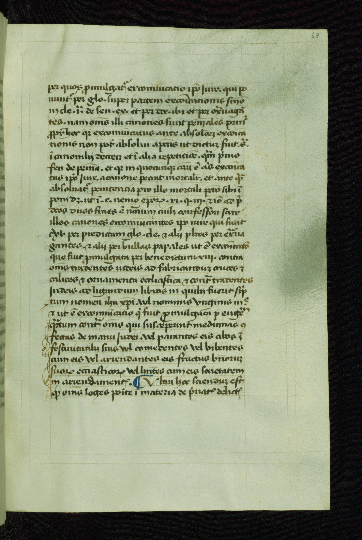 Alphonsus de Benavento wrote the treatise on penitential canons and acts of confession contained in this manuscript. The colophon informs us that Alphonsus was a professor of canon law at the university of Salmanca, Spain, and wrote this manuscript in 1456 in the nearby city of Tejares. At that time there was a pestilence in the city, for which Alphonsus asks for prayers. A historiated initial in which Alphonsus presents the treatise to a bishop begins the text, and the manuscript still retains its original stamped red leather binding.