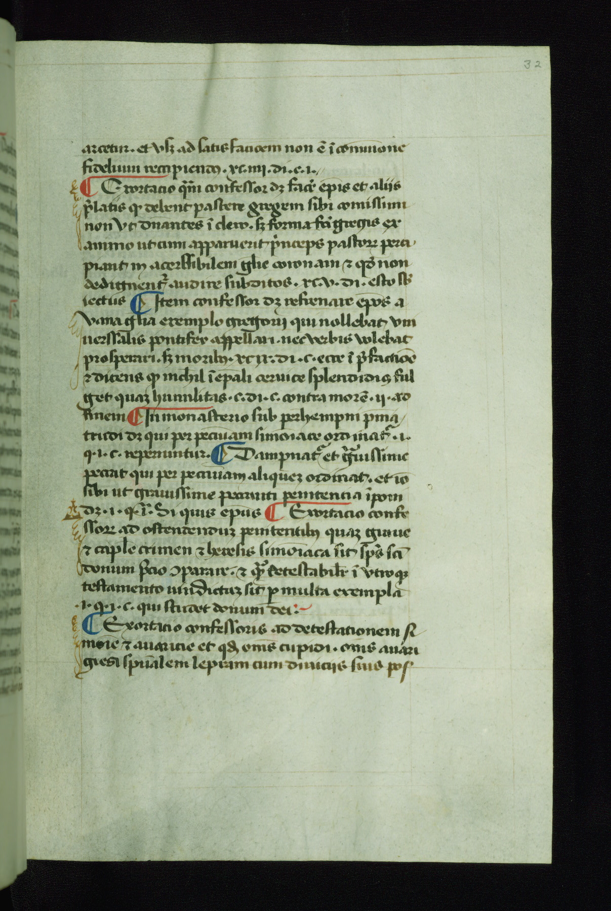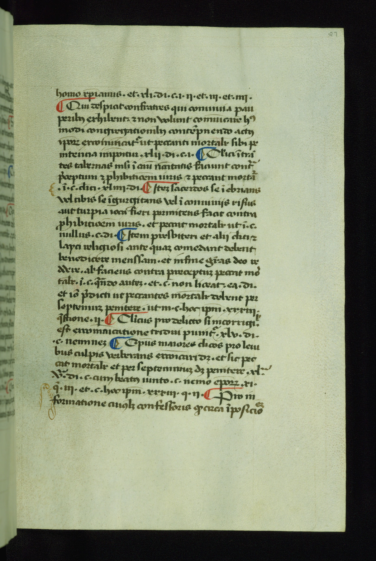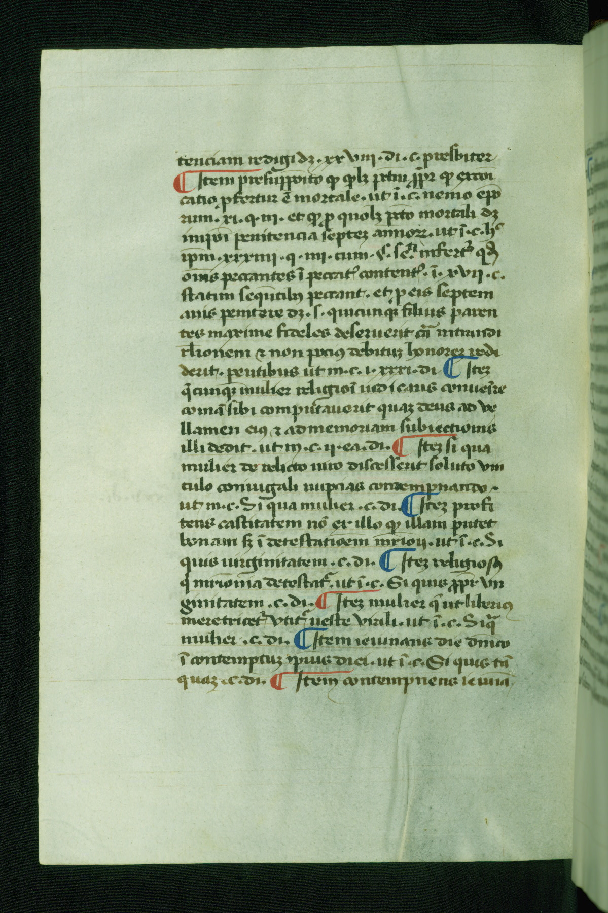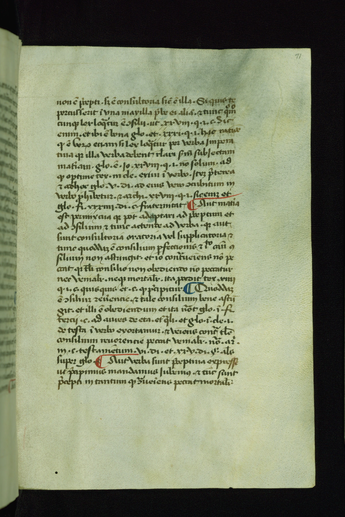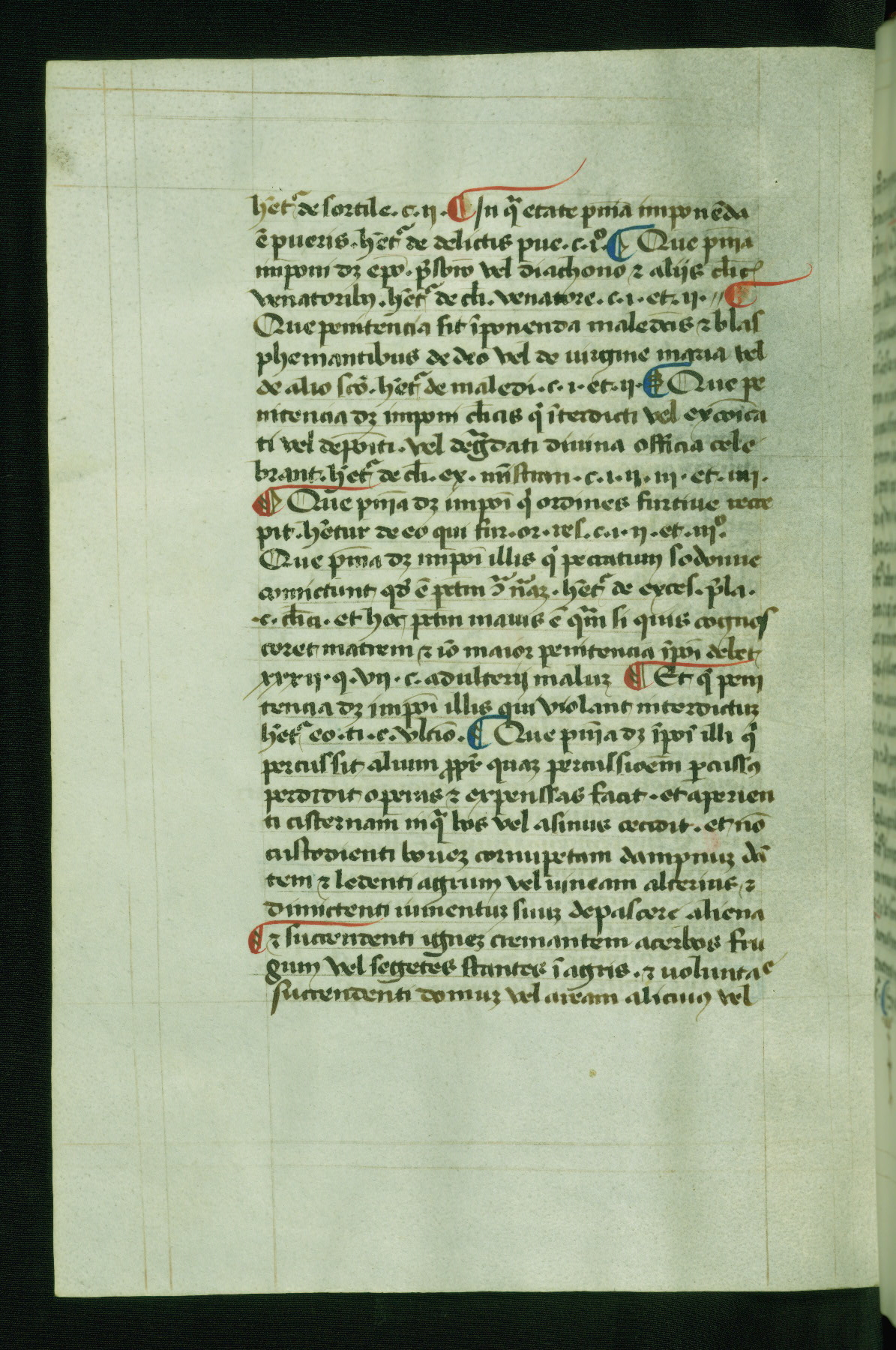 Alphonsus de Benavento wrote the treatise on penitential canons and acts of confession contained in this manuscript. The colophon informs us that Alphonsus was a professor of canon law at the university of Salmanca, Spain, and wrote this manuscript in 1456 in the nearby city of Tejares. At that time there was a pestilence in the city, for which Alphonsus asks for prayers. A historiated initial in which Alphonsus presents the treatise to a bishop begins the text, and the manuscript still retains its original stamped red leather binding.