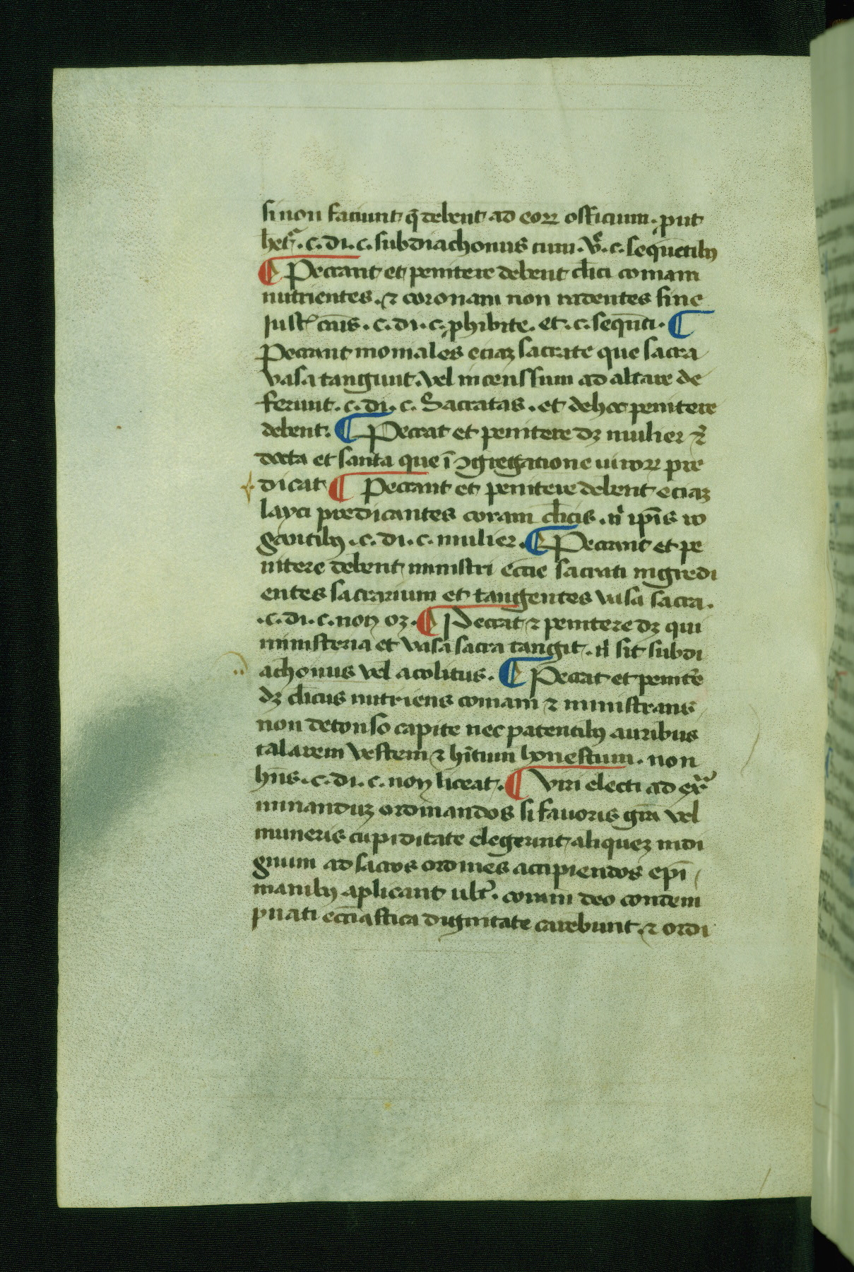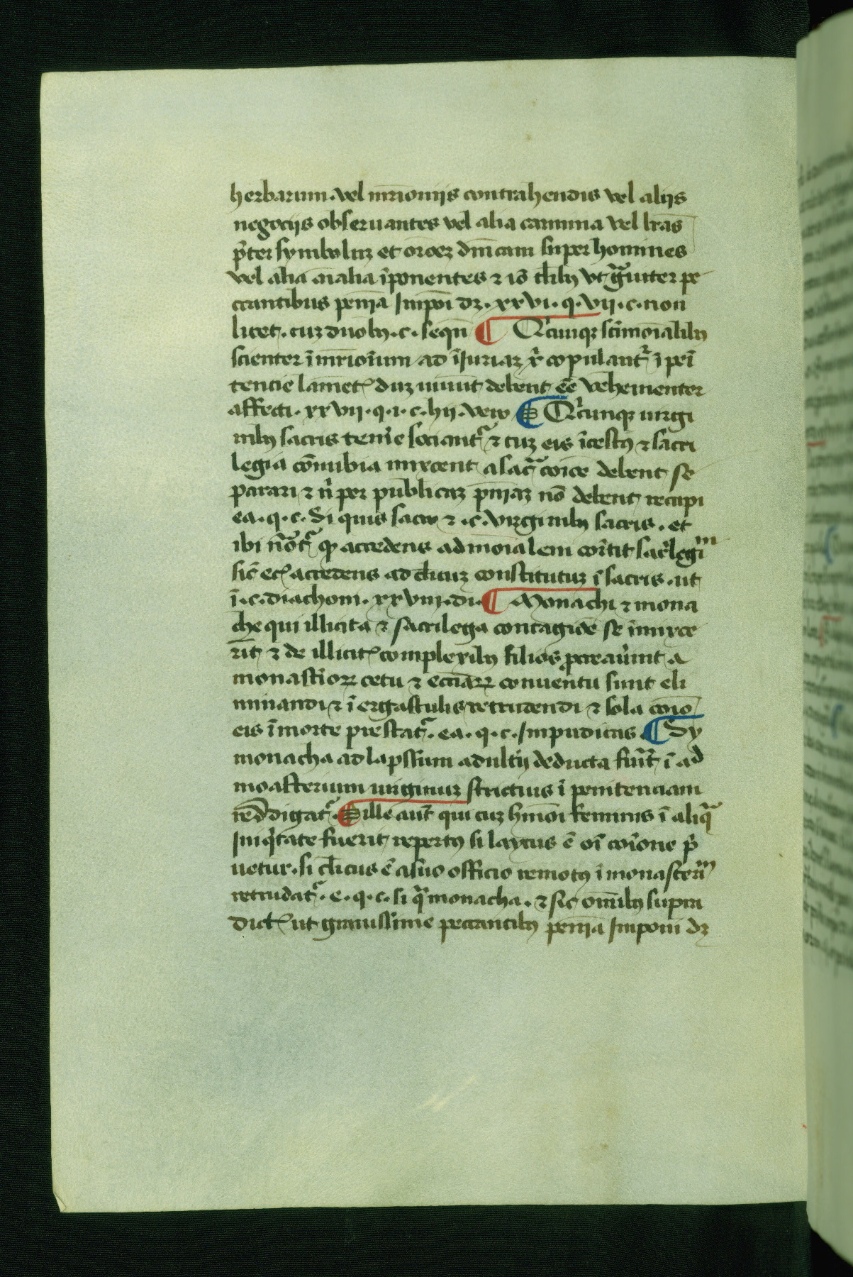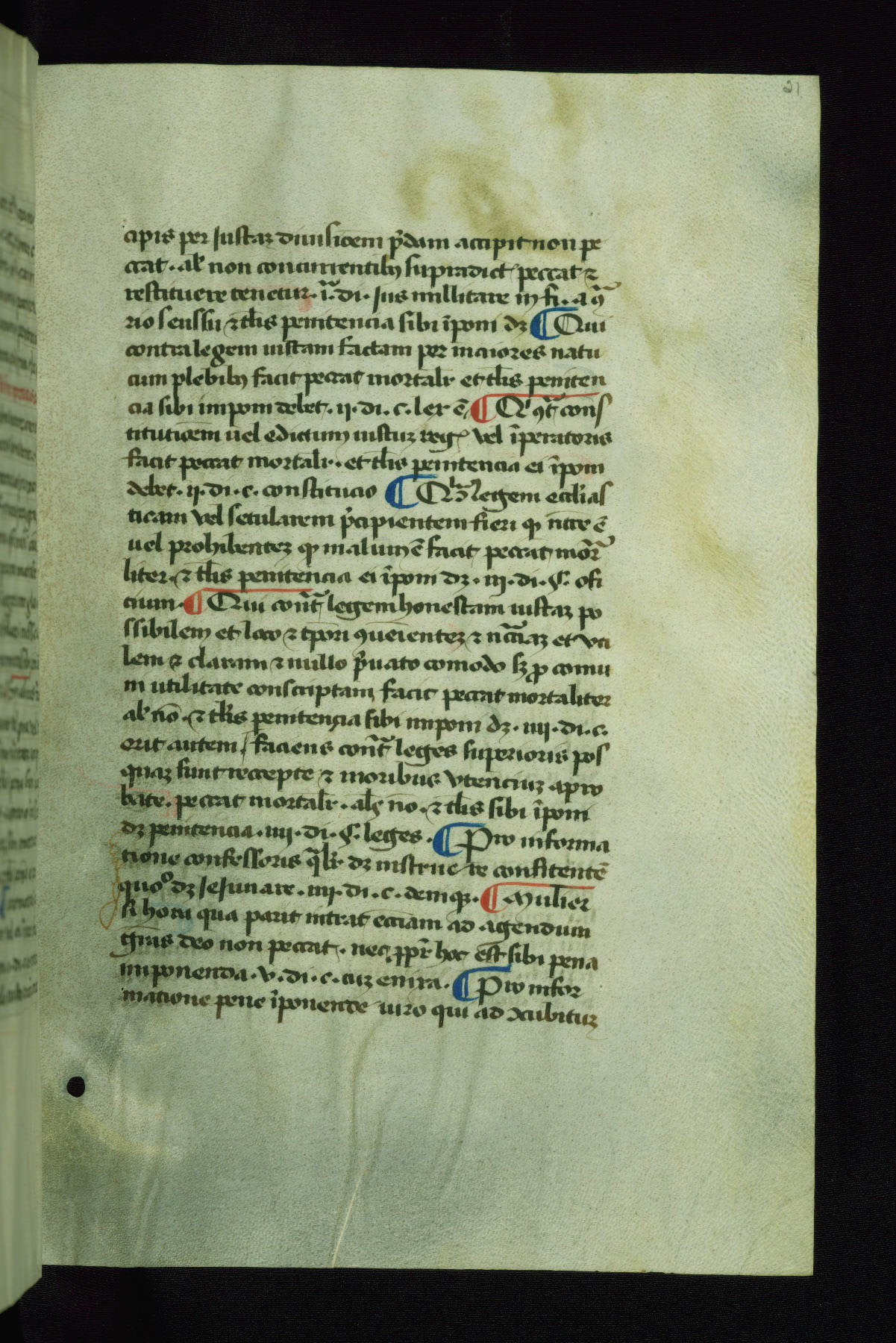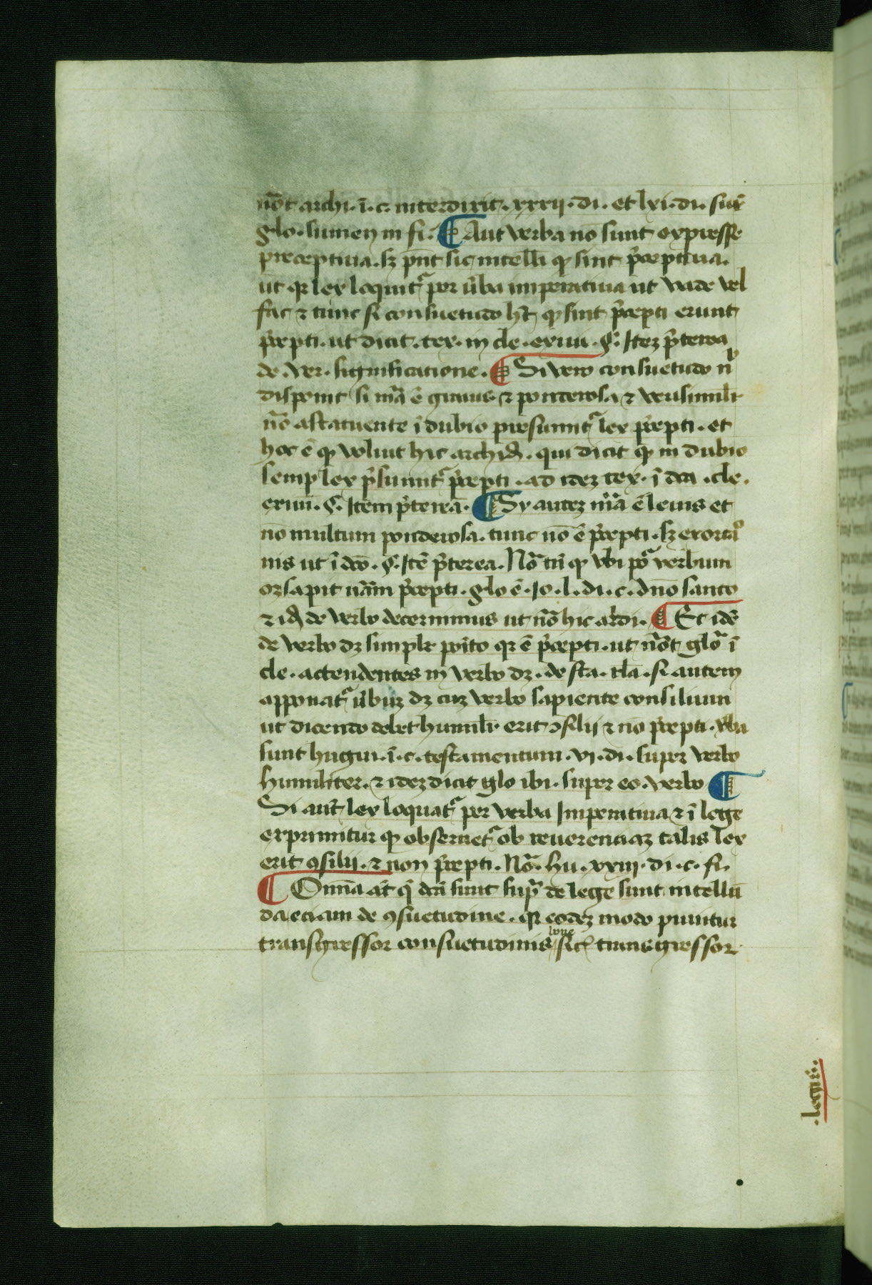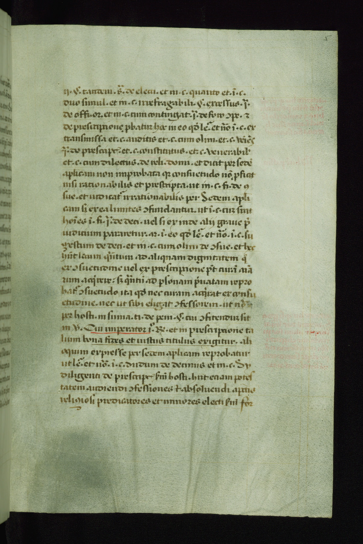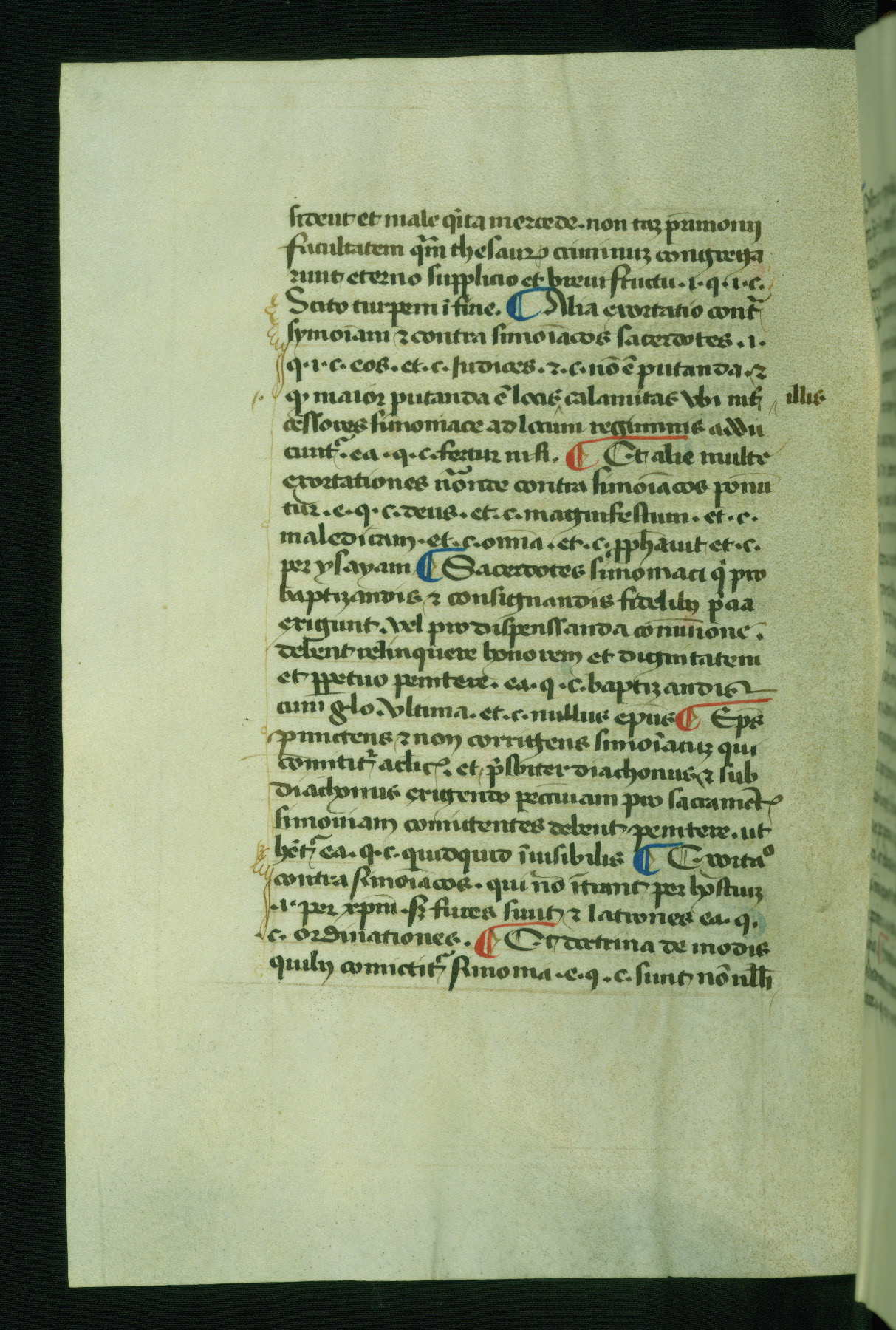 Alphonsus de Benavento wrote the treatise on penitential canons and acts of confession contained in this manuscript. The colophon informs us that Alphonsus was a professor of canon law at the university of Salmanca, Spain, and wrote this manuscript in 1456 in the nearby city of Tejares. At that time there was a pestilence in the city, for which Alphonsus asks for prayers. A historiated initial in which Alphonsus presents the treatise to a bishop begins the text, and the manuscript still retains its original stamped red leather binding.