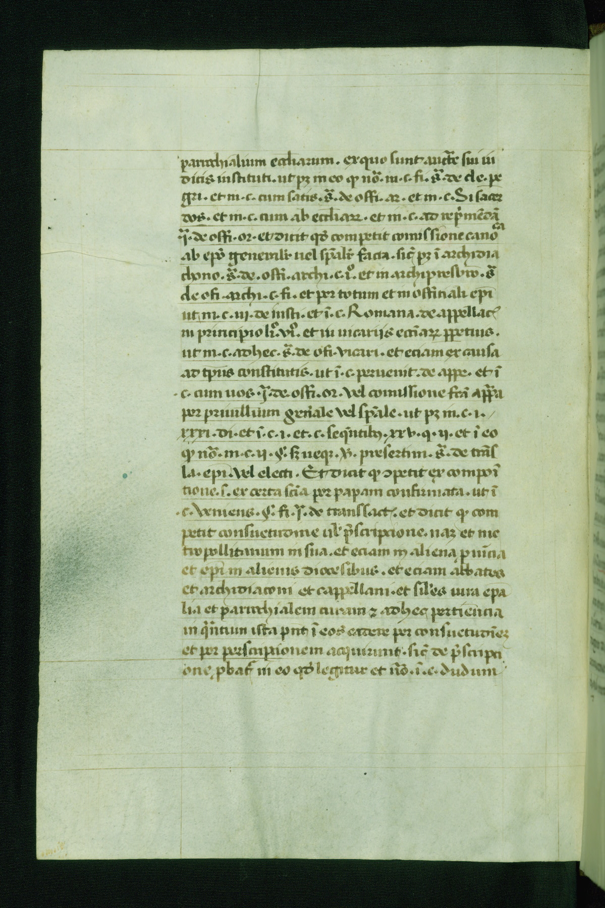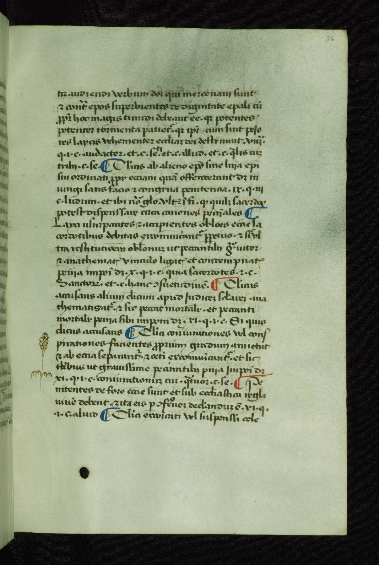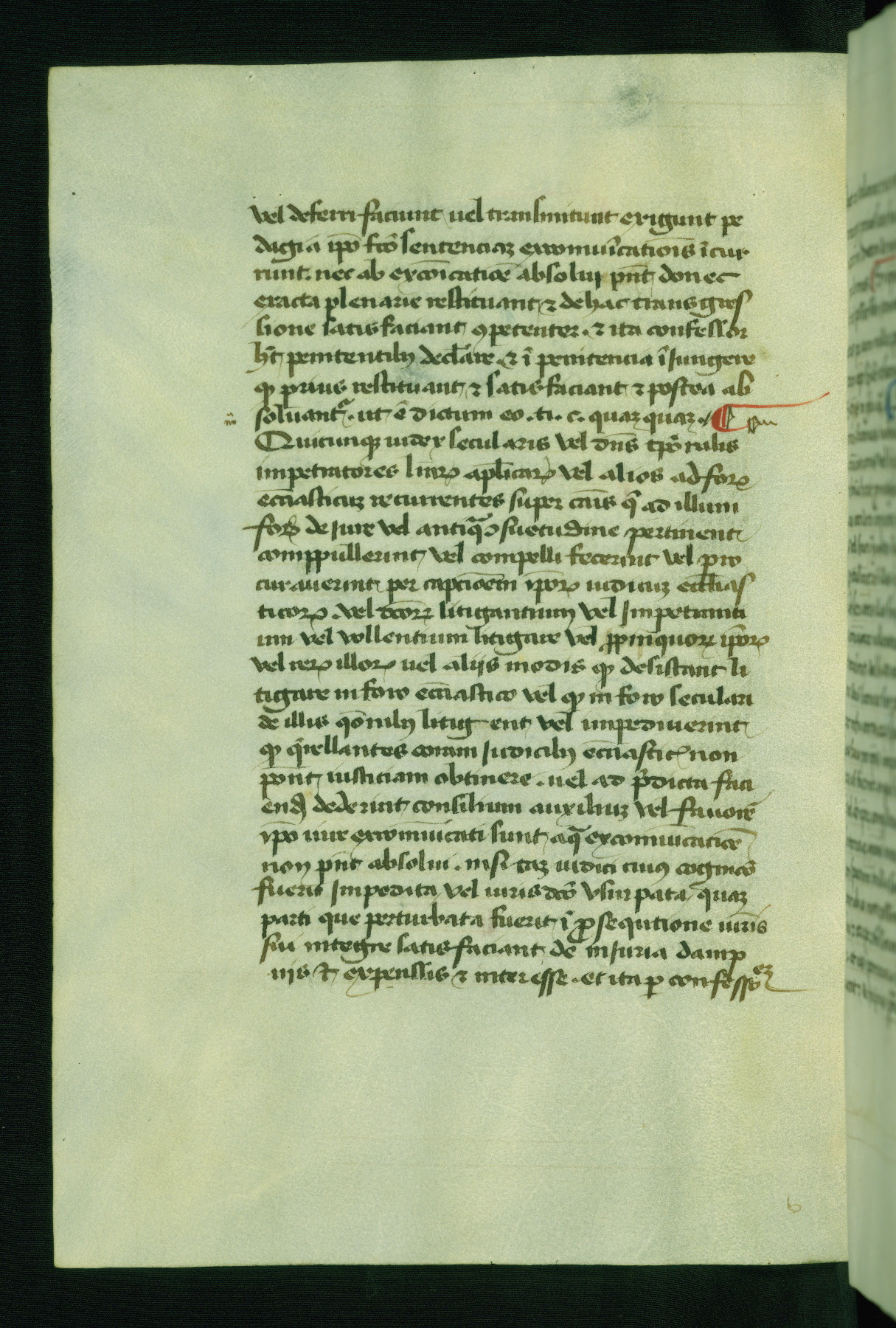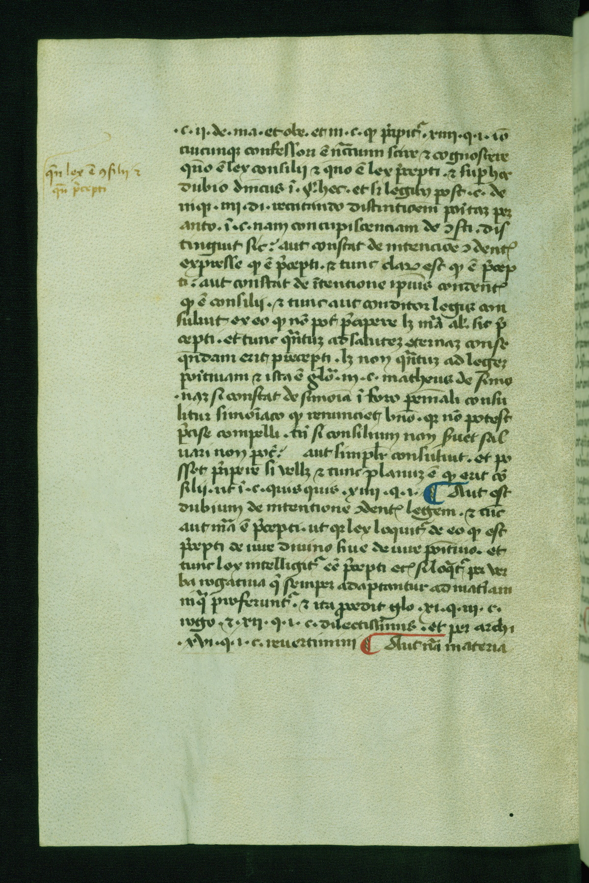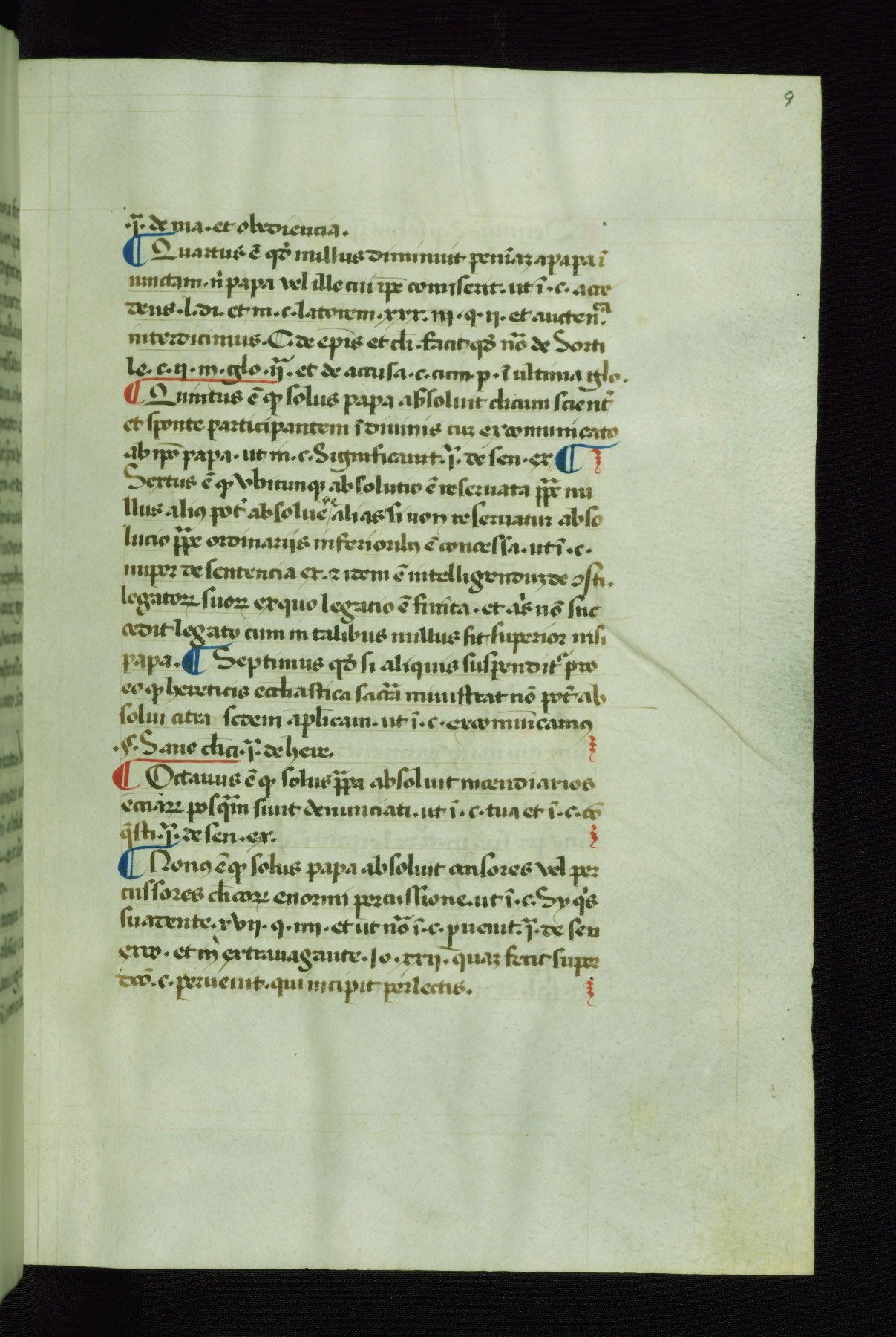 Alphonsus de Benavento wrote the treatise on penitential canons and acts of confession contained in this manuscript. The colophon informs us that Alphonsus was a professor of canon law at the university of Salmanca, Spain, and wrote this manuscript in 1456 in the nearby city of Tejares. At that time there was a pestilence in the city, for which Alphonsus asks for prayers. A historiated initial in which Alphonsus presents the treatise to a bishop begins the text, and the manuscript still retains its original stamped red leather binding.