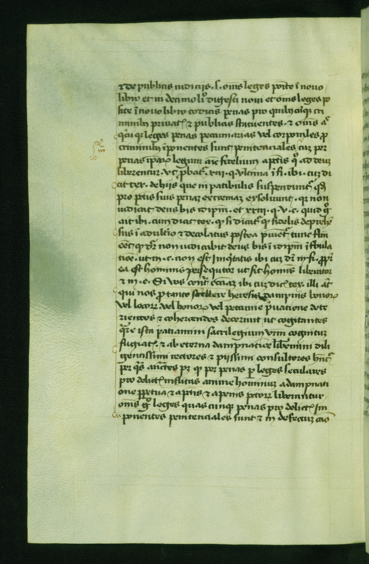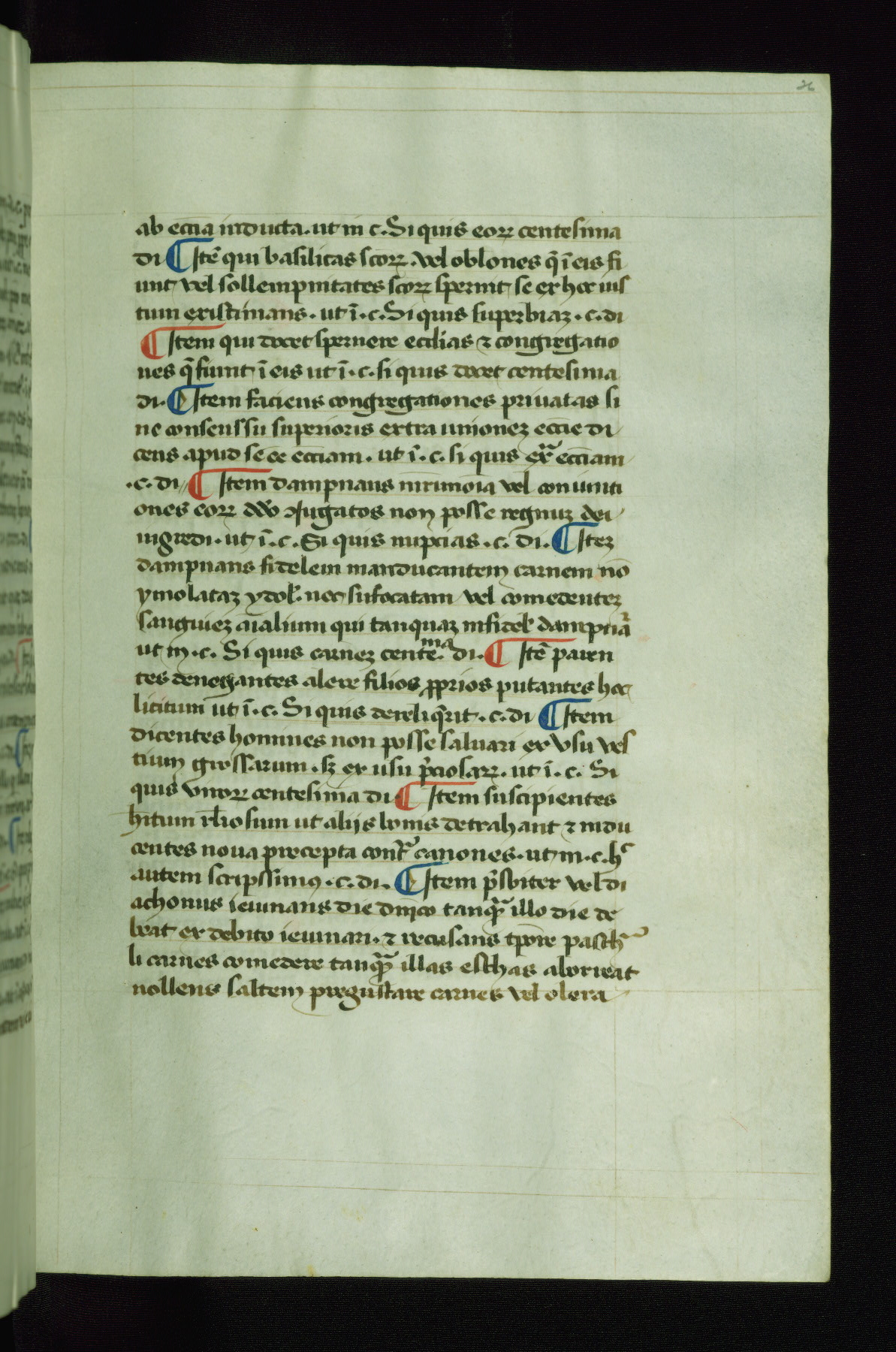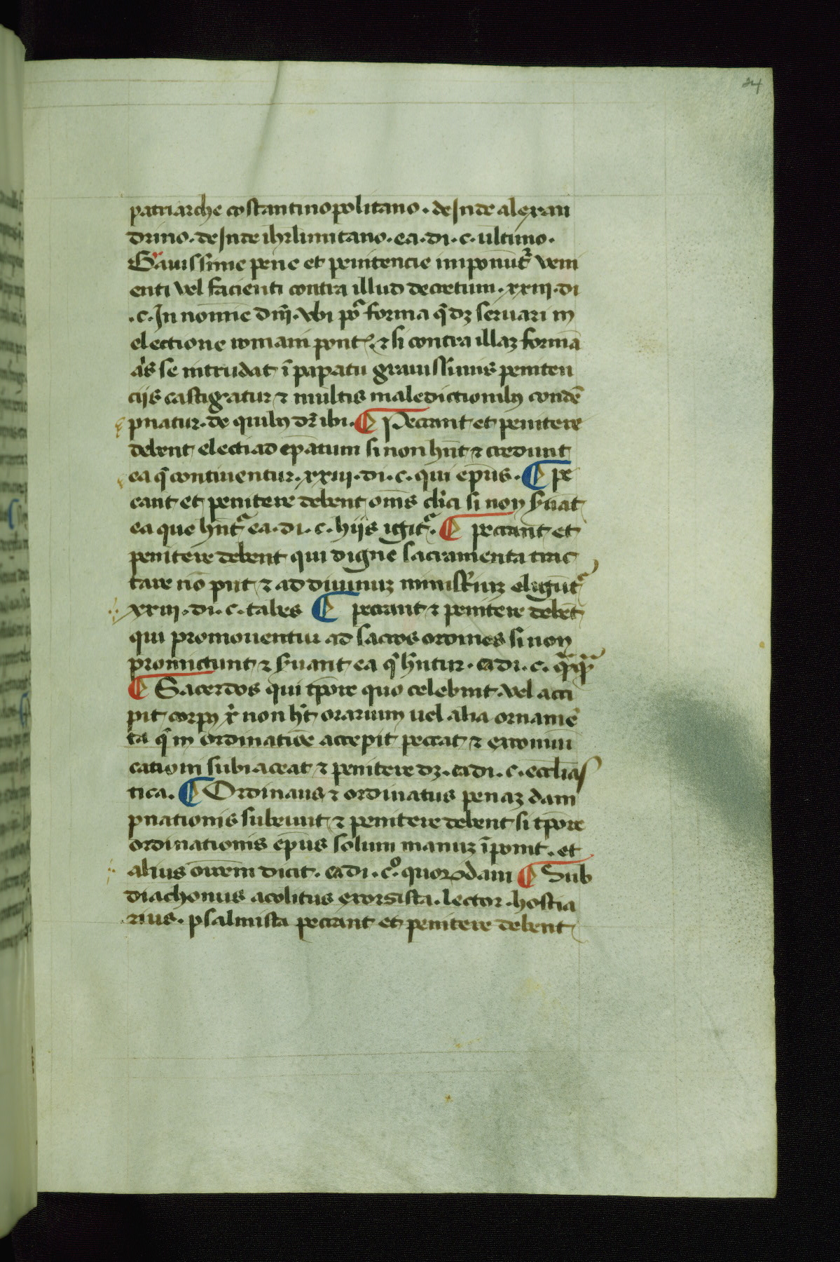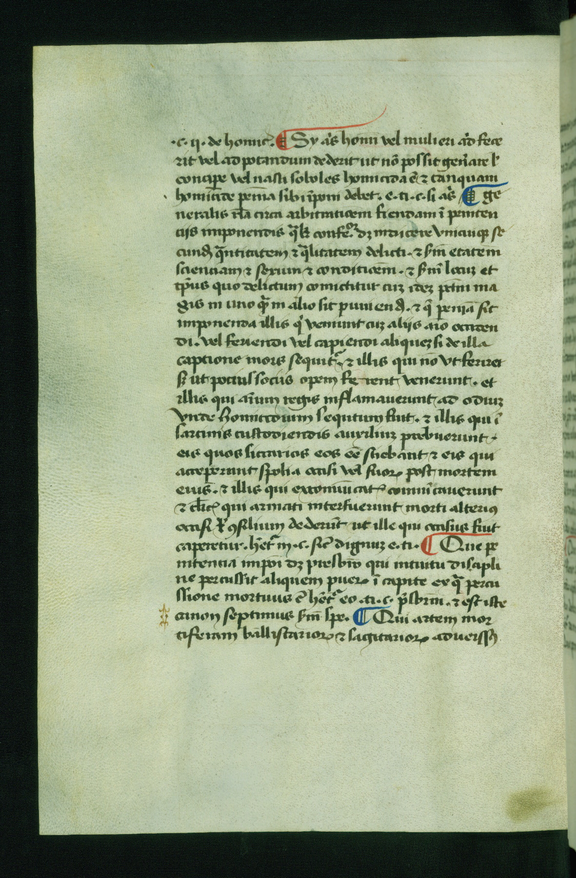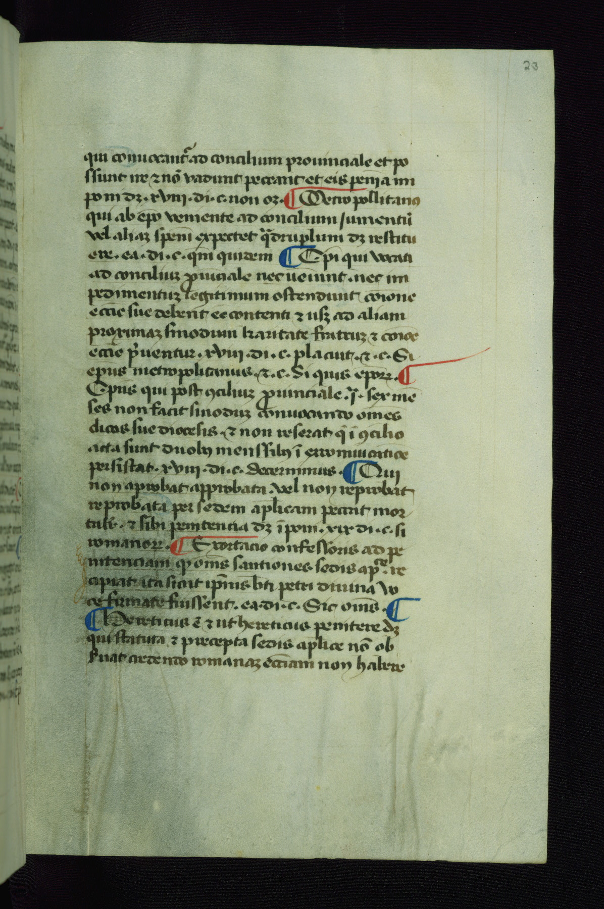 Alphonsus de Benavento wrote the treatise on penitential canons and acts of confession contained in this manuscript. The colophon informs us that Alphonsus was a professor of canon law at the university of Salmanca, Spain, and wrote this manuscript in 1456 in the nearby city of Tejares. At that time there was a pestilence in the city, for which Alphonsus asks for prayers. A historiated initial in which Alphonsus presents the treatise to a bishop begins the text, and the manuscript still retains its original stamped red leather binding.