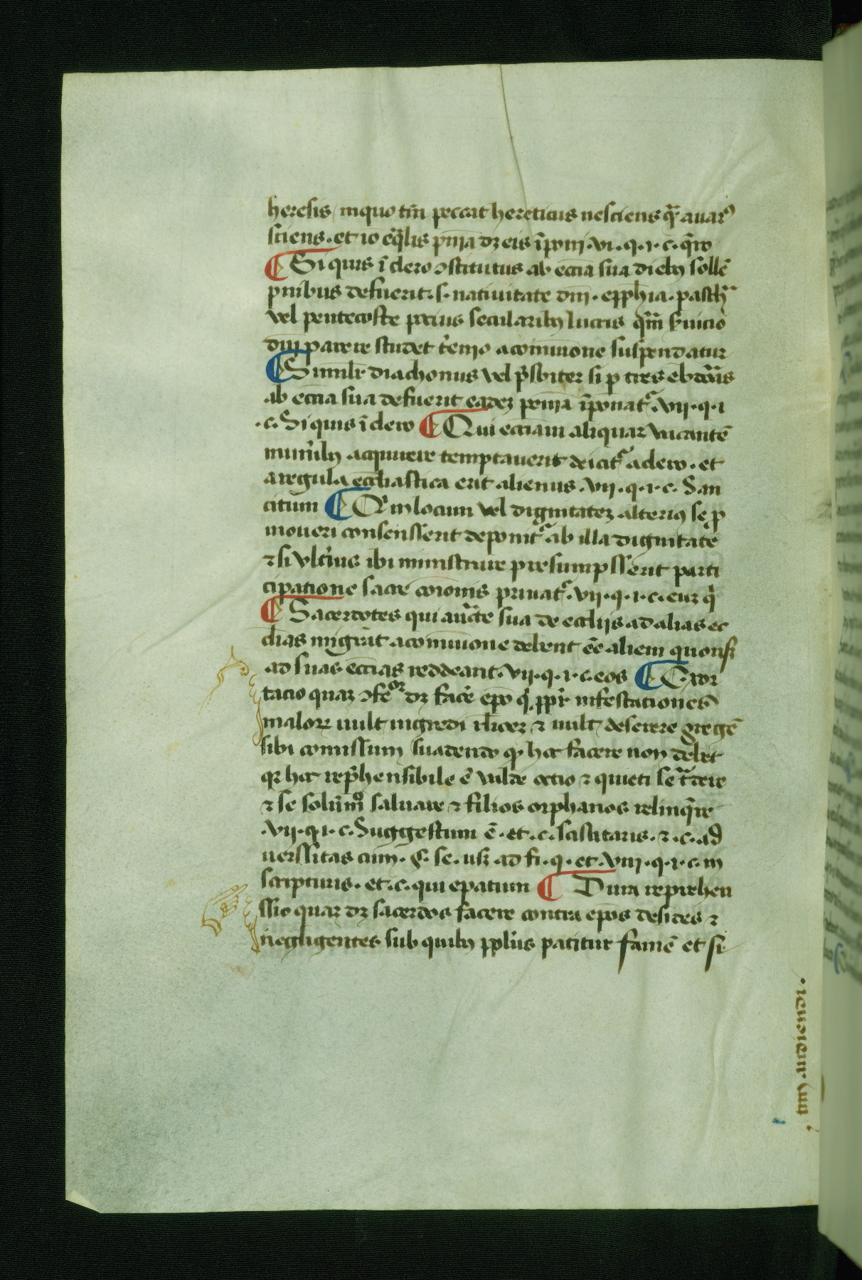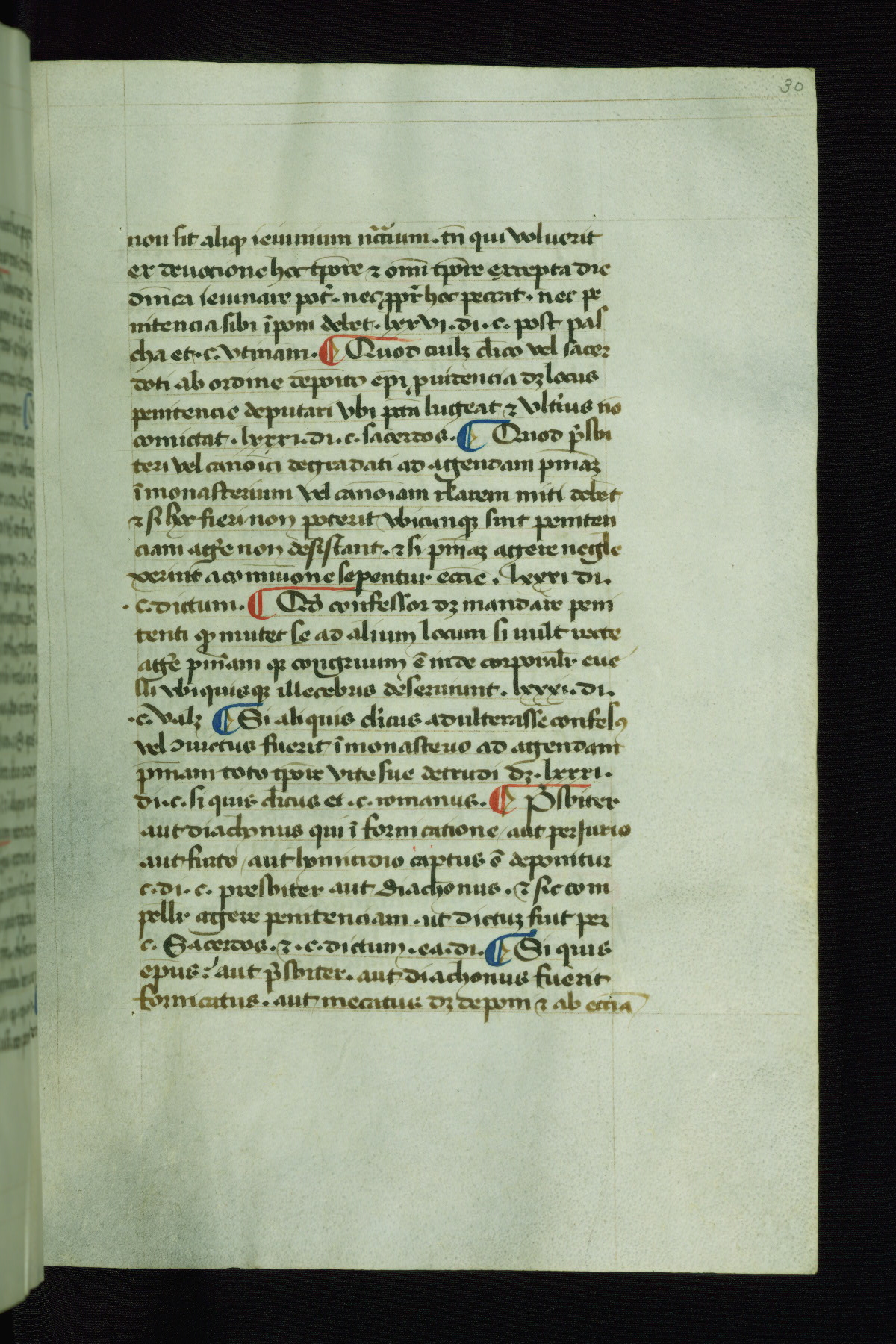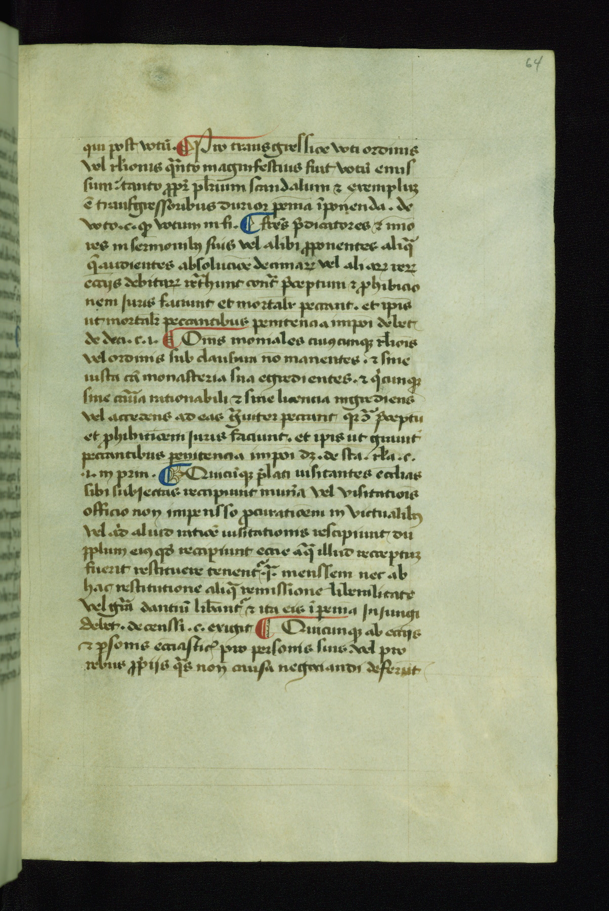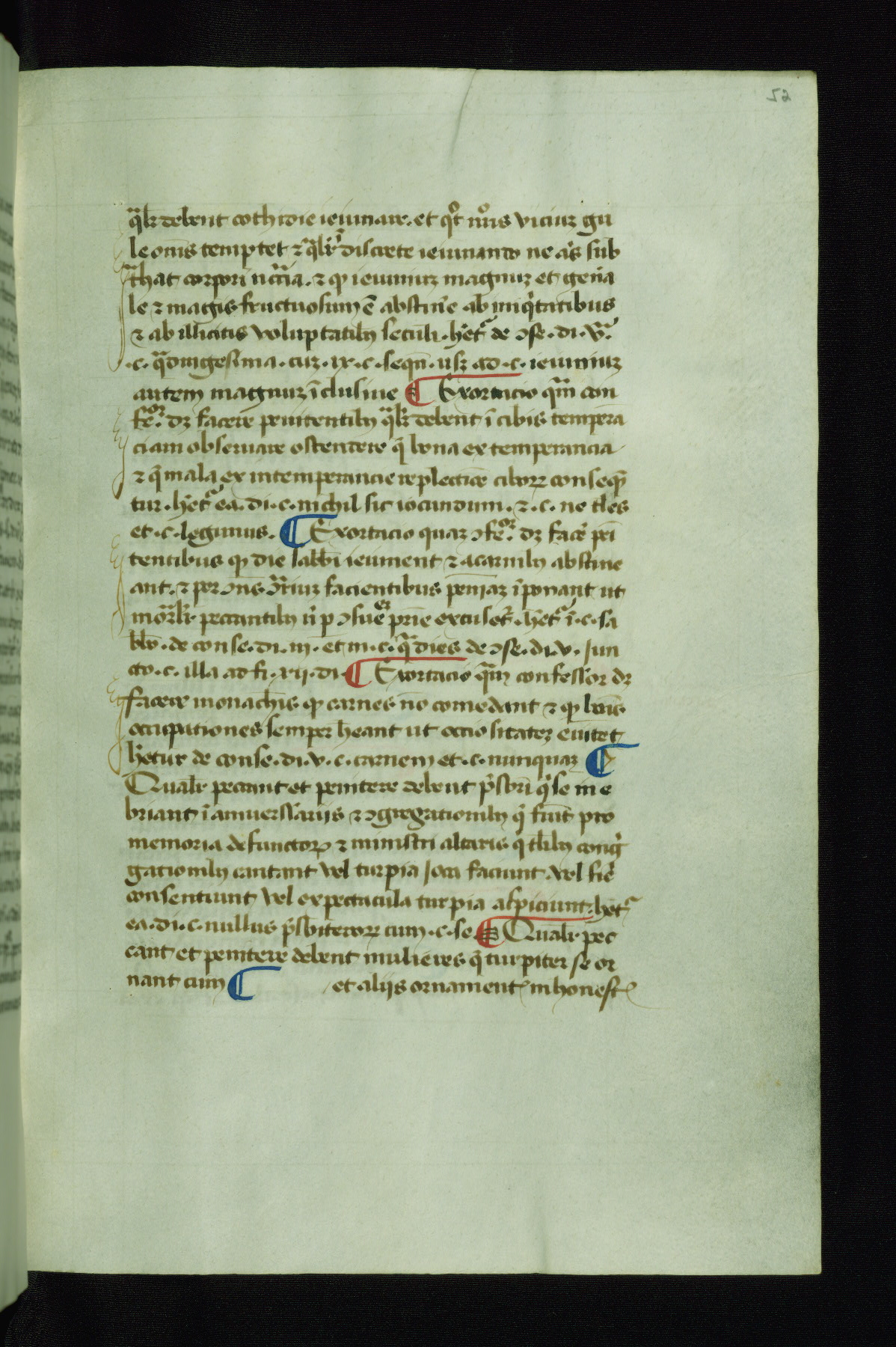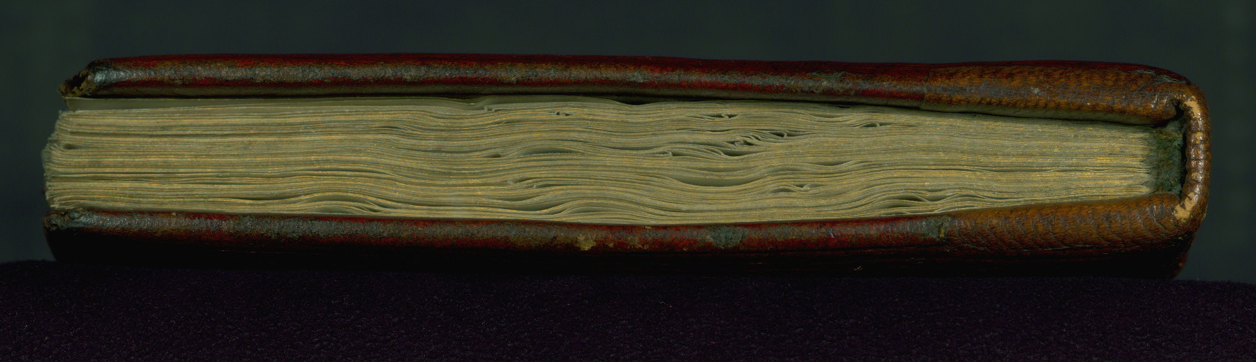 Alphonsus de Benavento wrote the treatise on penitential canons and acts of confession contained in this manuscript. The colophon informs us that Alphonsus was a professor of canon law at the university of Salmanca, Spain, and wrote this manuscript in 1456 in the nearby city of Tejares. At that time there was a pestilence in the city, for which Alphonsus asks for prayers. A historiated initial in which Alphonsus presents the treatise to a bishop begins the text, and the manuscript still retains its original stamped red leather binding.