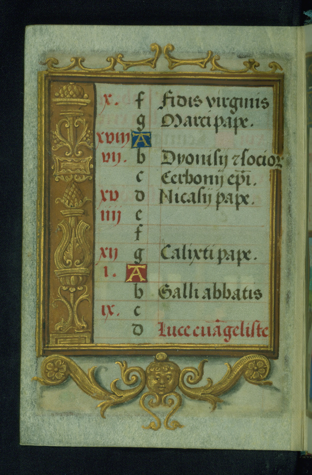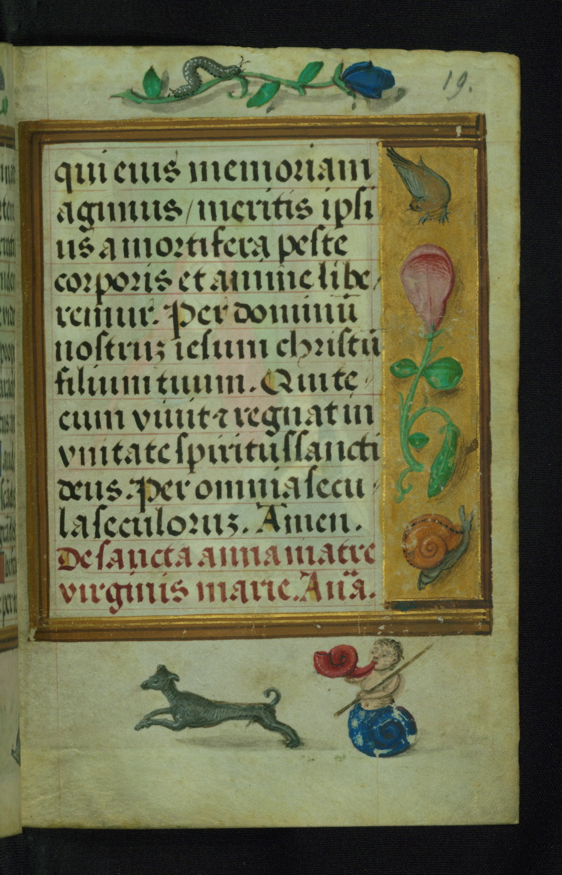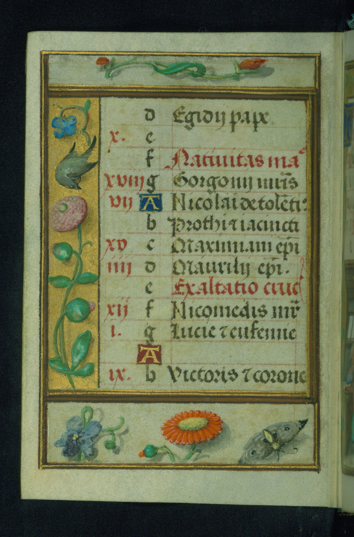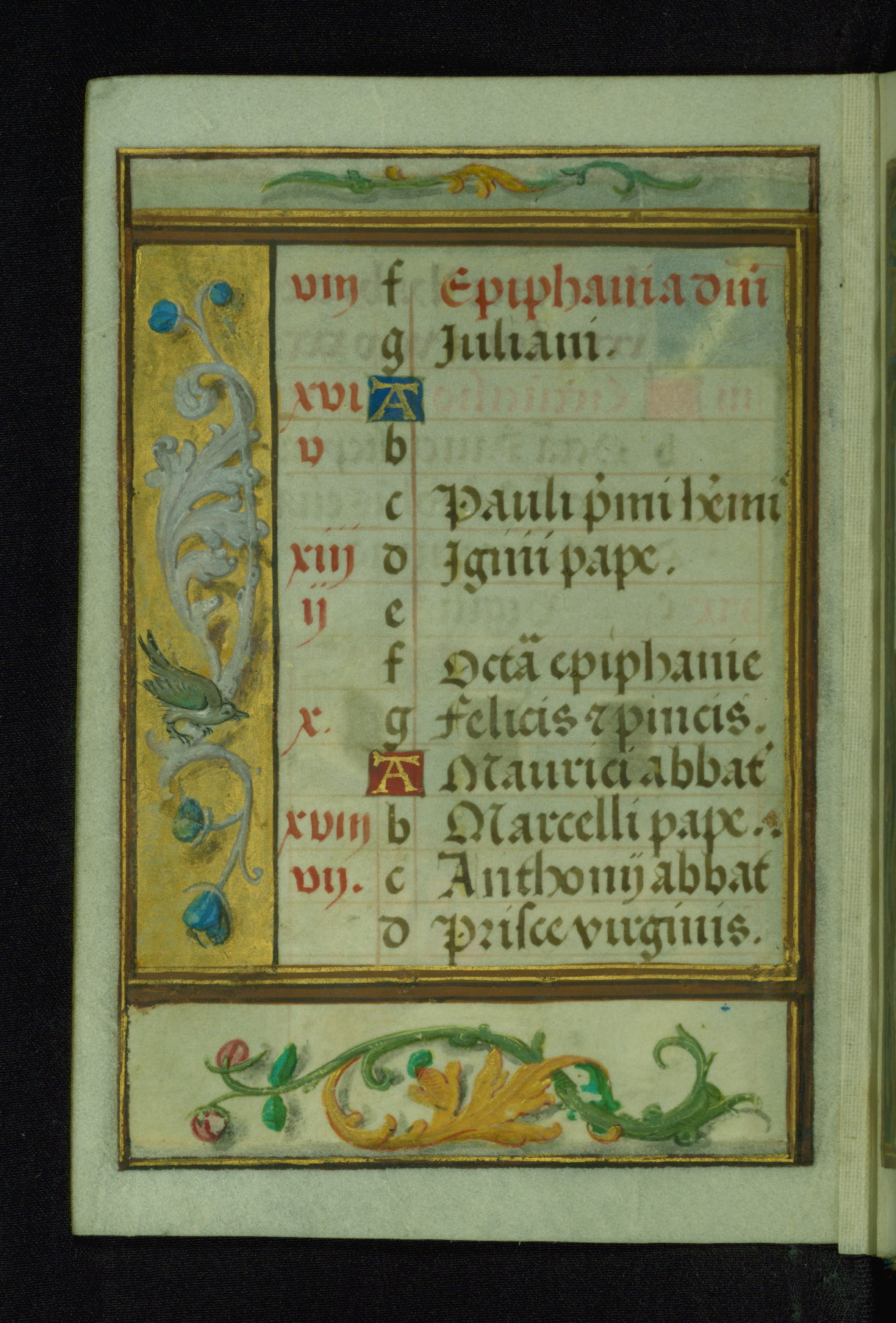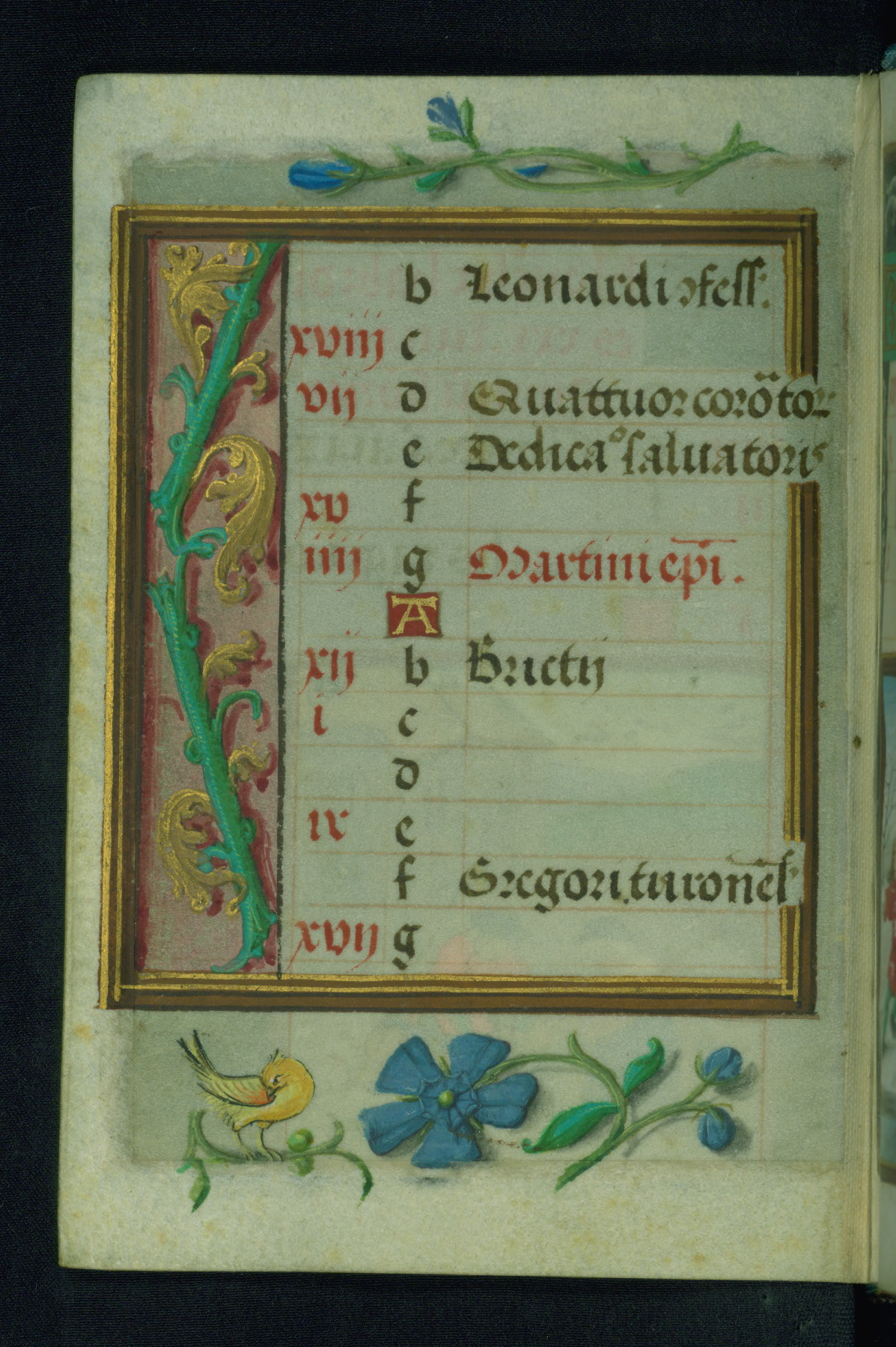 This Prayer Book was created ca. 1520-30, likely in Brussels, in the style of the Master of Charles V. It consists entirely of single folios that were added in or moved around in the book, rendering collation unfeasible. Many of intricate and high-quality miniatures were reproduced through chromolithography by Léon Gruel in his Petites Heures, published in Paris in 1875. The calendar is especially charming and features seasonally relevant illustrations, such as children having a snowball fight in December. The suffrages contain detailed and illusionistic figures, including one for St. Elizabeth of Hungary. The contents of the calendar suggest a Franciscan affinity.