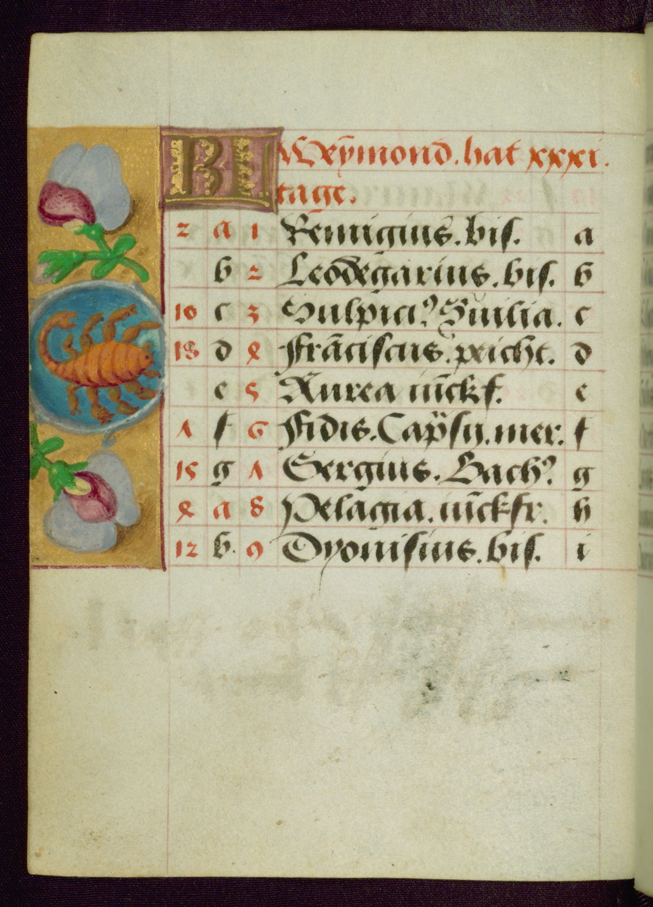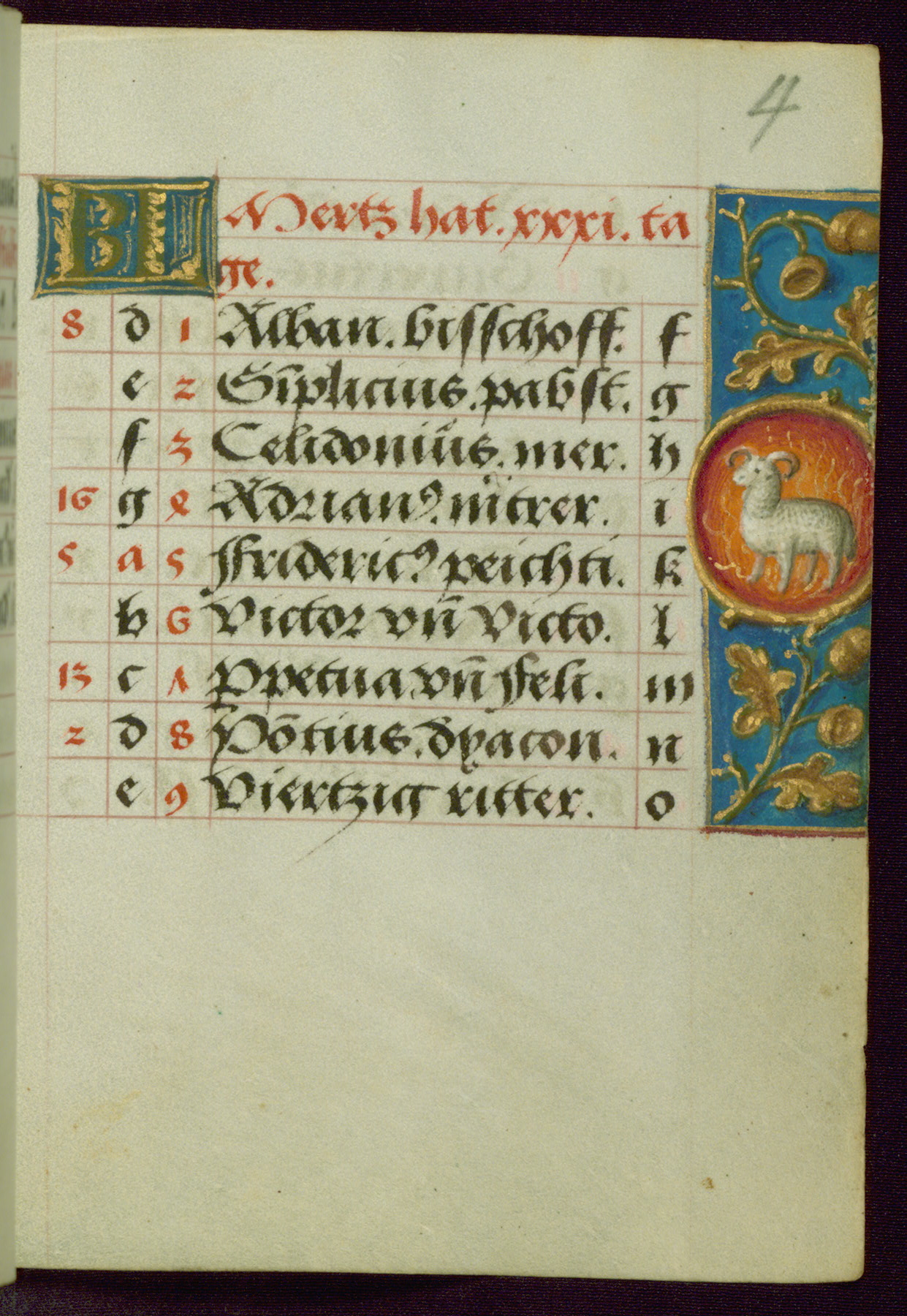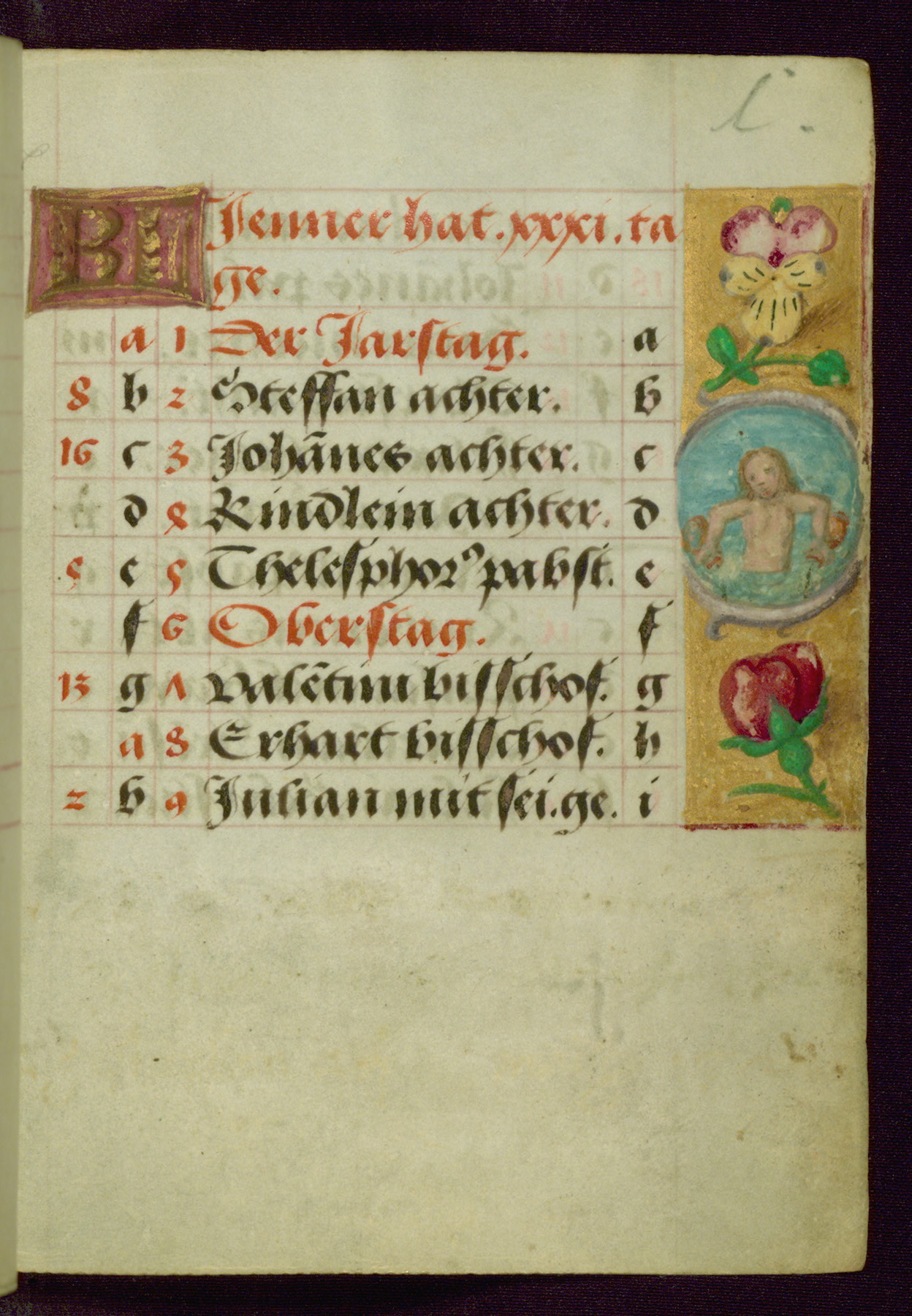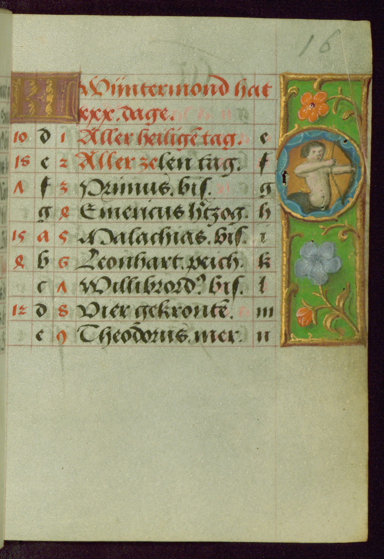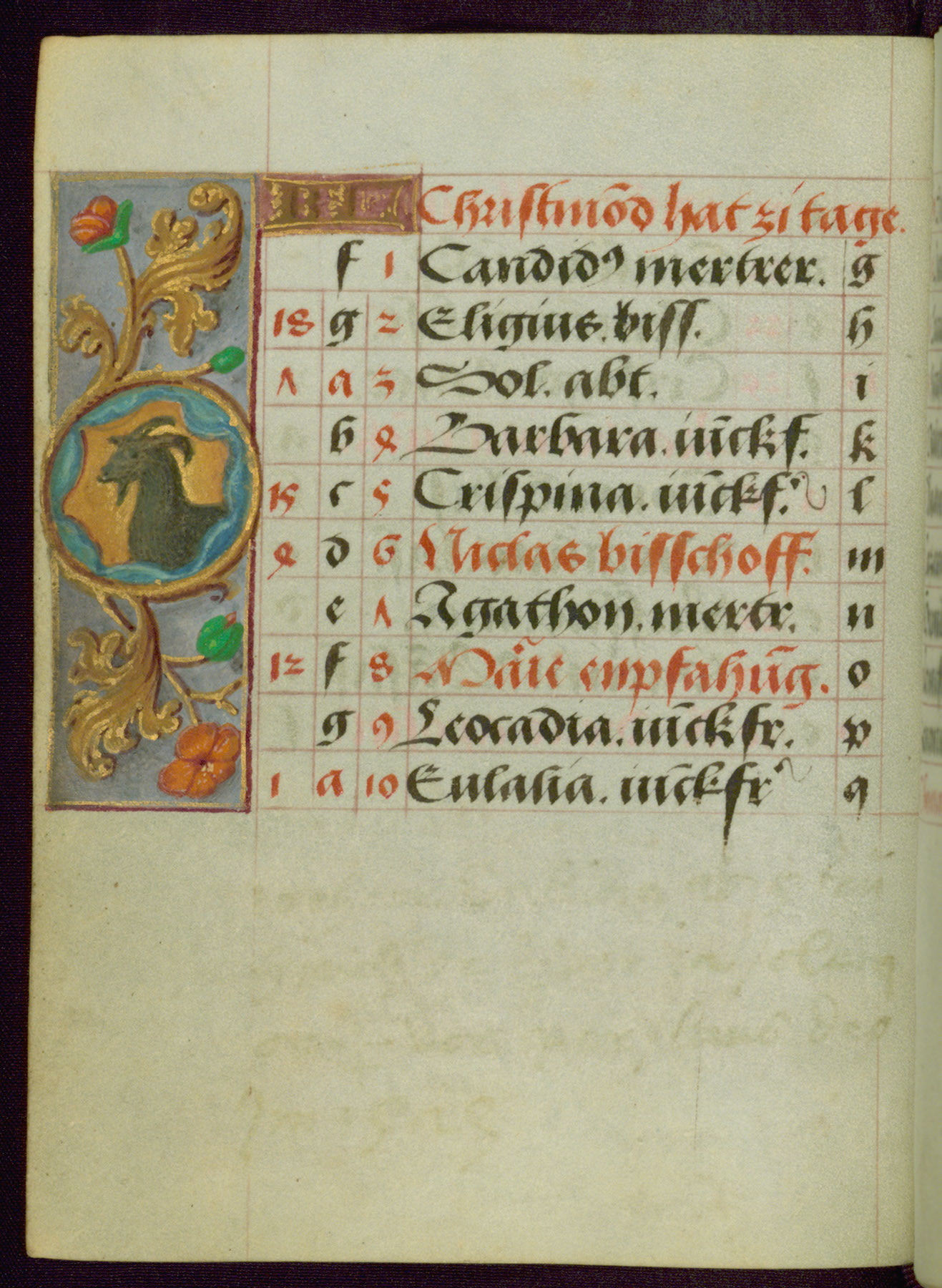 - Contents: Major feasts in German, graded in red and black; emphasis on German saints; diagrams and tables; prayers in Latin; saints' names as a rule in Latin with appended German designations, selection emphasizes Bamberg diocese; consecutive alphabets in outer column at right of feasts, keyed to computistic tables; contents indicate destination for a German owner, mixture of Netherlandish feasts, some dates irregular, feasts of note include: Telephorus (Jan. 5, "Thelephorus pabst.," Hamburg), John II (Jan. 11, "pabst.," regularly Jan. 12), Brigid (Feb. 1, "Birgitta iunckfraw.," cf. Jun. 1), Richard (Feb. 7, "Reichart konig"), Polichronius (Feb. 17, "politronus bis."), Frederic (Mar. 5, "peichti[ger]," bishop of Utrecht), Gumbert (Mar. 2, "ritter;" rich Franconian knight, Benedictine abbot; regularly Mar. 20, relics at Ansbach, Benedictine monastery, diocese of Würzburg), Henry (Mar. 13, "keyser;" king and emperor, d. 1024, Bamberg, etc., cf. Jul. 14), Zacharius (Mar. 14, "prophete."), Theodosia (Apr. 2; alternatively Apr. 1 and Apr. 3), Hegesippus (Apr. 7, "Egesipp[us]," no designation, Utrecht), Adalbert (Apr. 24, "adelbertus bis[scof]," regularly Mar. 23 or Mar. 25), William (May. 28, "hertzo[g]") Deochar (Jun. 7, "abt.," first abbot of Hasenrie [Herrieden] in Franconia), Henry (Jul. 14; Brandenburg, etc.; cf. Mar. 13), Afra (Aug. 7), Sebaldus (Aug. 19, Bamberg, etc.), Kunegundis (Sept. 9, "erhebung:' Translation, Bamberg; Franciscan tertiary, niece of St. Elizabeth of Hungary, d. 1279), Otto and Jerome (Sept. 30, no designations; Otto: bishop of Bamberg, died there in 1139), Maximilian (Oct. 12, bishop), Coloman (Oct. 13, d. 1012), Hedwig (Oct. 15, "erwelt," d. 1243), Cordula (Oct. 22, no designation), Radegundis (Oct. 24, "koni[gin];" feast regularly Aug. 13),Emeric (Nov. 4, "hertzog," d. 1031; Bamberg), Livin (Nov. 12, "Leuinus biss.," bishop, Flanders, relics brought to Ghent 1007), Conrad (Nov. 26, bishop of Constance), Sola (Dec. 3, "abt.," abbot, Eichstädt, Fulda), Agatho (Dec. 7, "mertr," martyr; pope in 678-81), Hermogenus (Dec. 12, "mer."), Theodosia (Dec. 22, Freising, Hamburg, Utrecht, etc.); added early on fol. 18v in left margin beside "Der christag": Anastasia (Dec. 25); other entries in margins fully or partly effaced on fols. 1v, 9r, 17v, and 18r