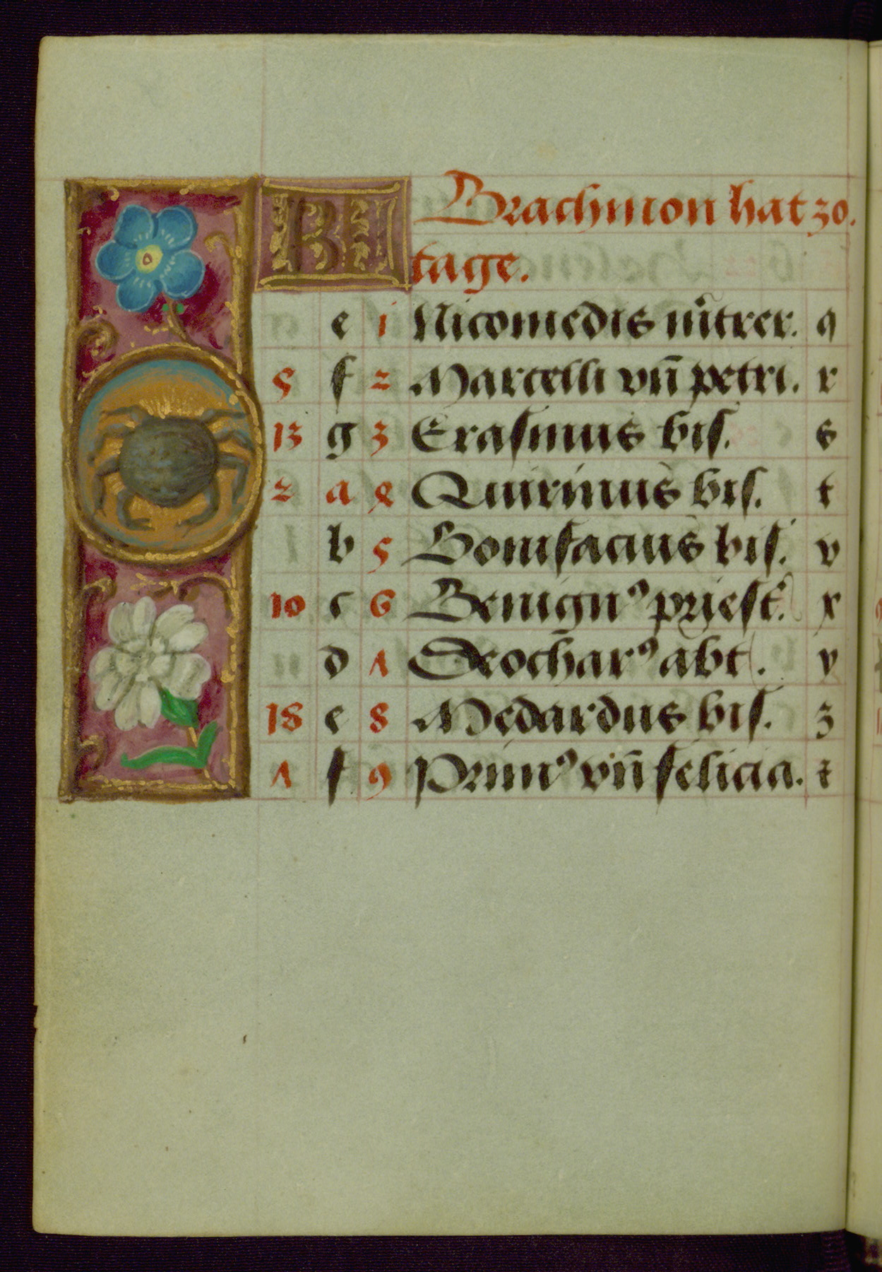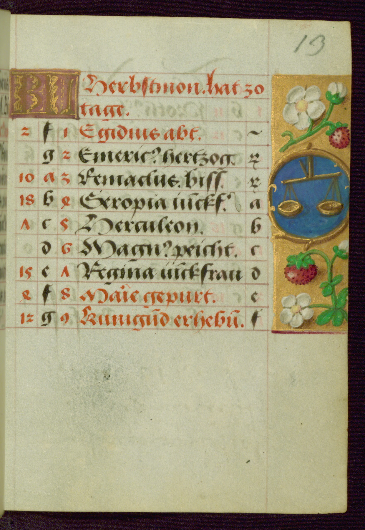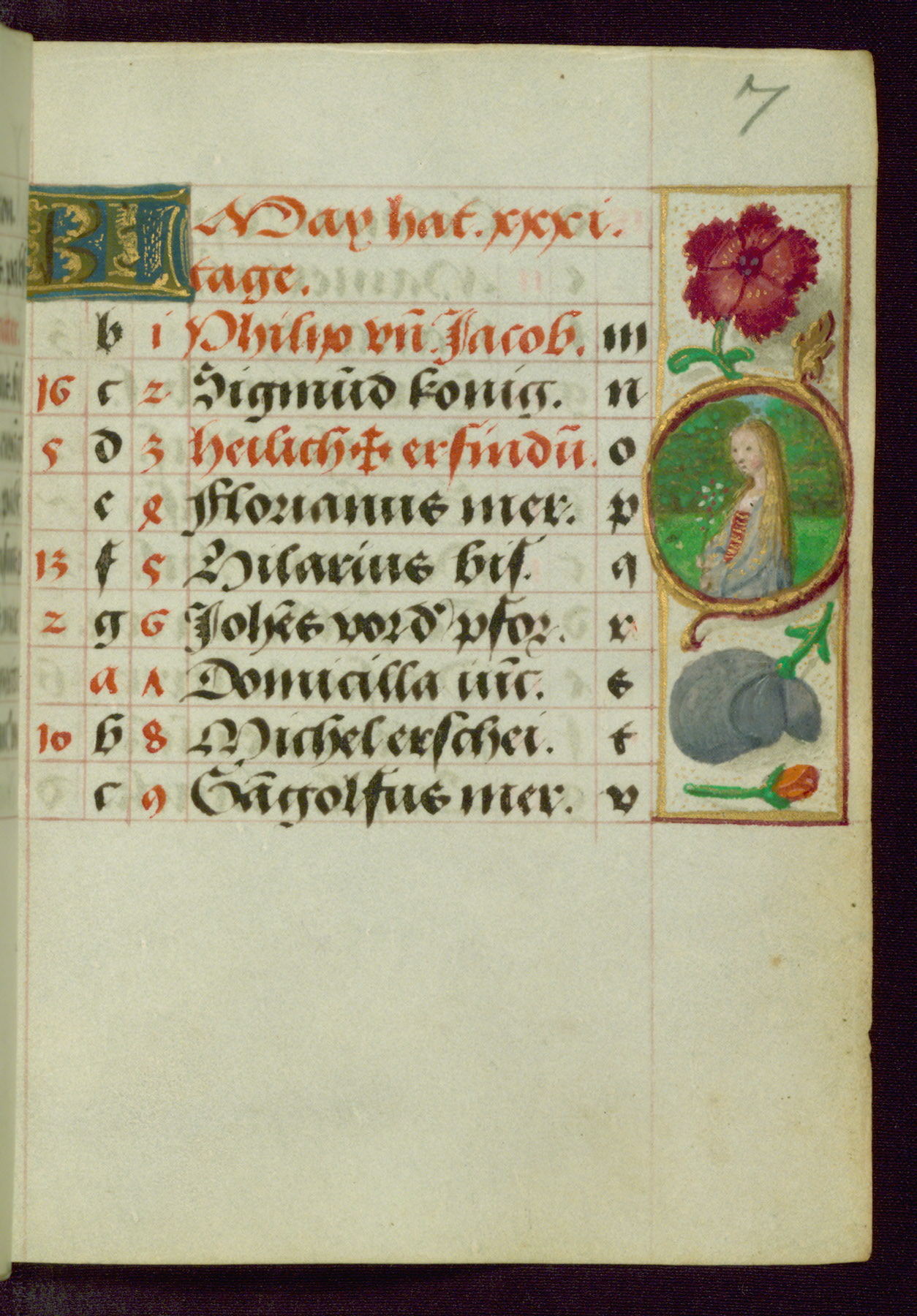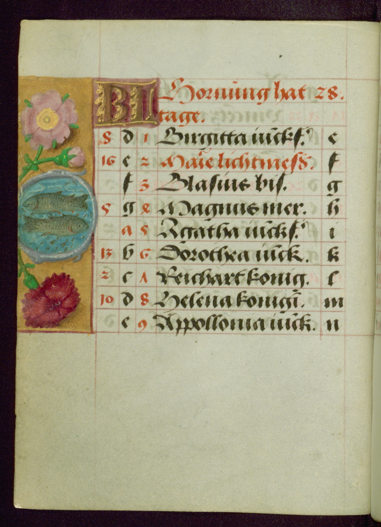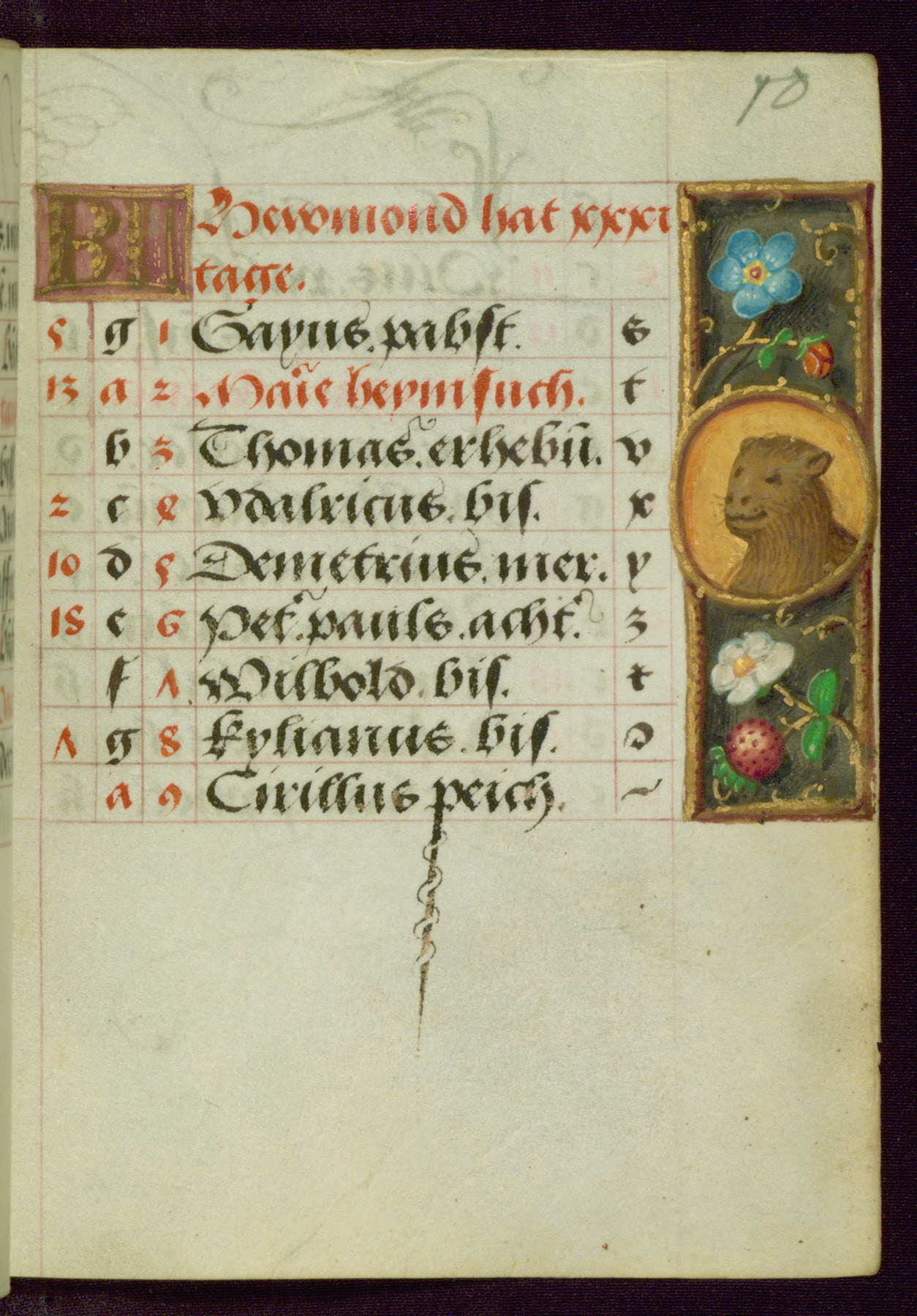 - Contents: Major feasts in German, graded in red and black; emphasis on German saints; diagrams and tables; prayers in Latin; saints' names as a rule in Latin with appended German designations, selection emphasizes Bamberg diocese; consecutive alphabets in outer column at right of feasts, keyed to computistic tables; contents indicate destination for a German owner, mixture of Netherlandish feasts, some dates irregular, feasts of note include: Telephorus (Jan. 5, "Thelephorus pabst.," Hamburg), John II (Jan. 11, "pabst.," regularly Jan. 12), Brigid (Feb. 1, "Birgitta iunckfraw.," cf. Jun. 1), Richard (Feb. 7, "Reichart konig"), Polichronius (Feb. 17, "politronus bis."), Frederic (Mar. 5, "peichti[ger]," bishop of Utrecht), Gumbert (Mar. 2, "ritter;" rich Franconian knight, Benedictine abbot; regularly Mar. 20, relics at Ansbach, Benedictine monastery, diocese of Würzburg), Henry (Mar. 13, "keyser;" king and emperor, d. 1024, Bamberg, etc., cf. Jul. 14), Zacharius (Mar. 14, "prophete."), Theodosia (Apr. 2; alternatively Apr. 1 and Apr. 3), Hegesippus (Apr. 7, "Egesipp[us]," no designation, Utrecht), Adalbert (Apr. 24, "adelbertus bis[scof]," regularly Mar. 23 or Mar. 25), William (May. 28, "hertzo[g]") Deochar (Jun. 7, "abt.," first abbot of Hasenrie [Herrieden] in Franconia), Henry (Jul. 14; Brandenburg, etc.; cf. Mar. 13), Afra (Aug. 7), Sebaldus (Aug. 19, Bamberg, etc.), Kunegundis (Sept. 9, "erhebung:' Translation, Bamberg; Franciscan tertiary, niece of St. Elizabeth of Hungary, d. 1279), Otto and Jerome (Sept. 30, no designations; Otto: bishop of Bamberg, died there in 1139), Maximilian (Oct. 12, bishop), Coloman (Oct. 13, d. 1012), Hedwig (Oct. 15, "erwelt," d. 1243), Cordula (Oct. 22, no designation), Radegundis (Oct. 24, "koni[gin];" feast regularly Aug. 13),Emeric (Nov. 4, "hertzog," d. 1031; Bamberg), Livin (Nov. 12, "Leuinus biss.," bishop, Flanders, relics brought to Ghent 1007), Conrad (Nov. 26, bishop of Constance), Sola (Dec. 3, "abt.," abbot, Eichstädt, Fulda), Agatho (Dec. 7, "mertr," martyr; pope in 678-81), Hermogenus (Dec. 12, "mer."), Theodosia (Dec. 22, Freising, Hamburg, Utrecht, etc.); added early on fol. 18v in left margin beside "Der christag": Anastasia (Dec. 25); other entries in margins fully or partly effaced on fols. 1v, 9r, 17v, and 18r