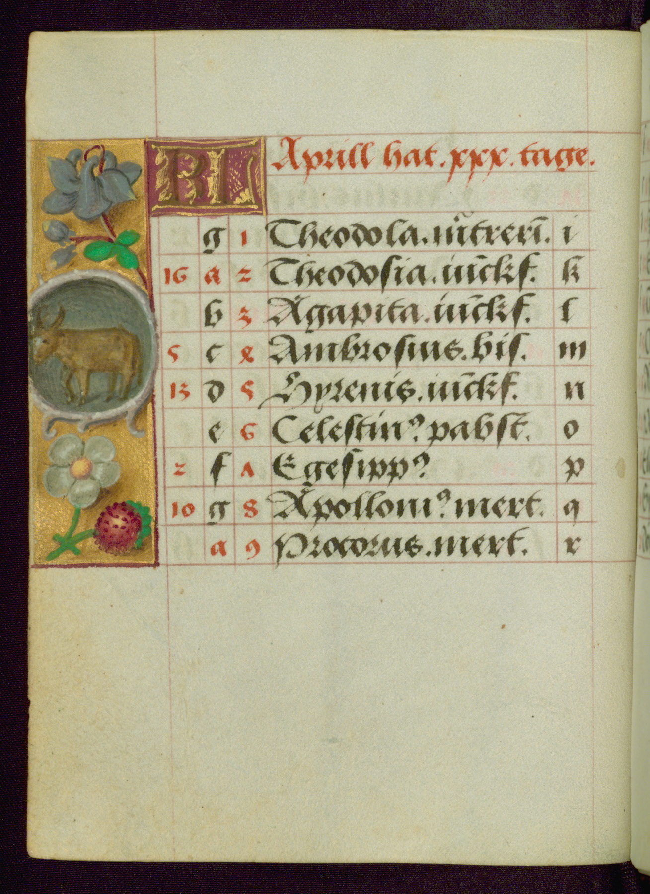 - Decoration note: Calendar illustrations include zodiacal signs, interchanged for May and August; illustrations on right fore-edge for months beginning on the recto of a folio, illustrations on left fore-edge for months beginning on the verso of a folio