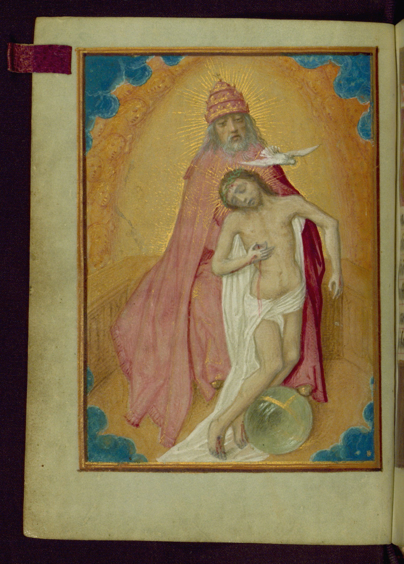 French(?), ca. nineteenth century; violet velvet; sewn on three cords, spine rounded and backed, hollow; modern endbands in yellow and green silk; gilt edges, gauffered after cropping, pointiellé single and double linear frame design; chiseled and ornate silver gilt furnishings, central medallion and corner-guards probably German, ca. second half of the sixteenth century; modern side plates in form of Pan-herms (head of the upper Pan-herm missing) and engraved fore-edge clasps with fret decoration hinged from lower cover; blue silk ribbon marker, leather fore-edge tabs; worn velvet case, violet in color, front flap with missing button, inside of case lined in kid