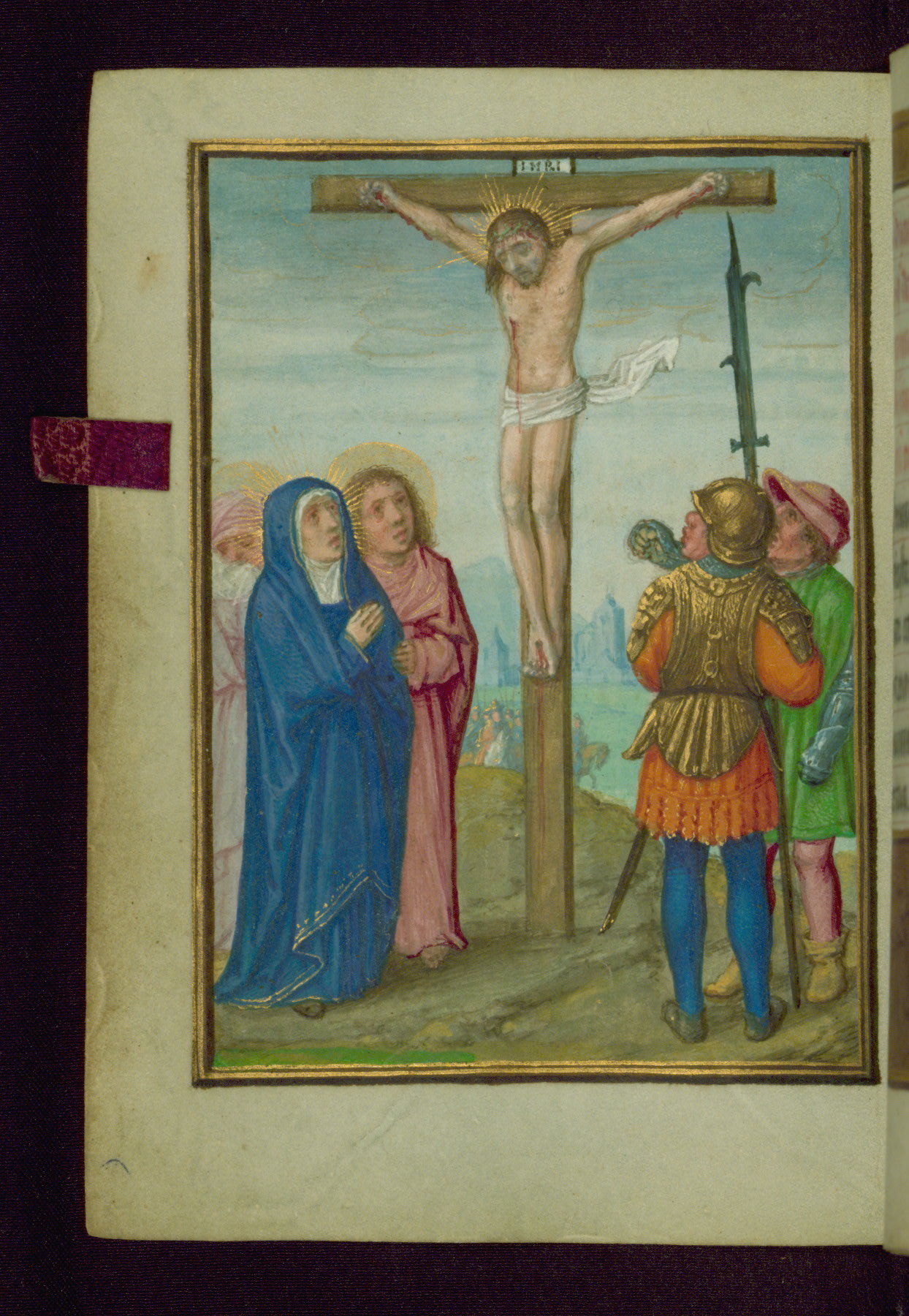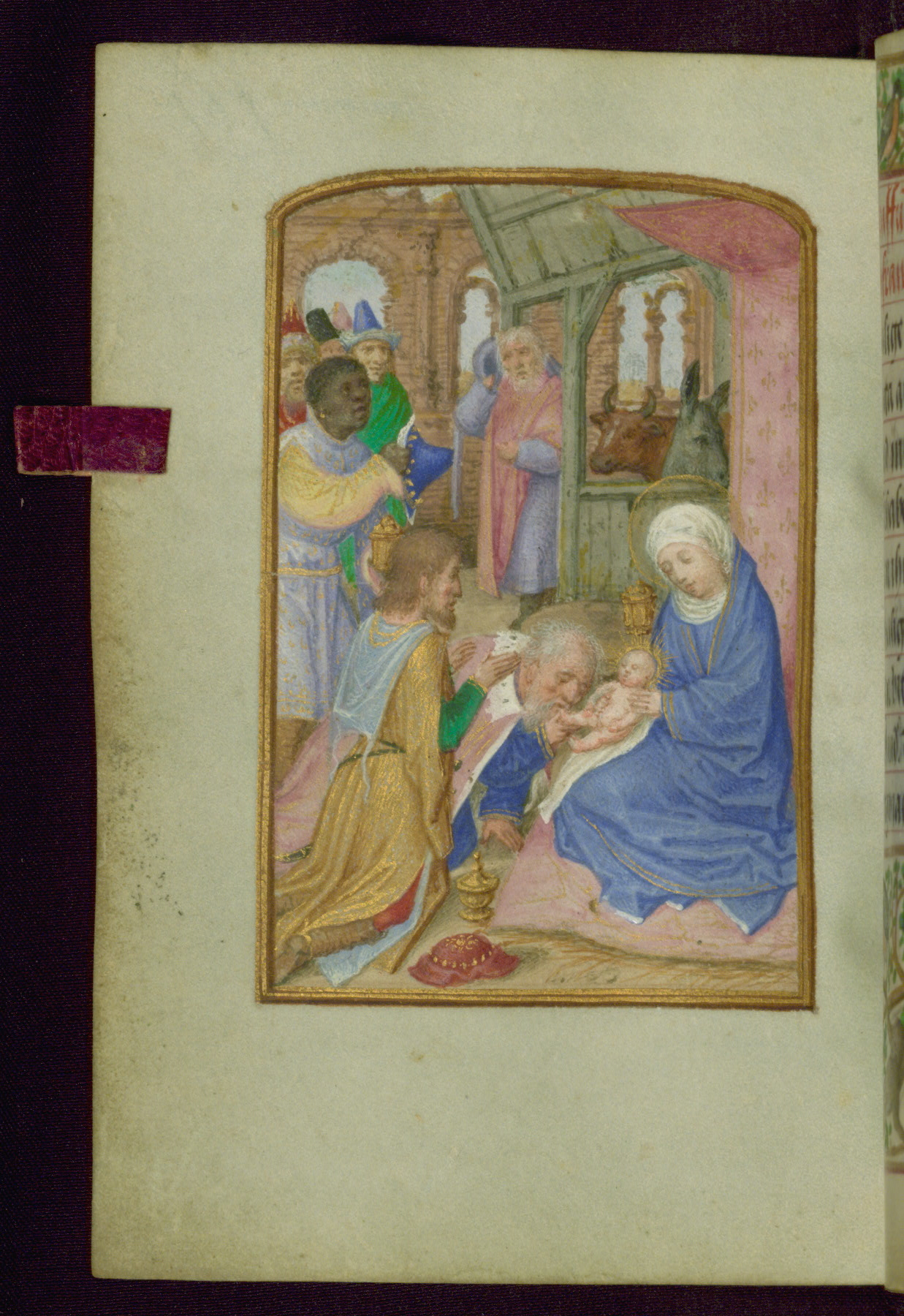 This Prayer Book, likely completed in Bruges ca. 1510-20, contains eight extant full-page miniatures, twelve calendar illustrations, and ten illuminated margins. The artistic style is similar to that of Simon Bening, but its relationship to him has not been firmly established. It is a small devotional text, sized to fit easily into the palm of the supplicant. The book is bound in violet velvet with ornate, chiseled silver-gilt furnishings and has a kid-lined violet velvet case for further protection and decoration. As for the devotional content of the Prayer Book, this manuscript is at first striking for its multilingual prayers; the text alternates between mostly German and Latin prayers, although the last section of the book, a part that remains unfinished, is written in French. Contents are indicative of an intended German owner, but there remain some Netherlandish feasts with irregular dates. Although diminutive in size, this manuscript is rich in content, heritage, and decoration.