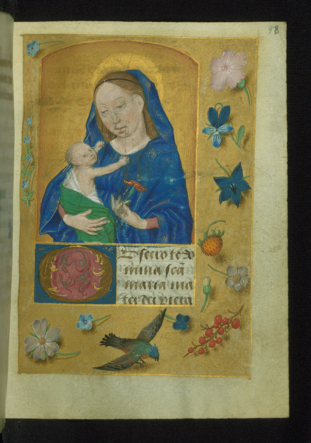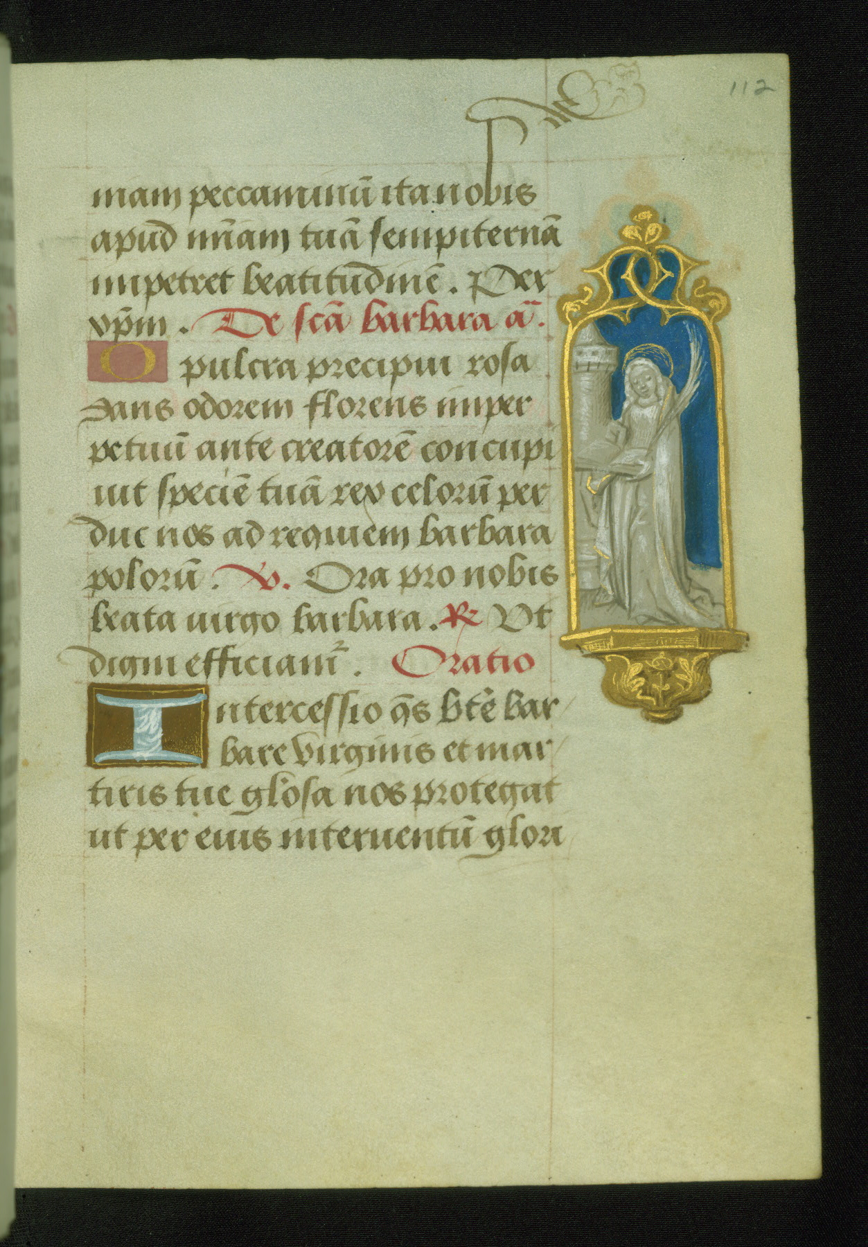 - Contents: Devotional sequence: fols. 98r-103r: Obsecro te; fols. 103r-105v: O intemerata; fols. 105v-114r: Suffrages, to the Holy Spirit and the Cross; eight single and one pair of male saints, namely, SS. Michael, John the Baptist, Peter and Paul, Christopher, Sebastian, Adrian, Anthony, Nicholas, and Quintinus; SS. Mary Magdalene and Barbara; a single suffrage to five male privileged saints, namely, Dionysius, George, Vincent, Blasius, and Aegydius; a single suffrage to five female privileged saints, namely, Catherine, Margaret, Martha, Christina, and Barbara
