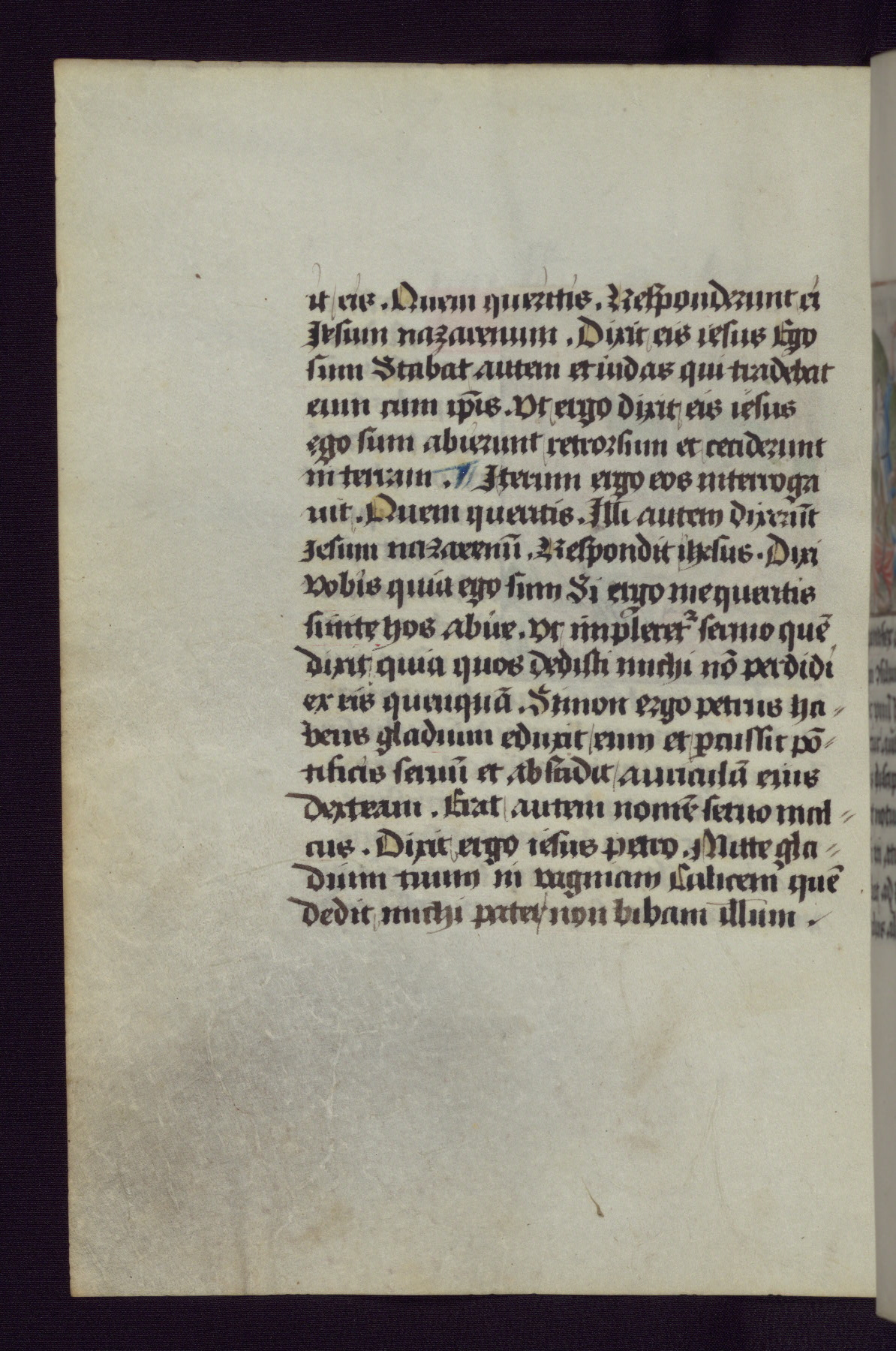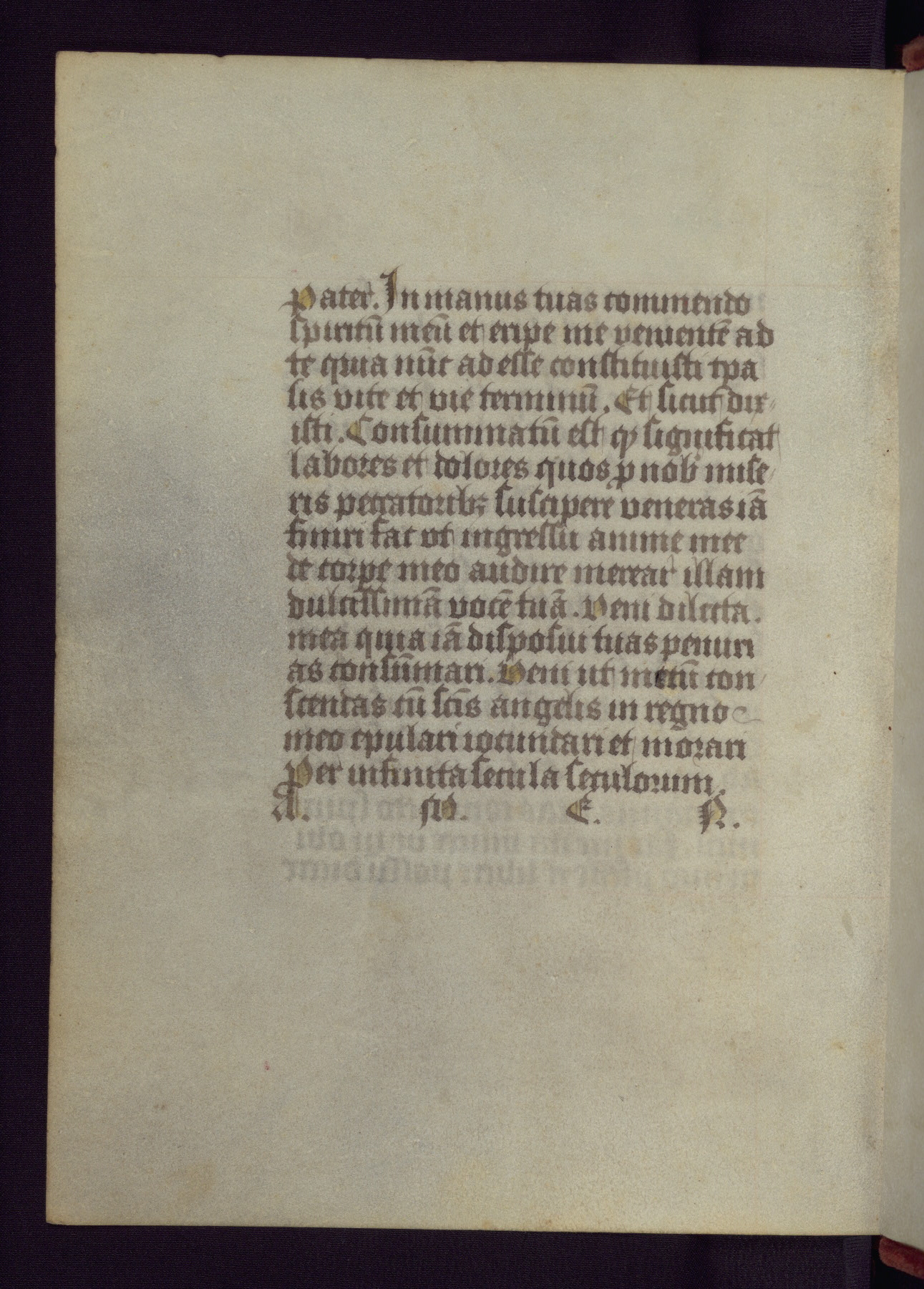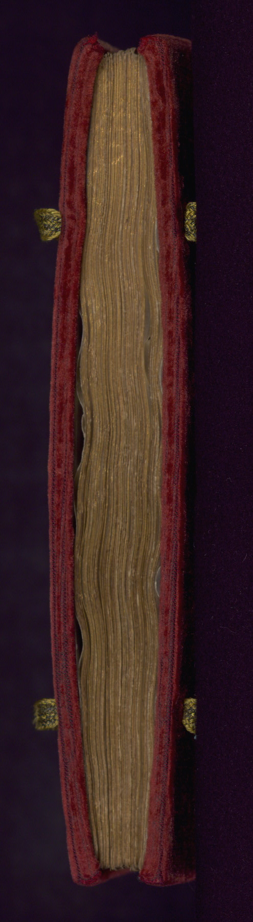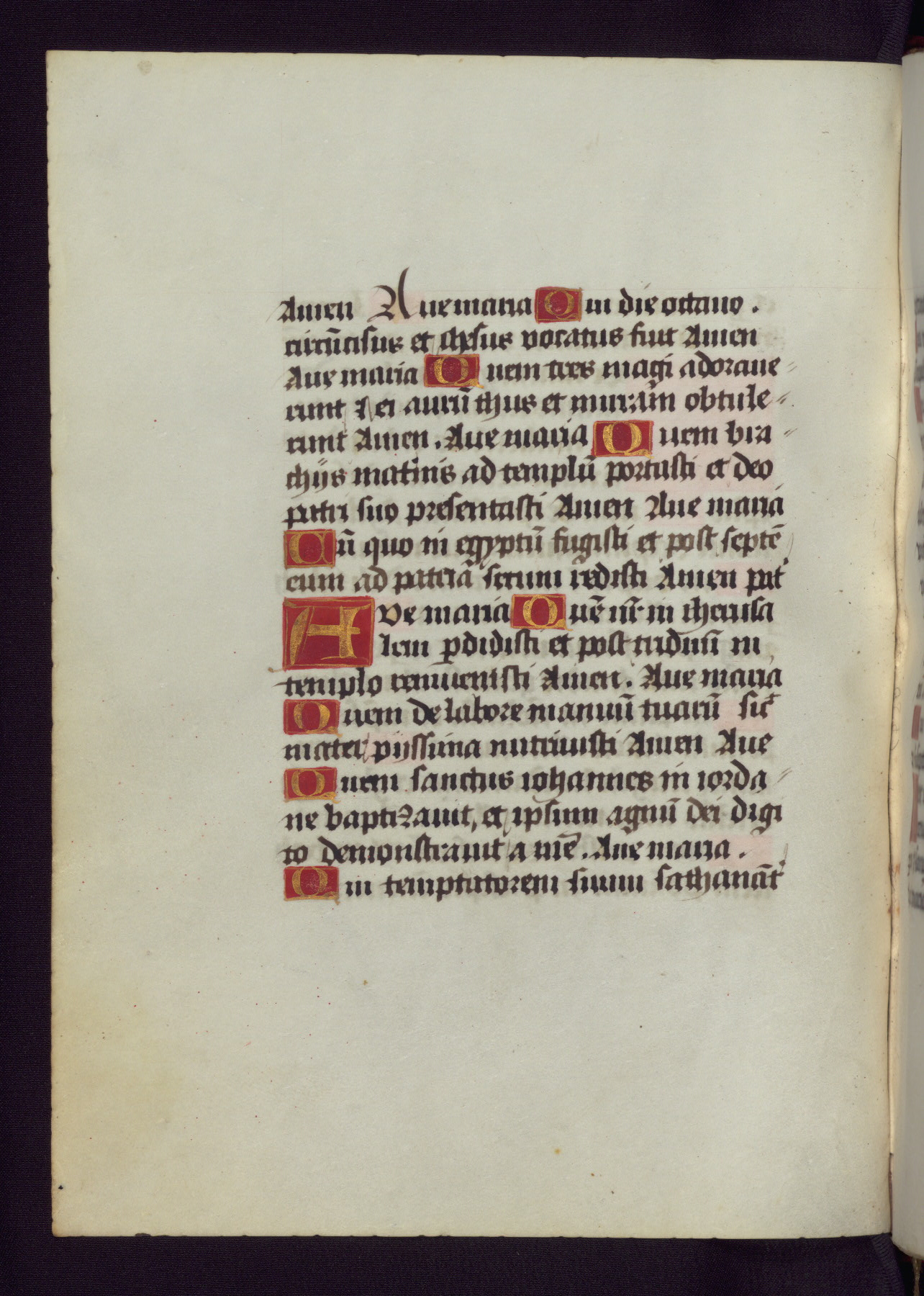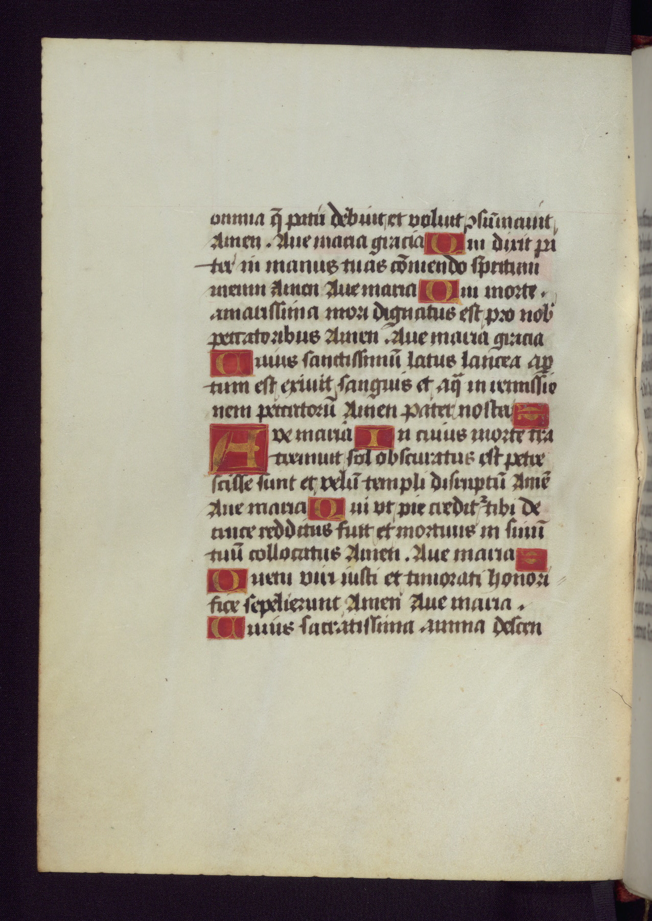 This early sixteenth-century illuminated prayer book contains Latin prayers and passages from the Gospels. Although small in scale, it is notable for its abundance of illuminations, with nearly sixty extant small miniatures. Full-color portraits embellish the prayers to the Virgin and Suffrages, while the images within the Gospel narrative are rendered primarily in grisaille, a nearly entirely gray monochrome technique. The last folios include a trompe-l'oeil foliate margin and a Crucifixion that seems to be a later addition. Throughout the book gold initials on red or blue grounds mark the beginning of the prayers.
