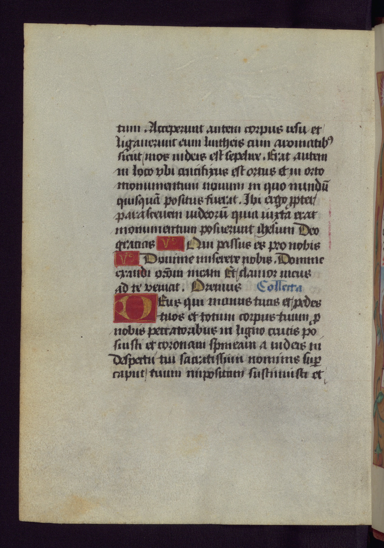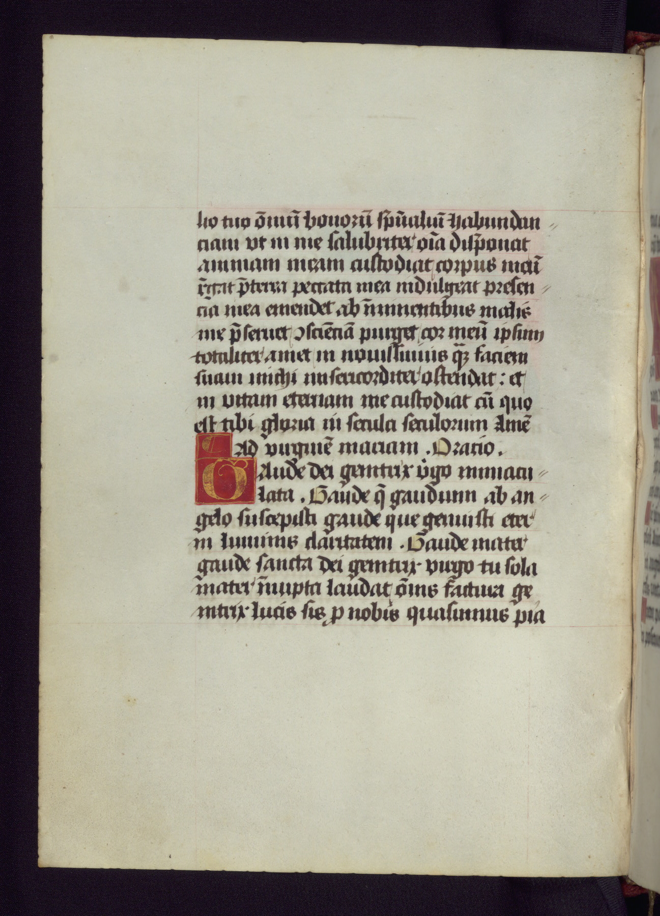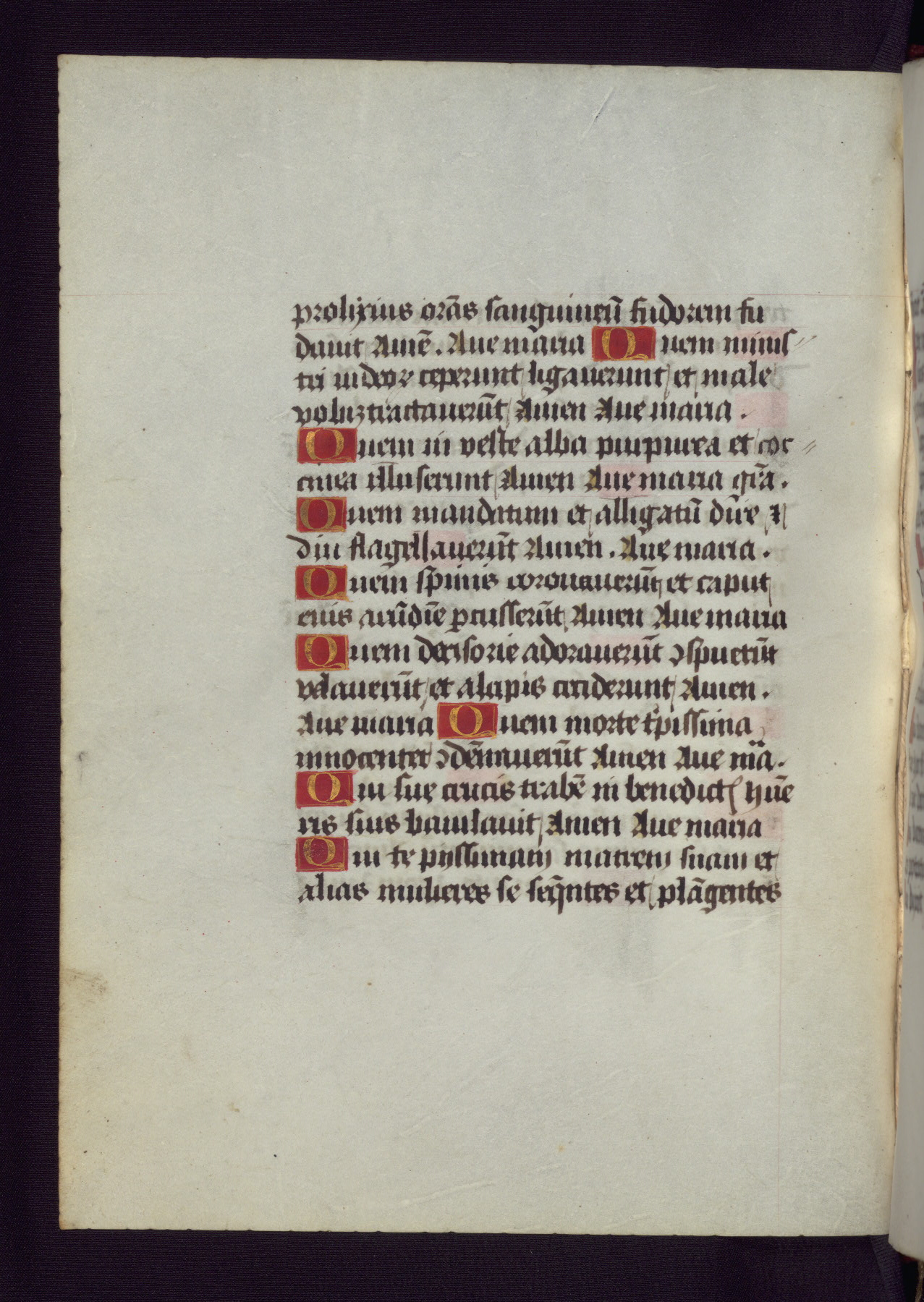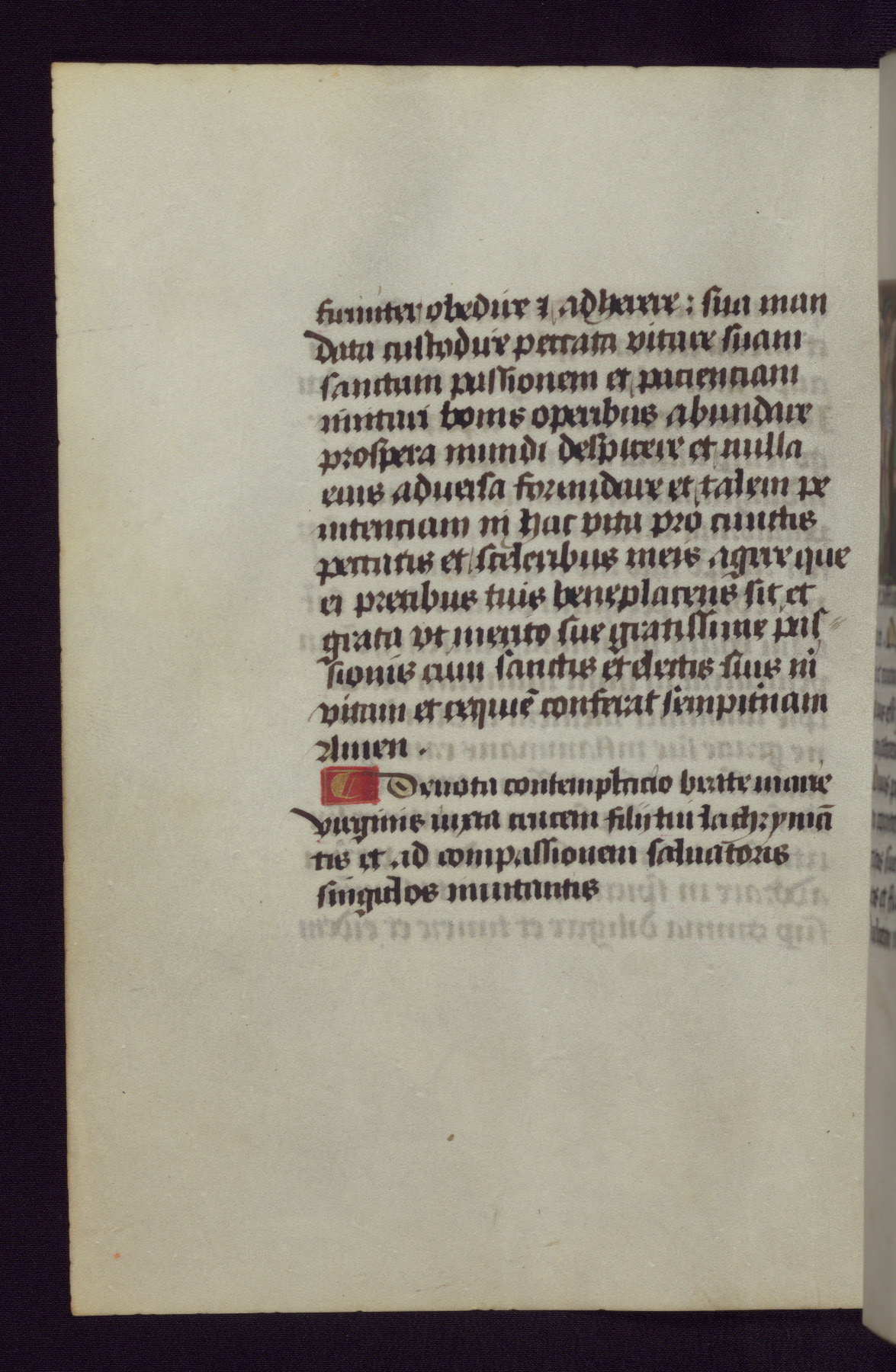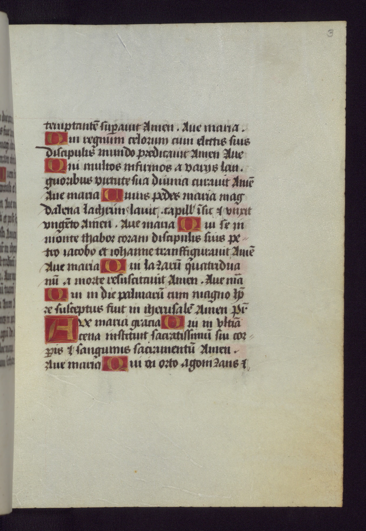 This early sixteenth-century illuminated prayer book contains Latin prayers and passages from the Gospels. Although small in scale, it is notable for its abundance of illuminations, with nearly sixty extant small miniatures. Full-color portraits embellish the prayers to the Virgin and Suffrages, while the images within the Gospel narrative are rendered primarily in grisaille, a nearly entirely gray monochrome technique. The last folios include a trompe-l'oeil foliate margin and a Crucifixion that seems to be a later addition. Throughout the book gold initials on red or blue grounds mark the beginning of the prayers.