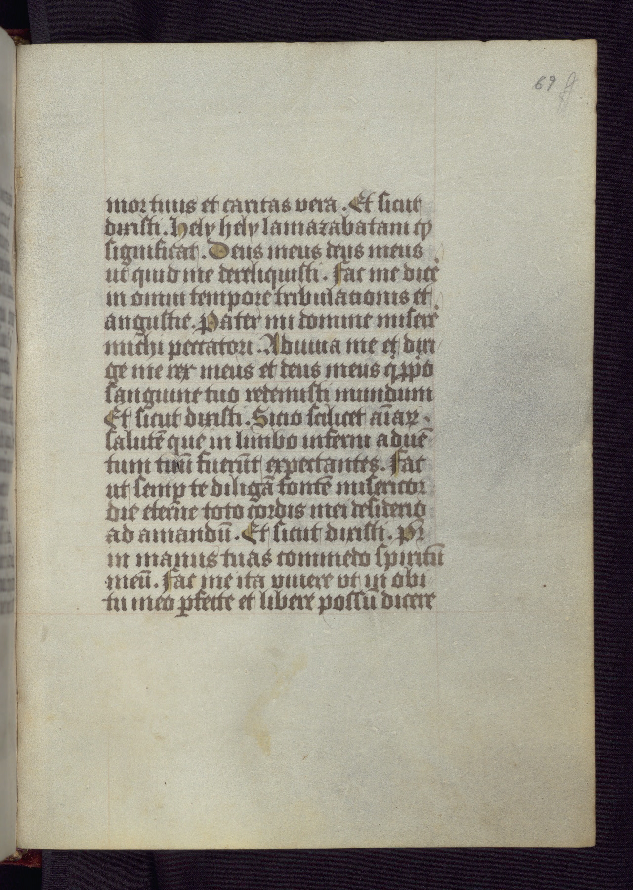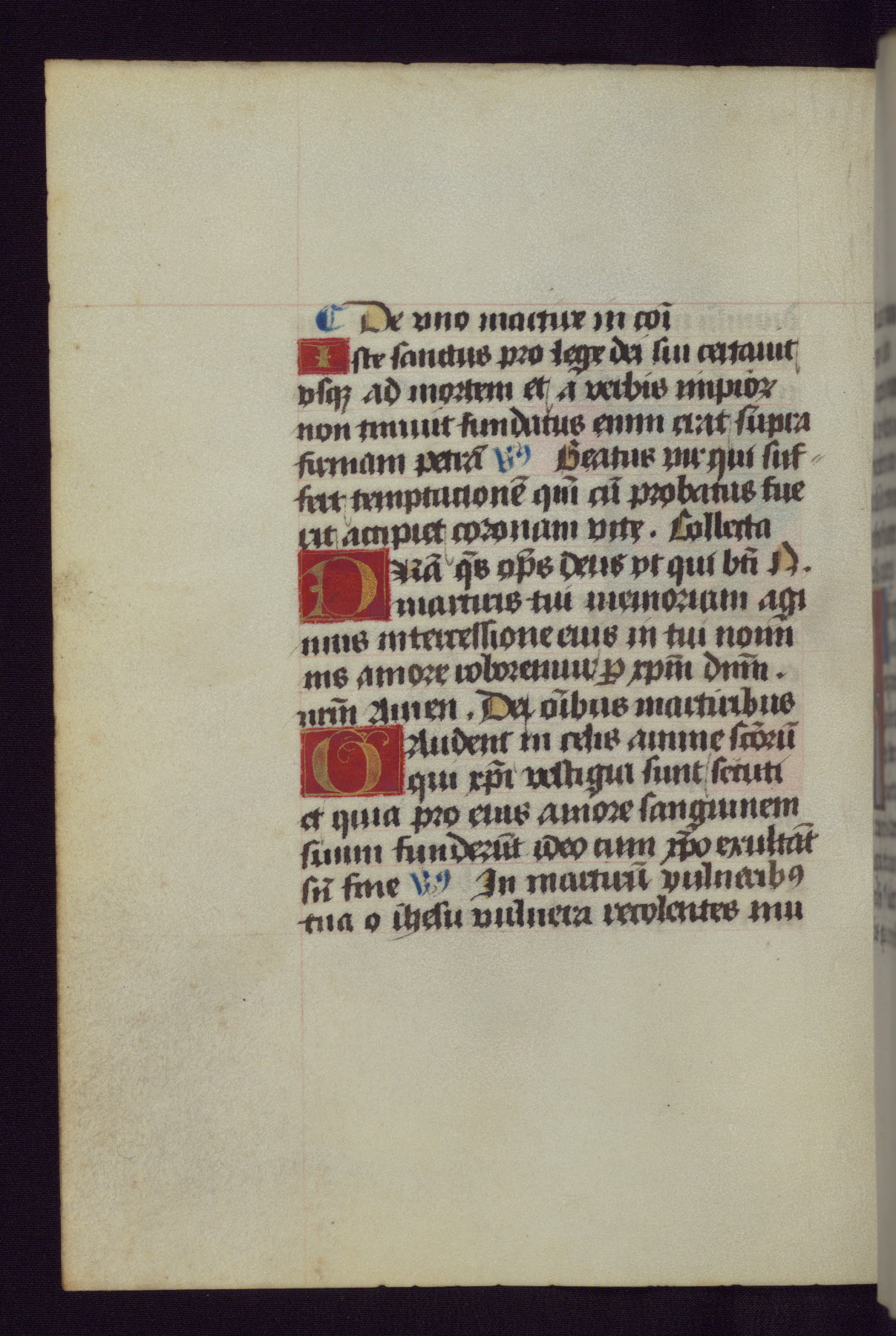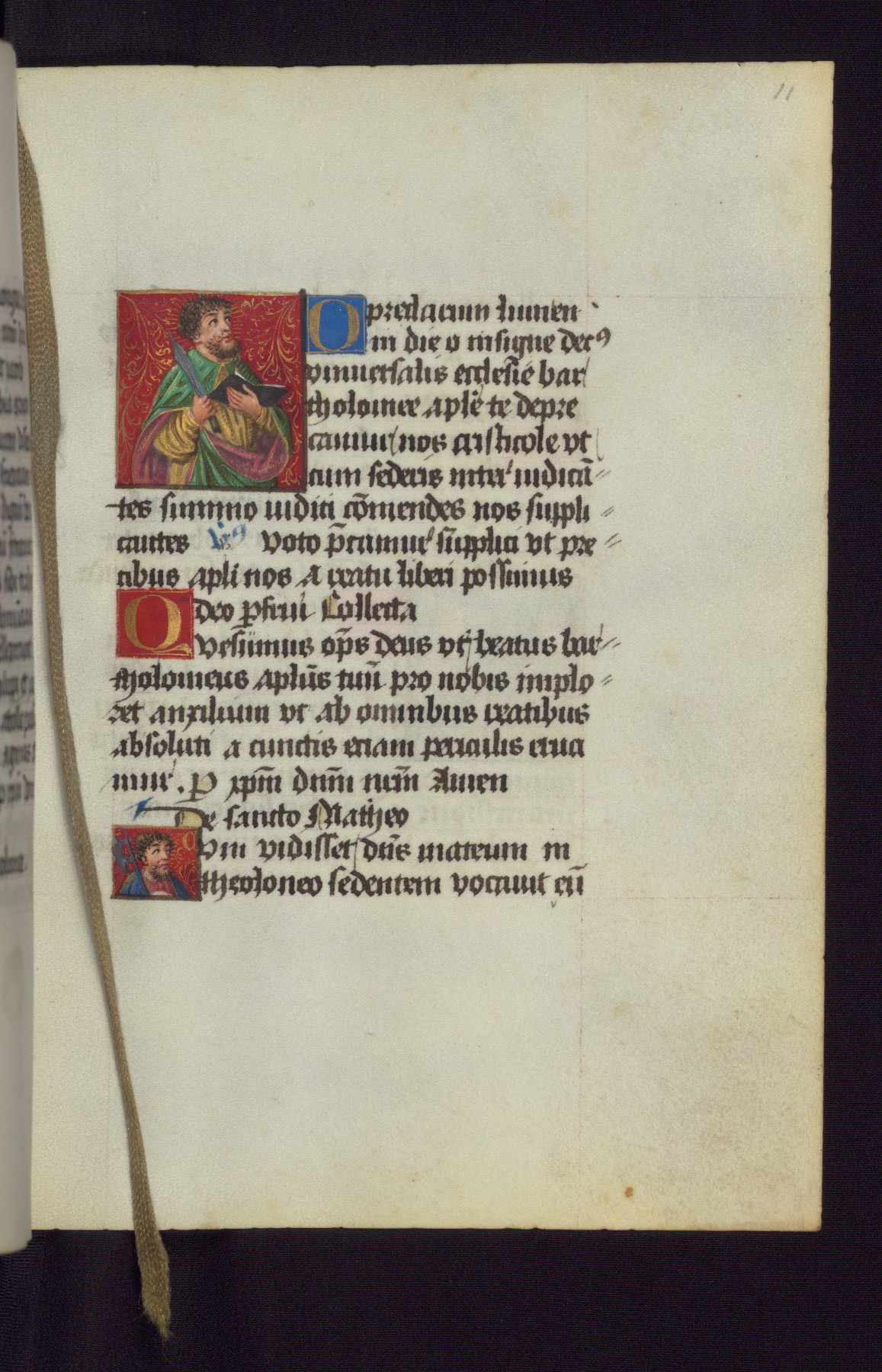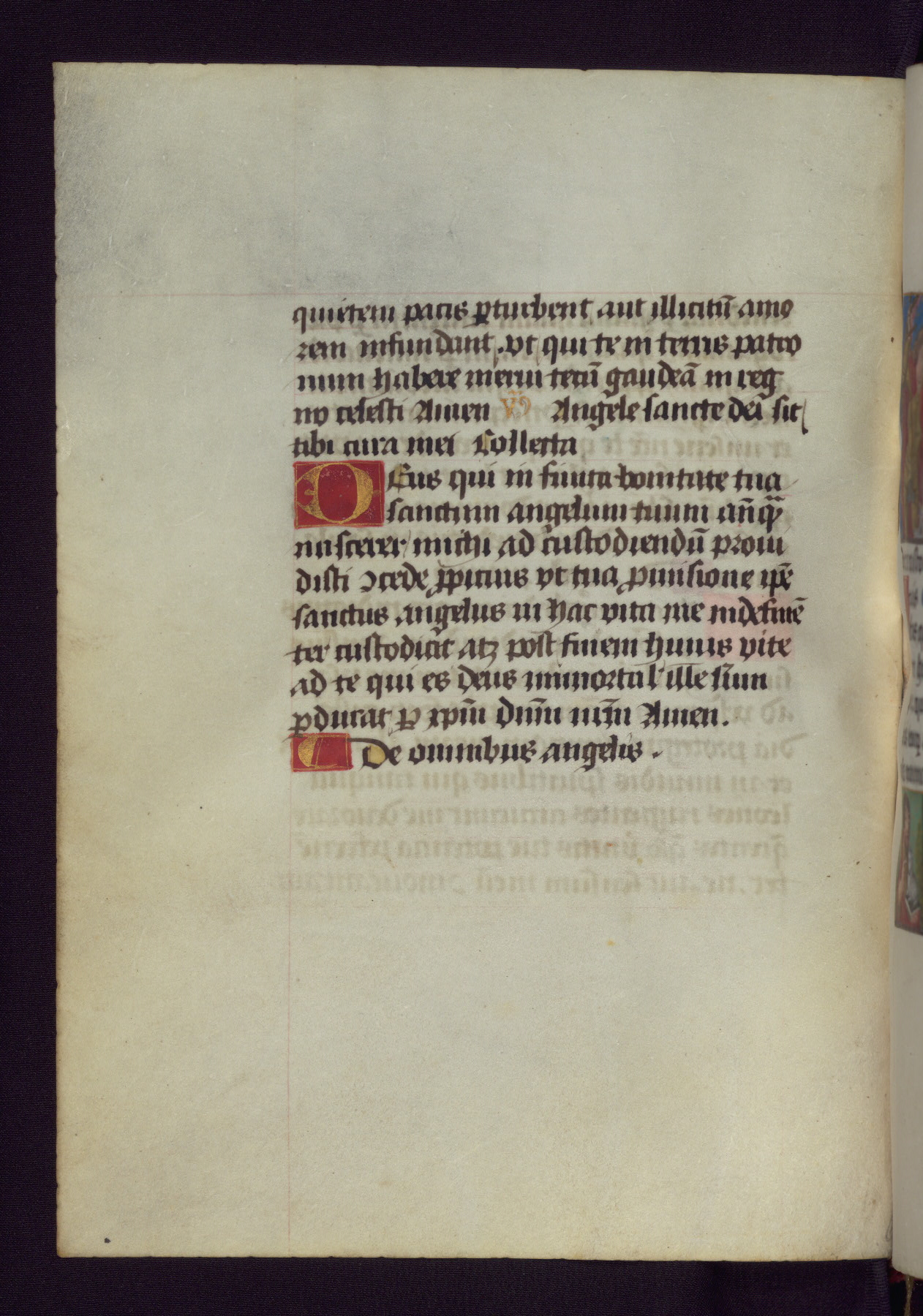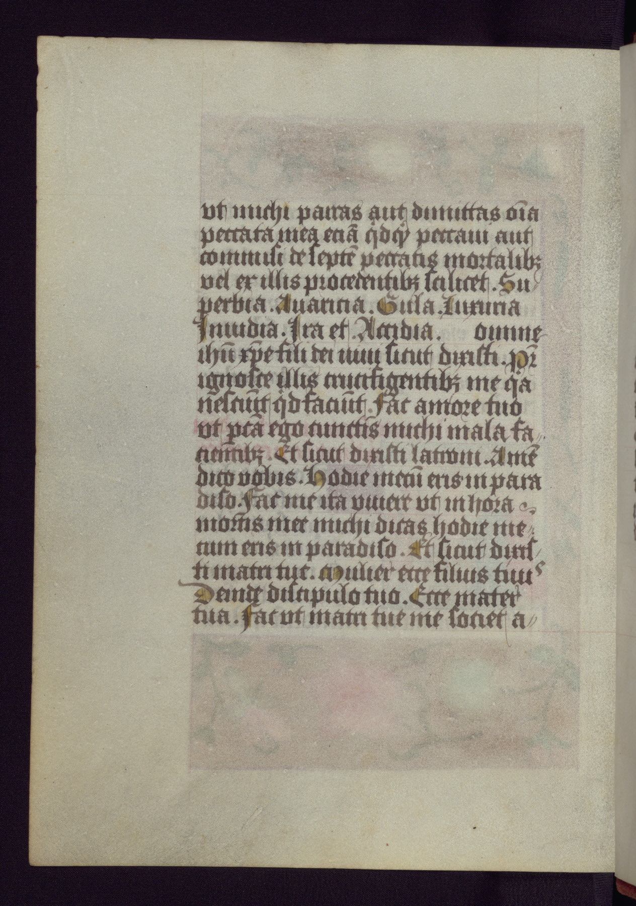 This early sixteenth-century illuminated prayer book contains Latin prayers and passages from the Gospels. Although small in scale, it is notable for its abundance of illuminations, with nearly sixty extant small miniatures. Full-color portraits embellish the prayers to the Virgin and Suffrages, while the images within the Gospel narrative are rendered primarily in grisaille, a nearly entirely gray monochrome technique. The last folios include a trompe-l'oeil foliate margin and a Crucifixion that seems to be a later addition. Throughout the book gold initials on red or blue grounds mark the beginning of the prayers.