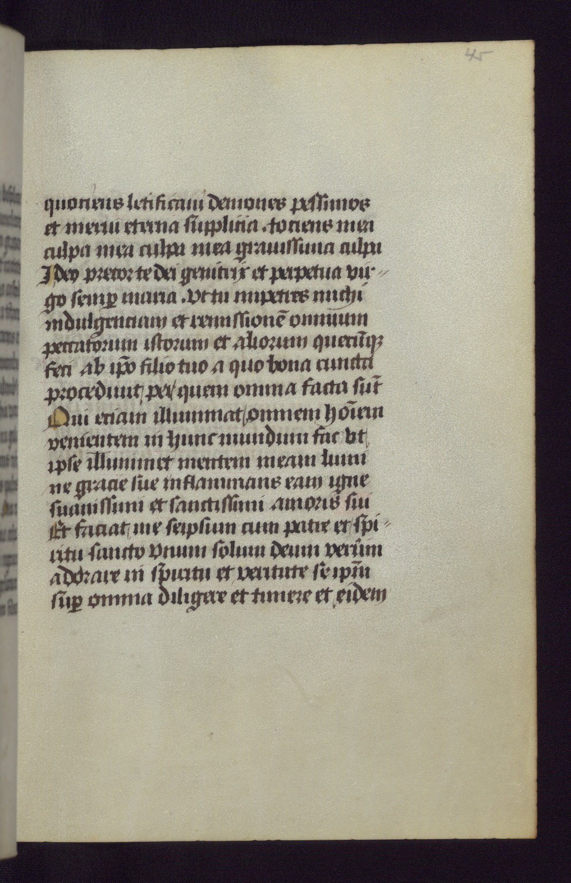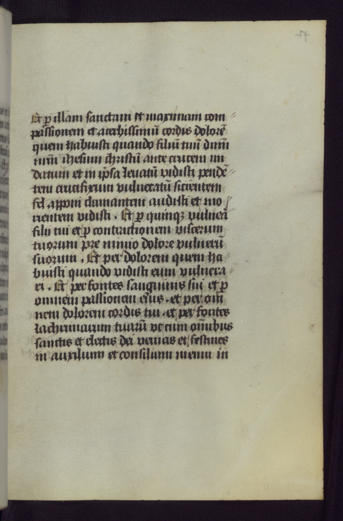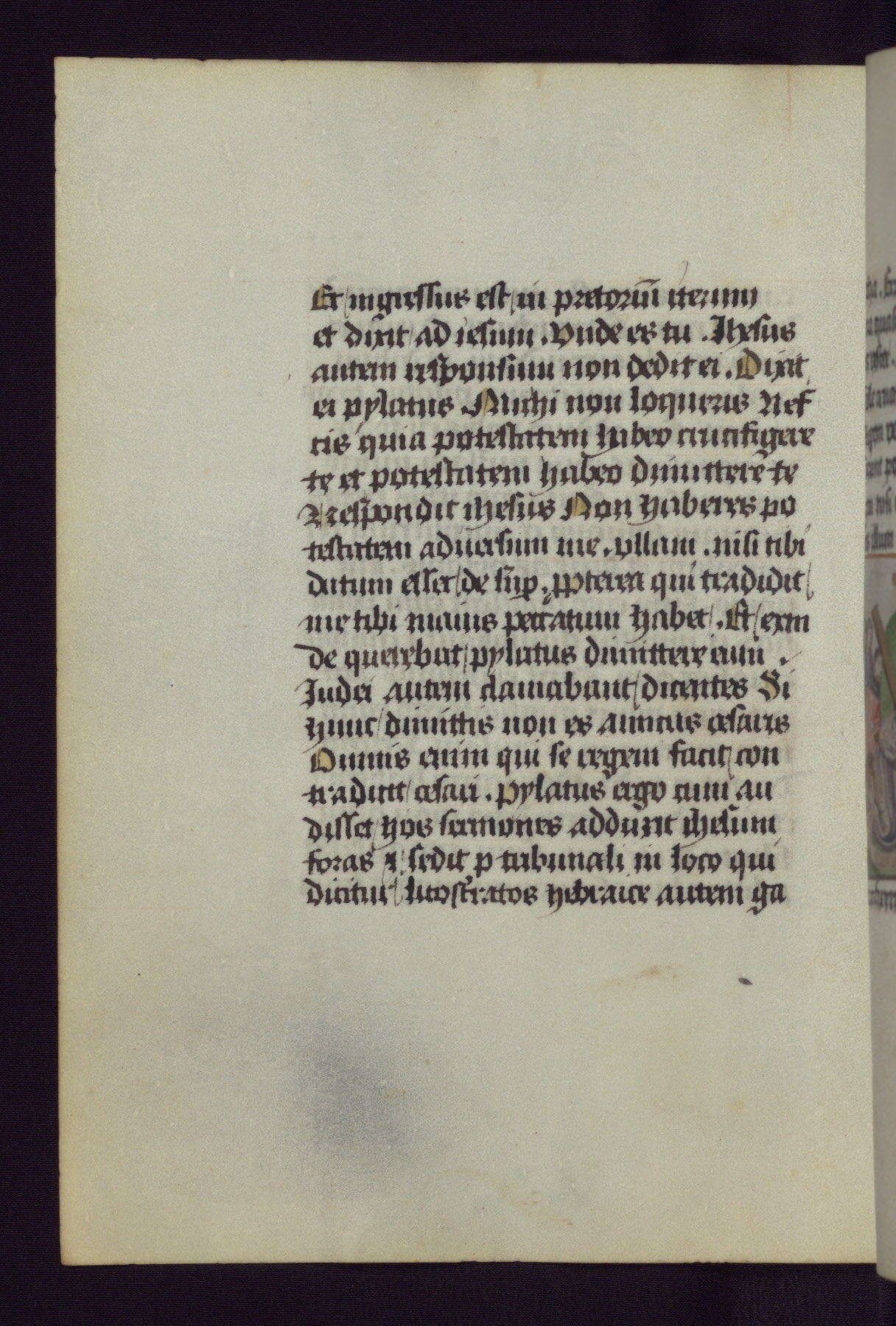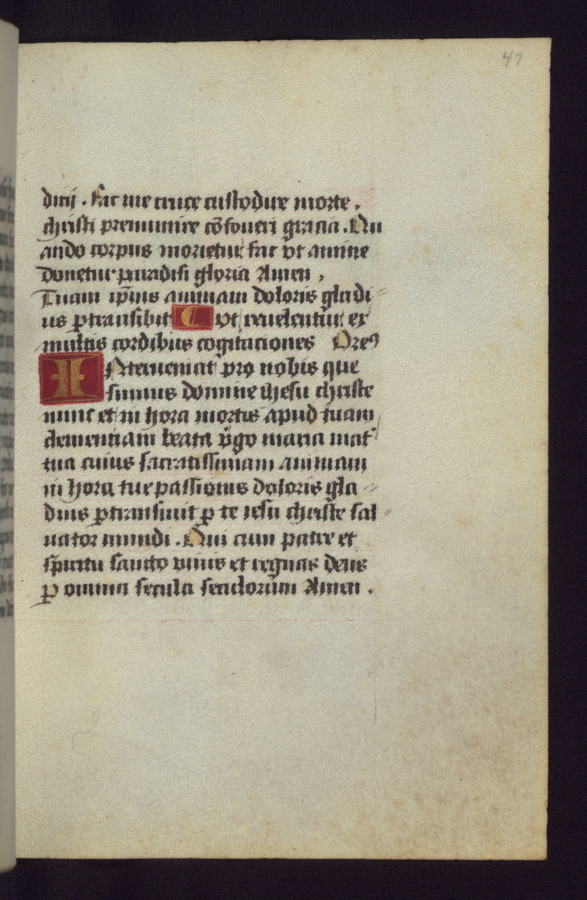 This early sixteenth-century illuminated prayer book contains Latin prayers and passages from the Gospels. Although small in scale, it is notable for its abundance of illuminations, with nearly sixty extant small miniatures. Full-color portraits embellish the prayers to the Virgin and Suffrages, while the images within the Gospel narrative are rendered primarily in grisaille, a nearly entirely gray monochrome technique. The last folios include a trompe-l'oeil foliate margin and a Crucifixion that seems to be a later addition. Throughout the book gold initials on red or blue grounds mark the beginning of the prayers.