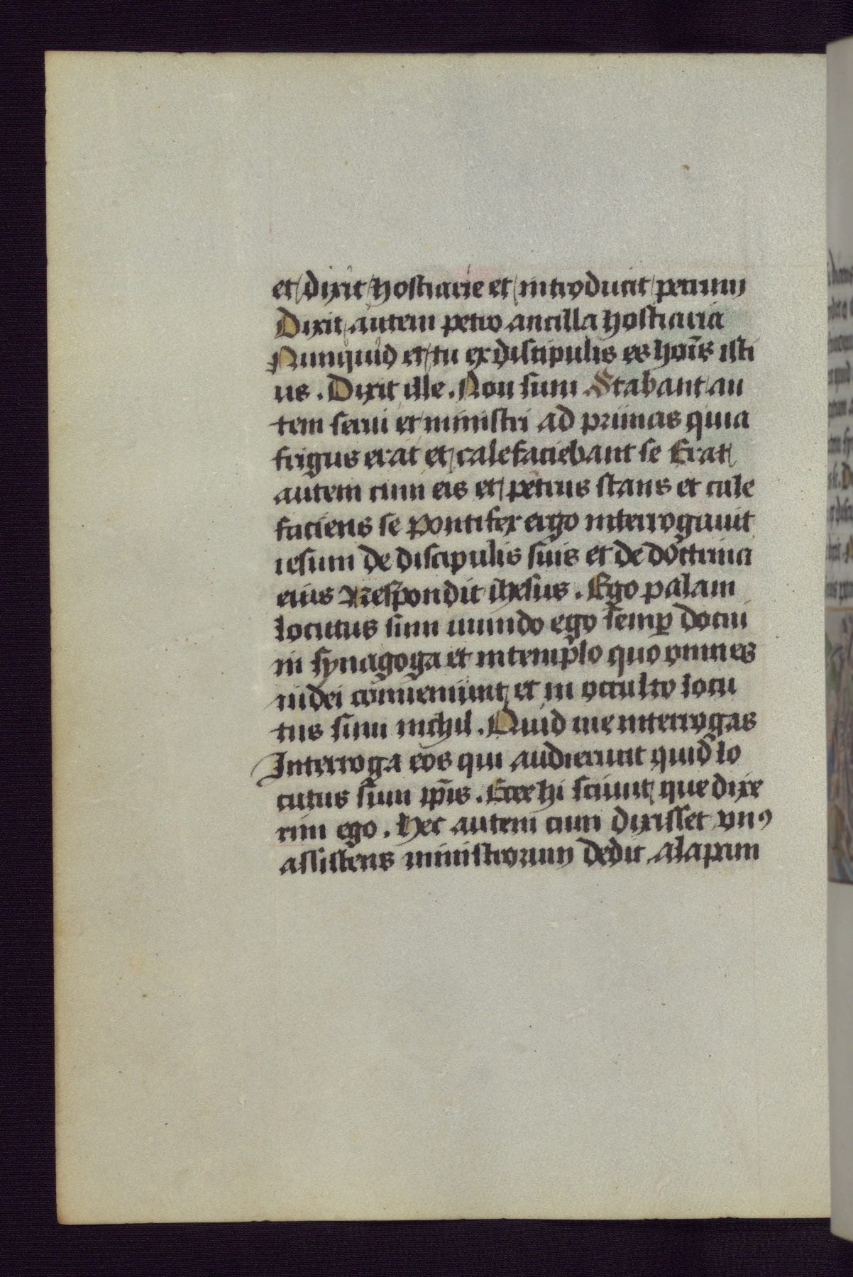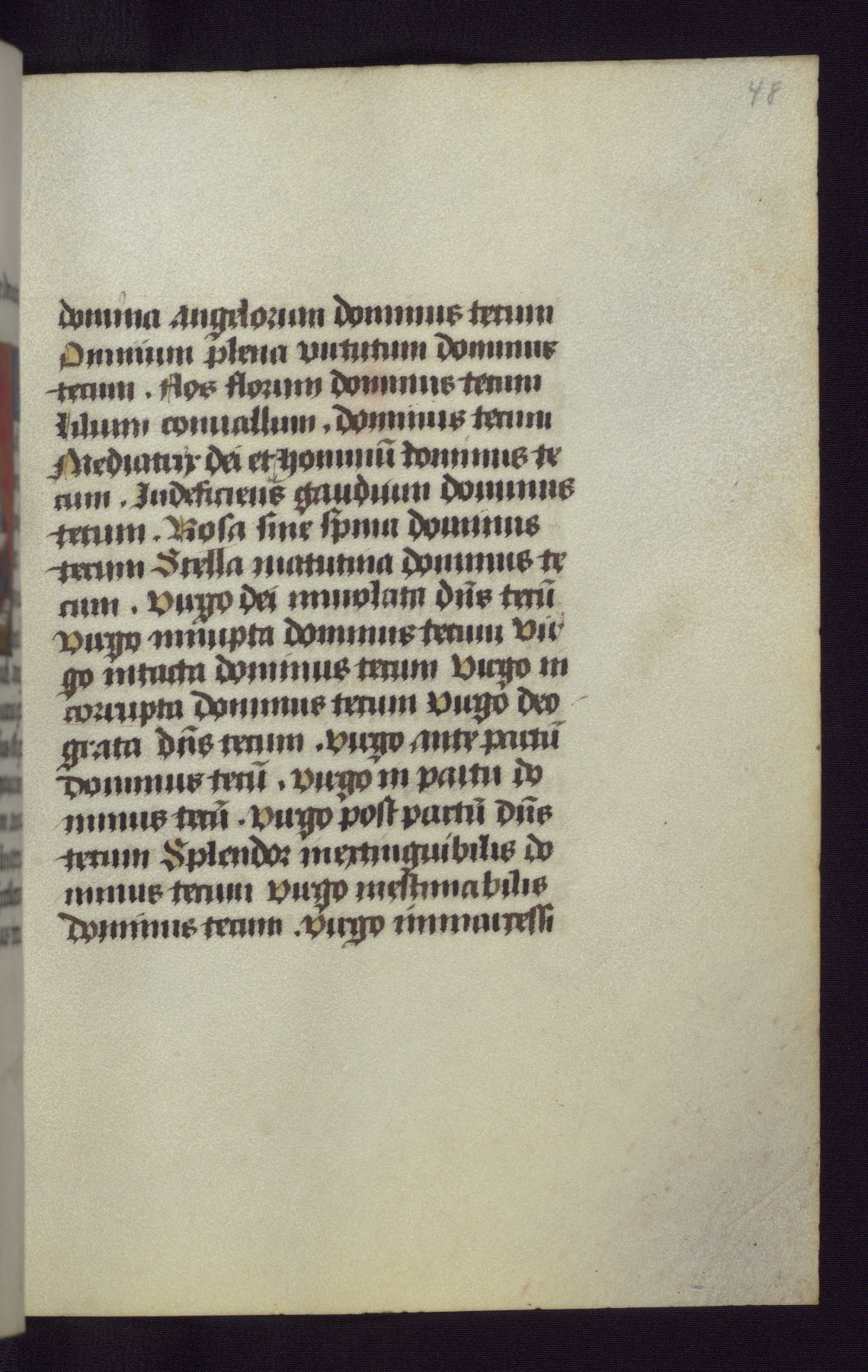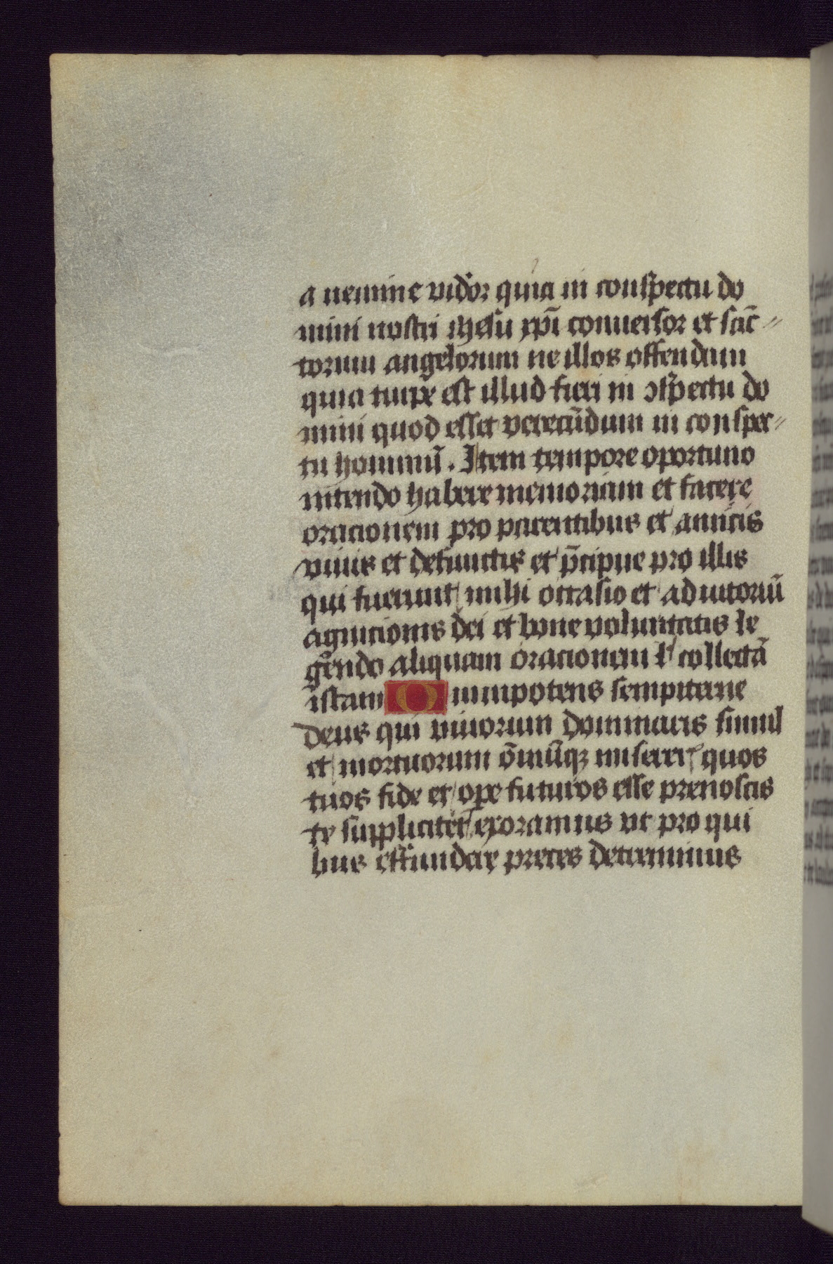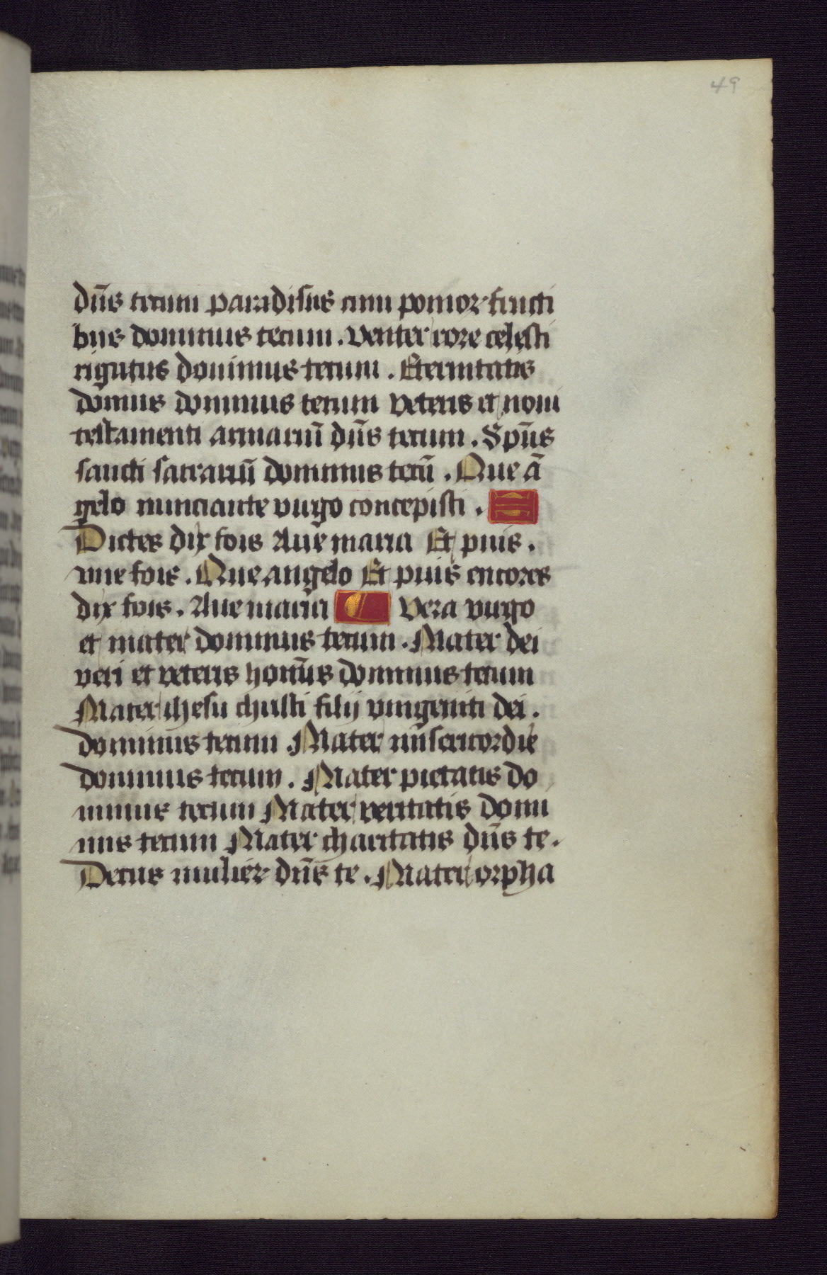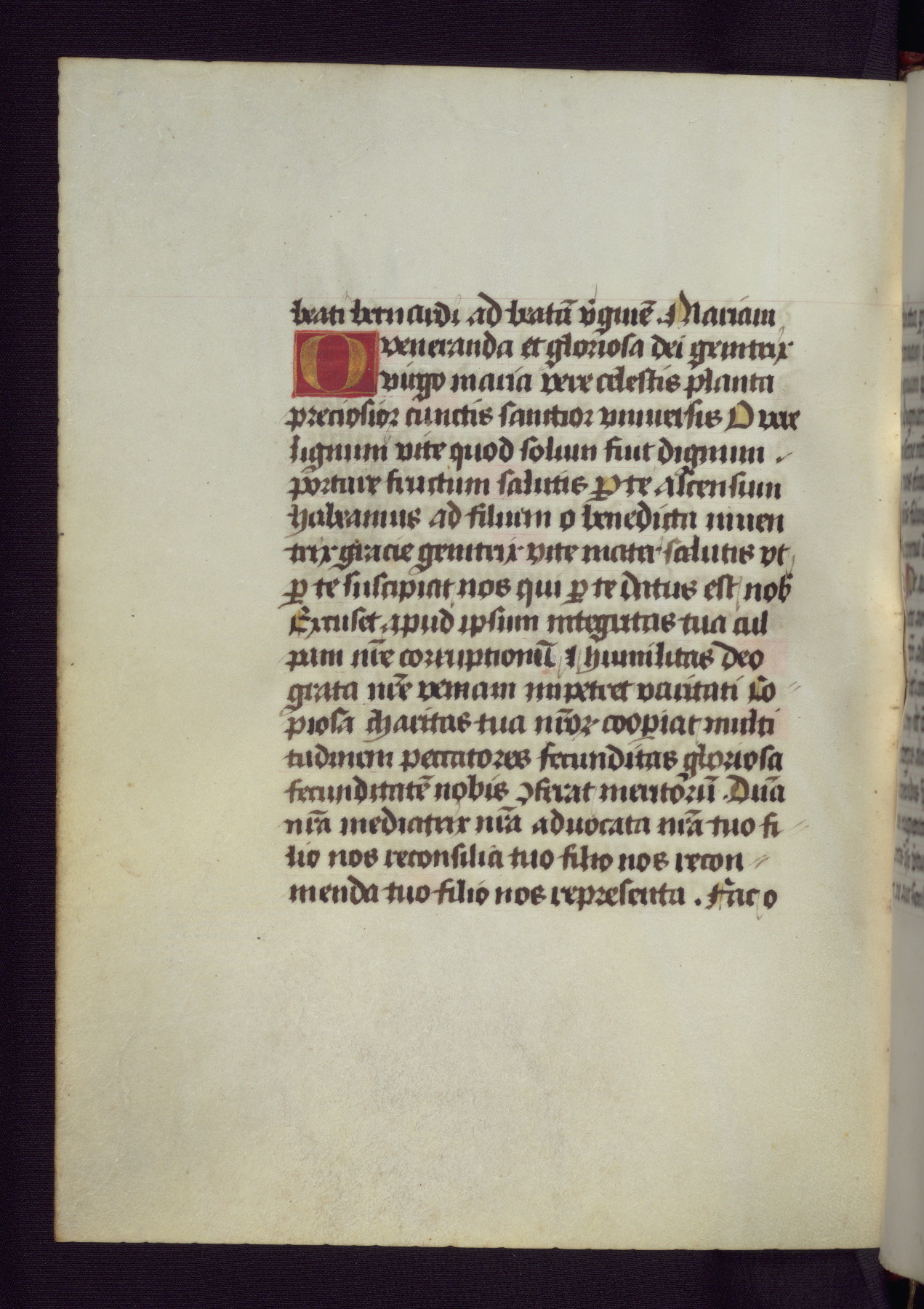 This early sixteenth-century illuminated prayer book contains Latin prayers and passages from the Gospels. Although small in scale, it is notable for its abundance of illuminations, with nearly sixty extant small miniatures. Full-color portraits embellish the prayers to the Virgin and Suffrages, while the images within the Gospel narrative are rendered primarily in grisaille, a nearly entirely gray monochrome technique. The last folios include a trompe-l'oeil foliate margin and a Crucifixion that seems to be a later addition. Throughout the book gold initials on red or blue grounds mark the beginning of the prayers.