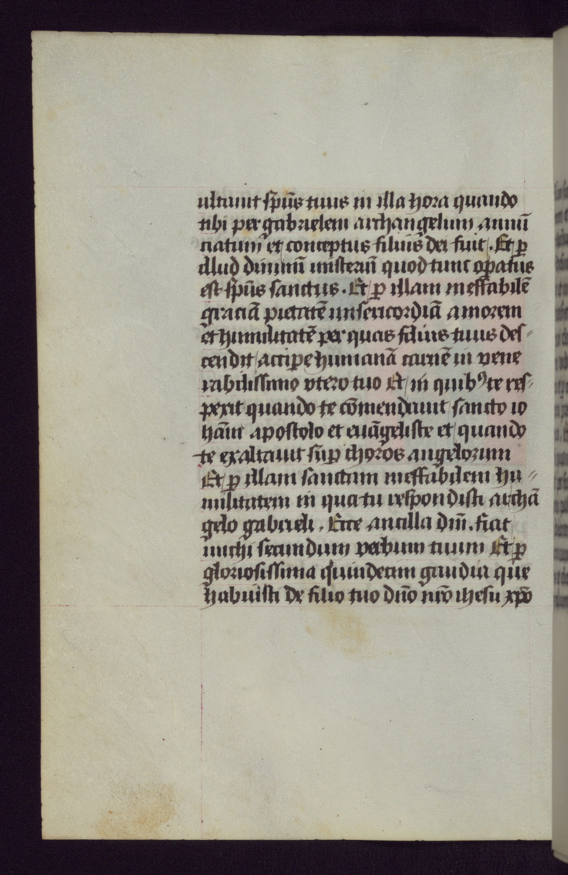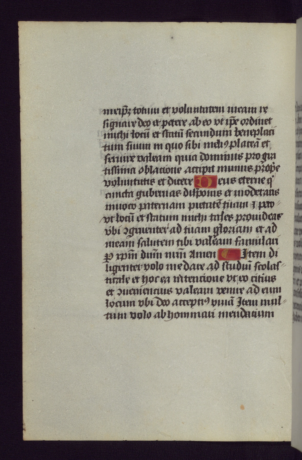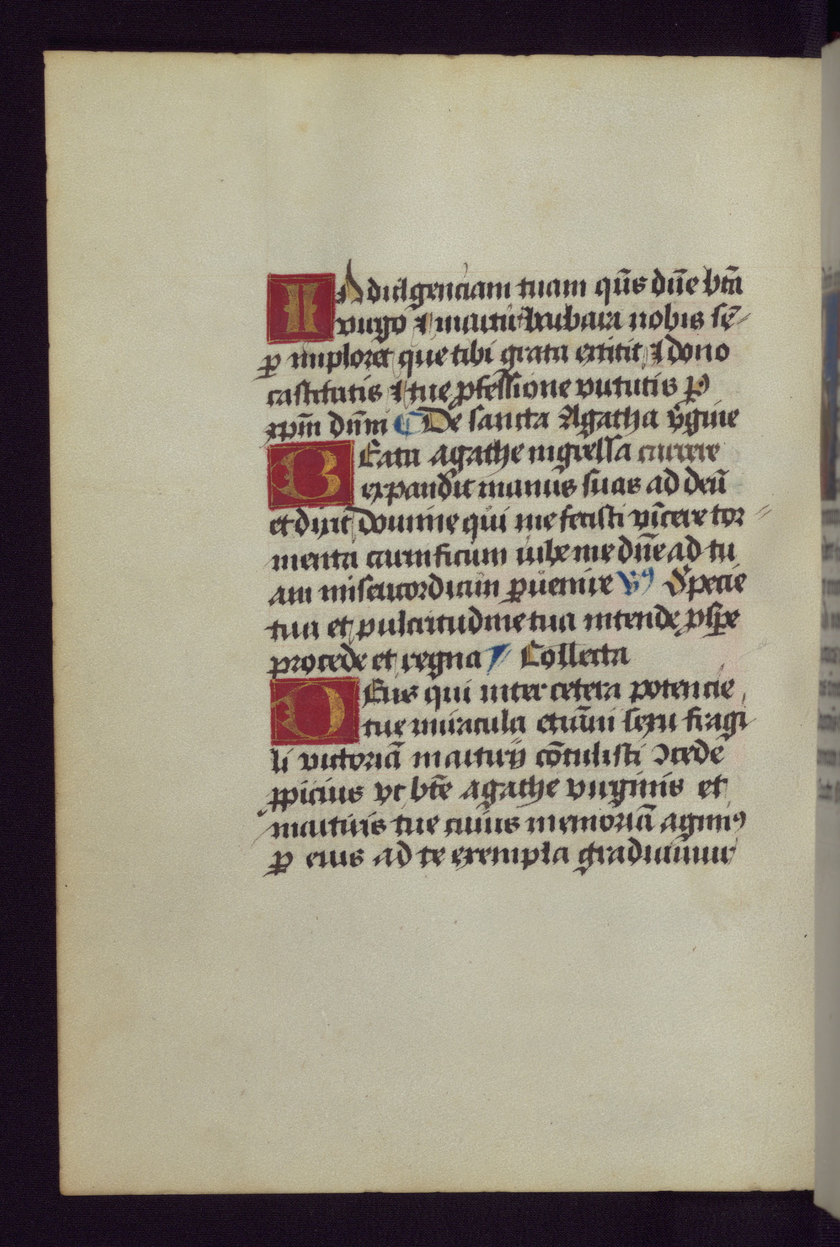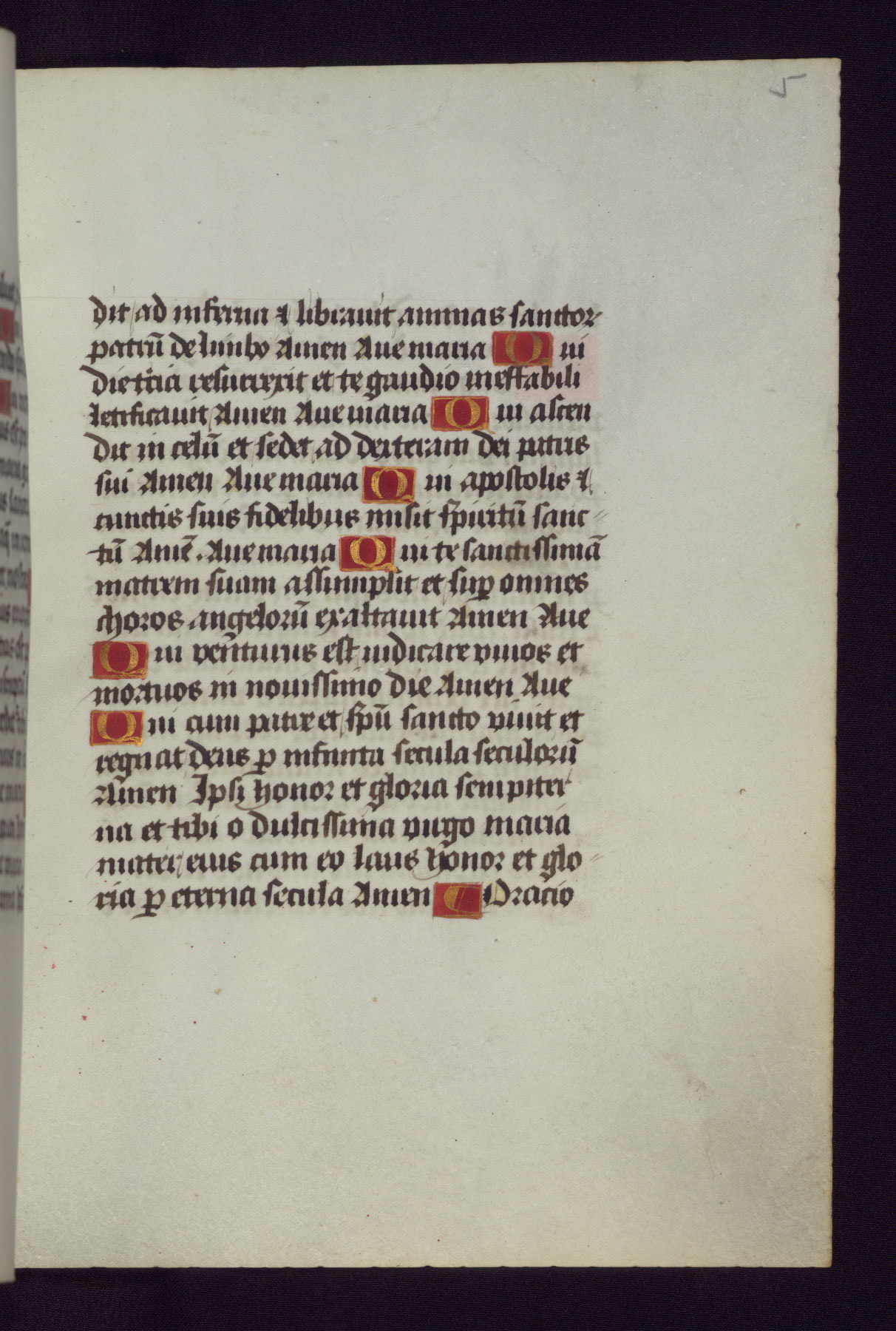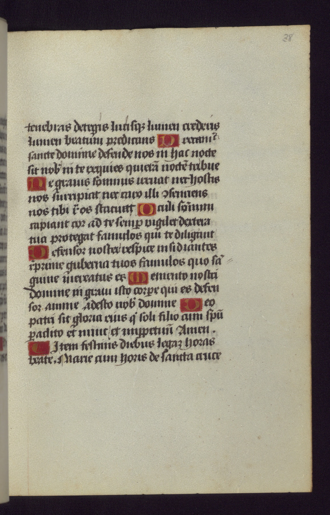 This early sixteenth-century illuminated prayer book contains Latin prayers and passages from the Gospels. Although small in scale, it is notable for its abundance of illuminations, with nearly sixty extant small miniatures. Full-color portraits embellish the prayers to the Virgin and Suffrages, while the images within the Gospel narrative are rendered primarily in grisaille, a nearly entirely gray monochrome technique. The last folios include a trompe-l'oeil foliate margin and a Crucifixion that seems to be a later addition. Throughout the book gold initials on red or blue grounds mark the beginning of the prayers.
