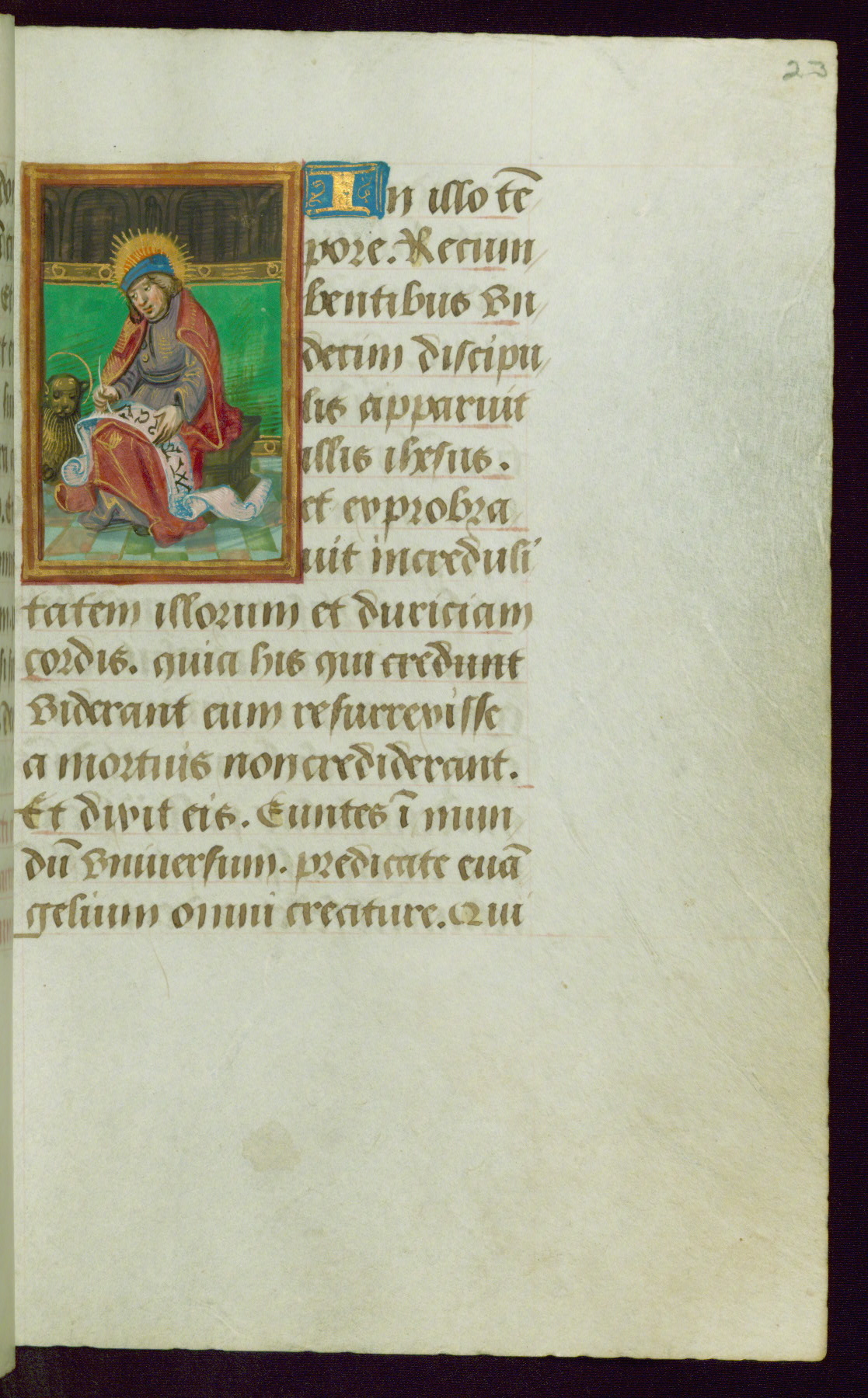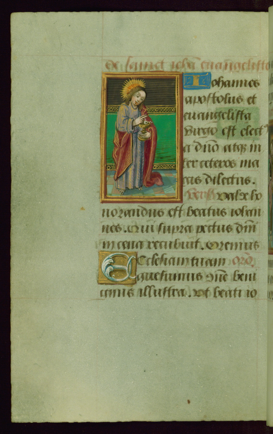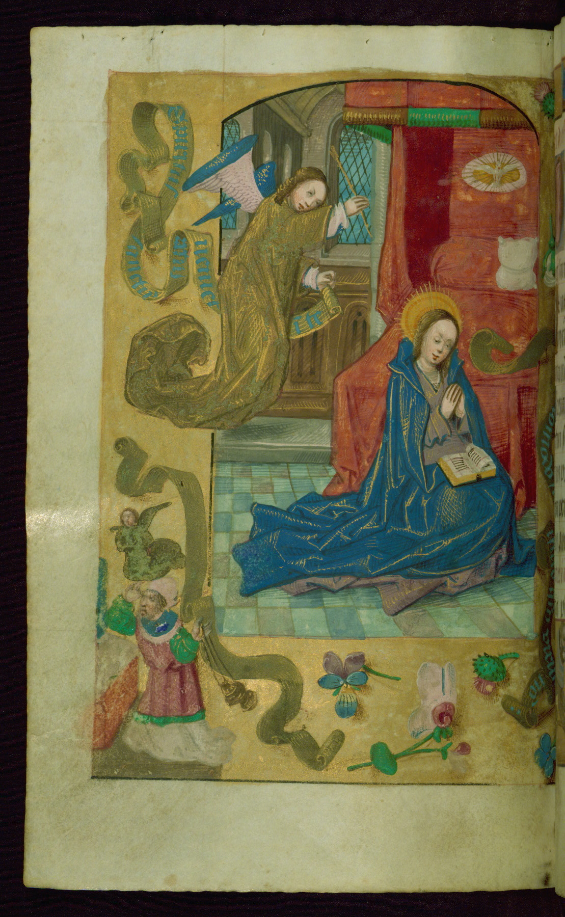 - Decoration note: Twelve full-page miniatures, six inserted; twenty-five small miniatures; sacred and secular marginalia; decorated illuminated initials of liquid gold appearing on pages opposite full-page miniatures (3 lines) and at secondary text divisions (2 lines); versals and gold domincal letters "A" on alternately bright blue and brownish-red ground minimally patterned in gold; borders on three pages with inserted miniatures (fols. 25v, 43v, and 128v); around remaining three inserted and six integral full-page miniatures are well-spaced motifs (as well as insects), ground, cast shadows, and marginalia; on pages opposite full-page miniatures are illusionistic borders, probably by same hand; marginalia found at nine of twelve openings marked by full-page miniatures; line fillers beginning in calendar are panels in rich blue, thereafter in same blue alternating with brownish-red, sketchy gold patterning; rubrics in red; text in brown ink