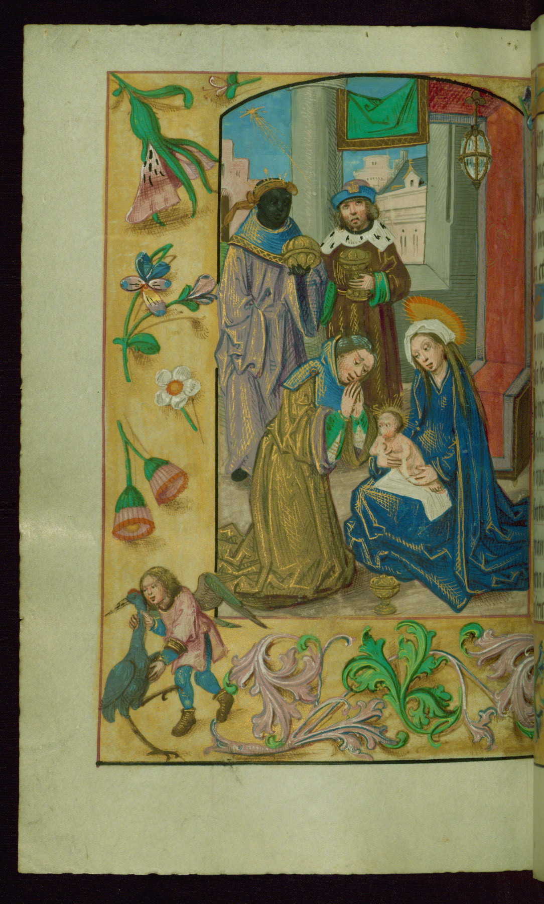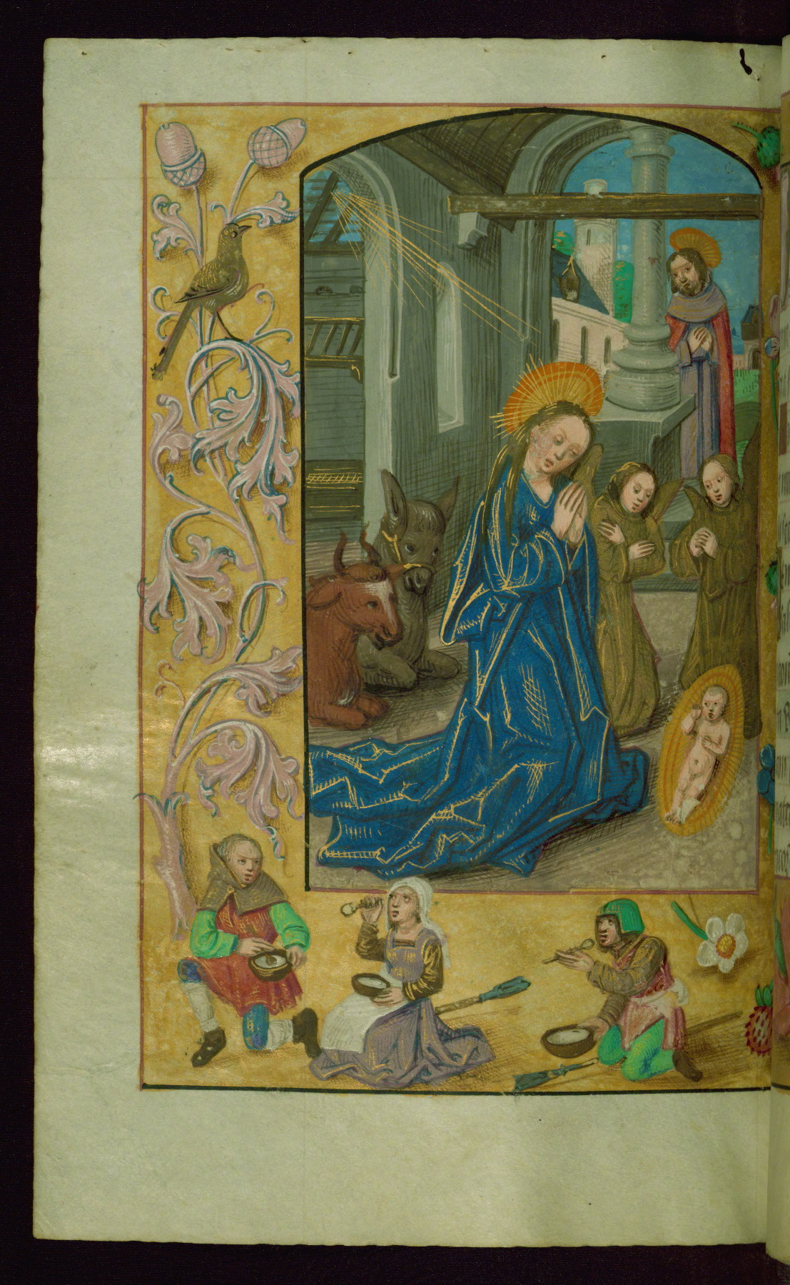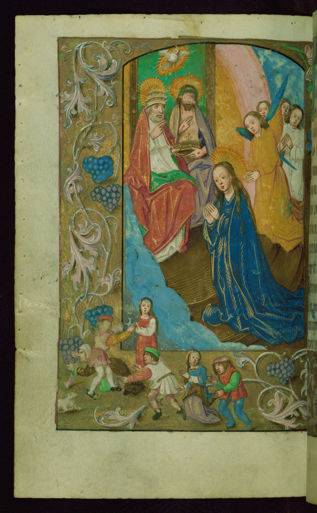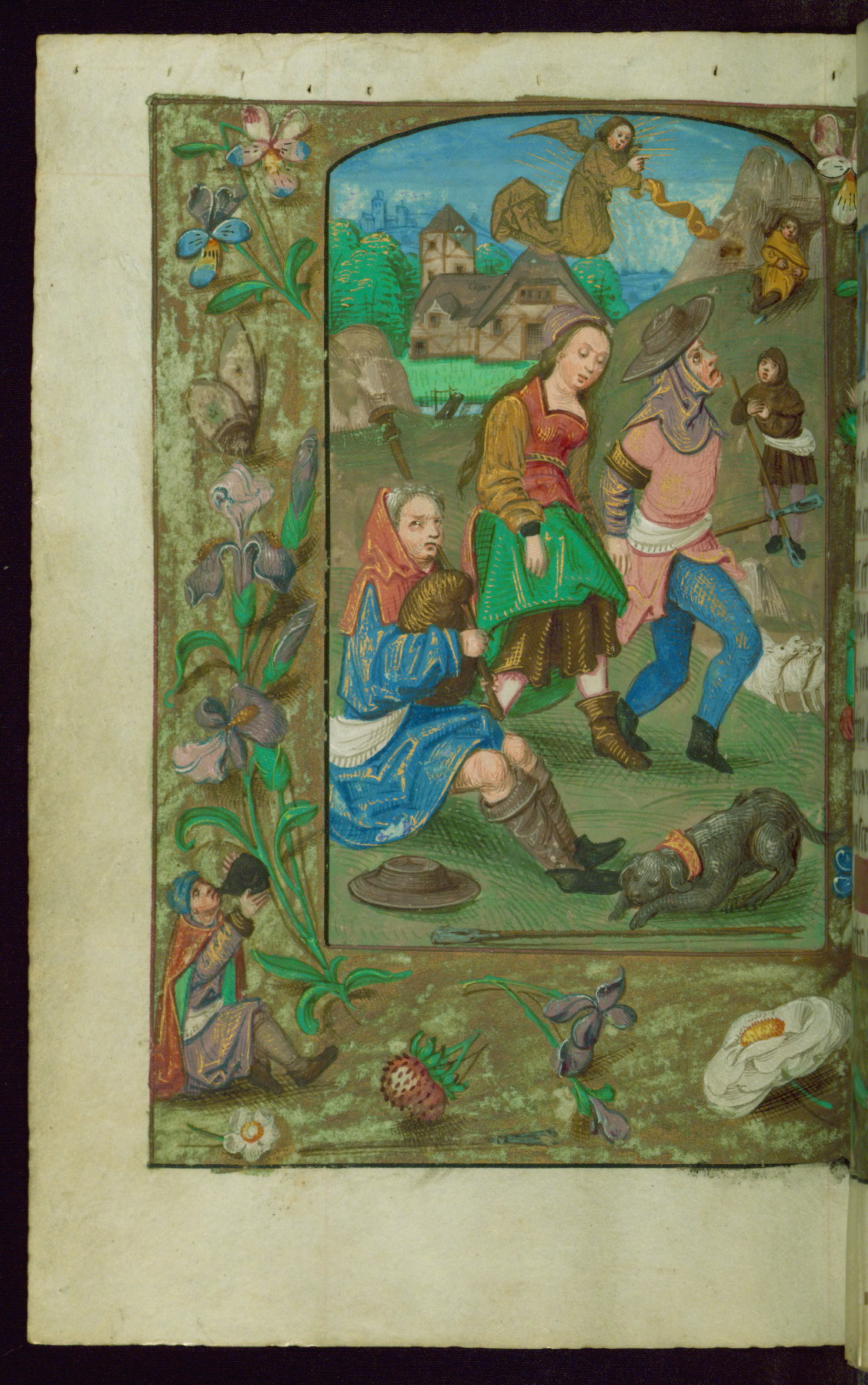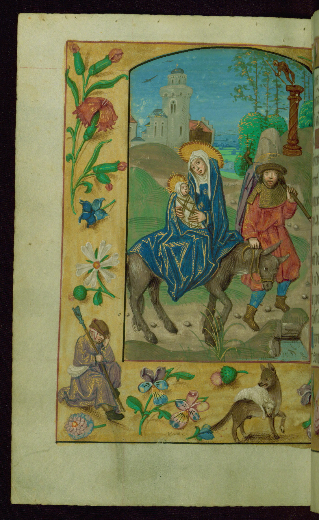 This beautifully bound Book of Hours was completed in Bruges ca. 1490. The illuminator's style was influenced by the Master of Edward IV, active ca. 1470-90, and followers. The manuscript includes twelve full-page miniatures and twenty-five small miniatures, along with sacred and secular marginalia and some illusionistic borders. While the sheer volume of miniatures is remarkable, the decoration program as a whole only strengthens the manuscript’s impact. Select marginalia motifs reinforce the compositional motifs of the miniatures; see fols. 25v and 26r for Passion motifs.