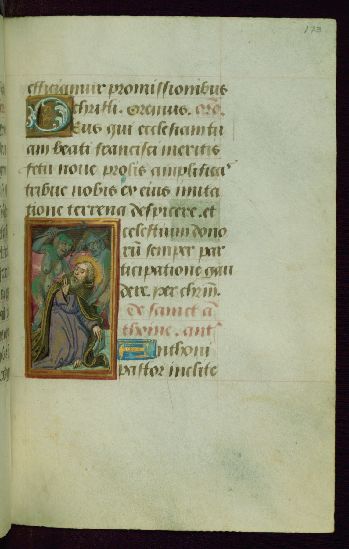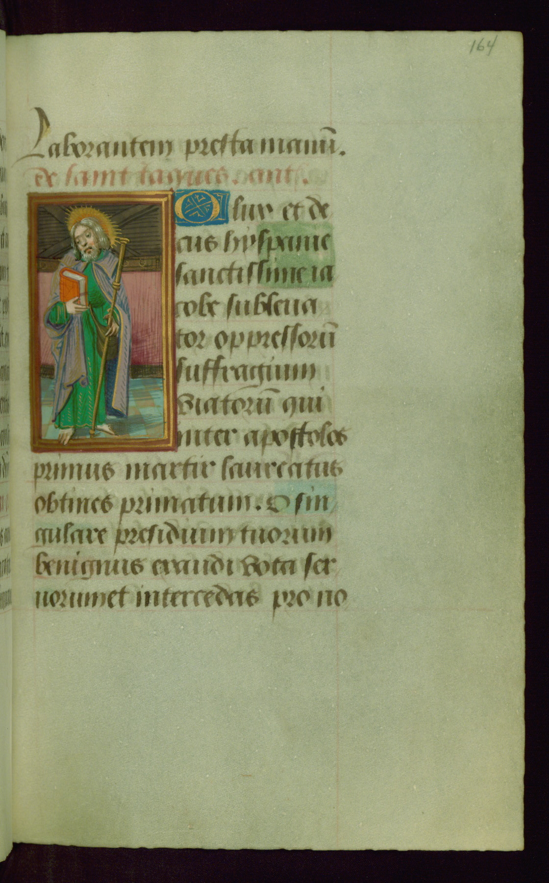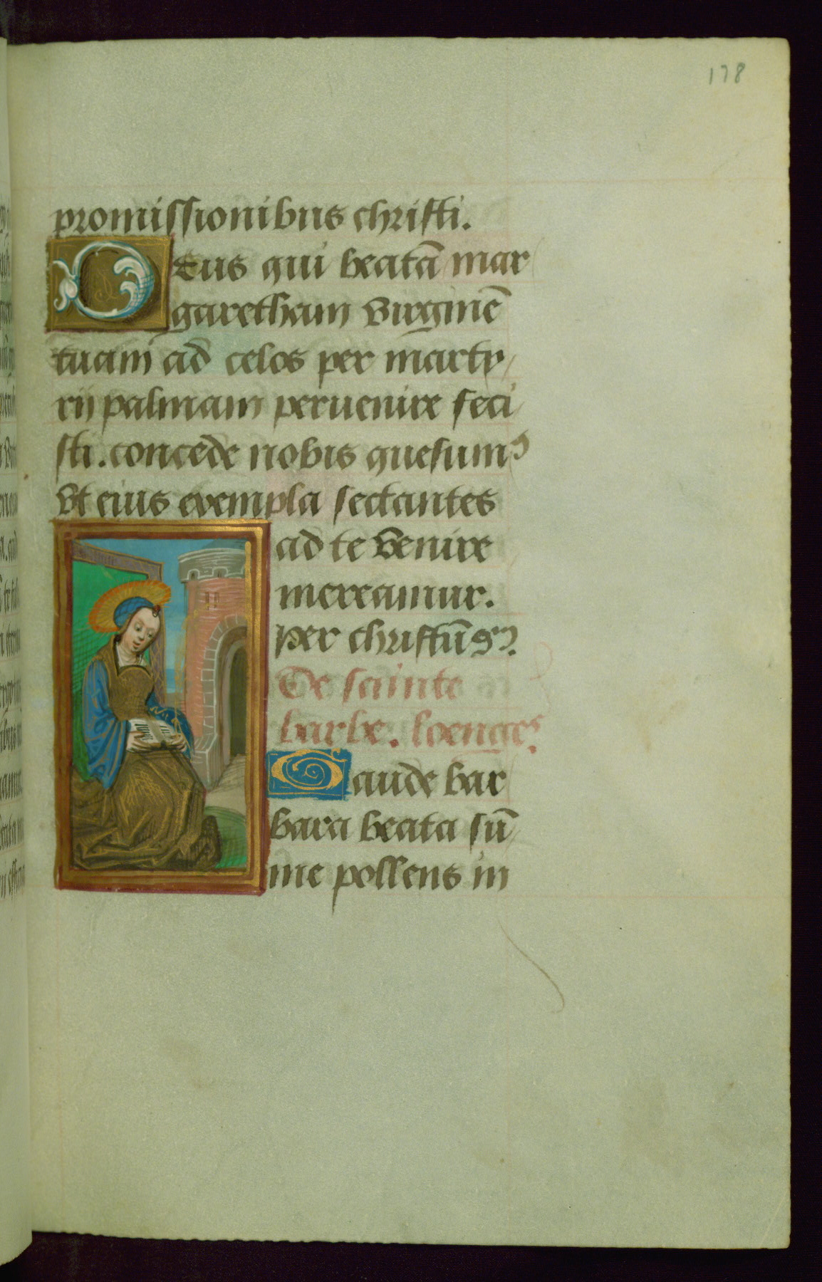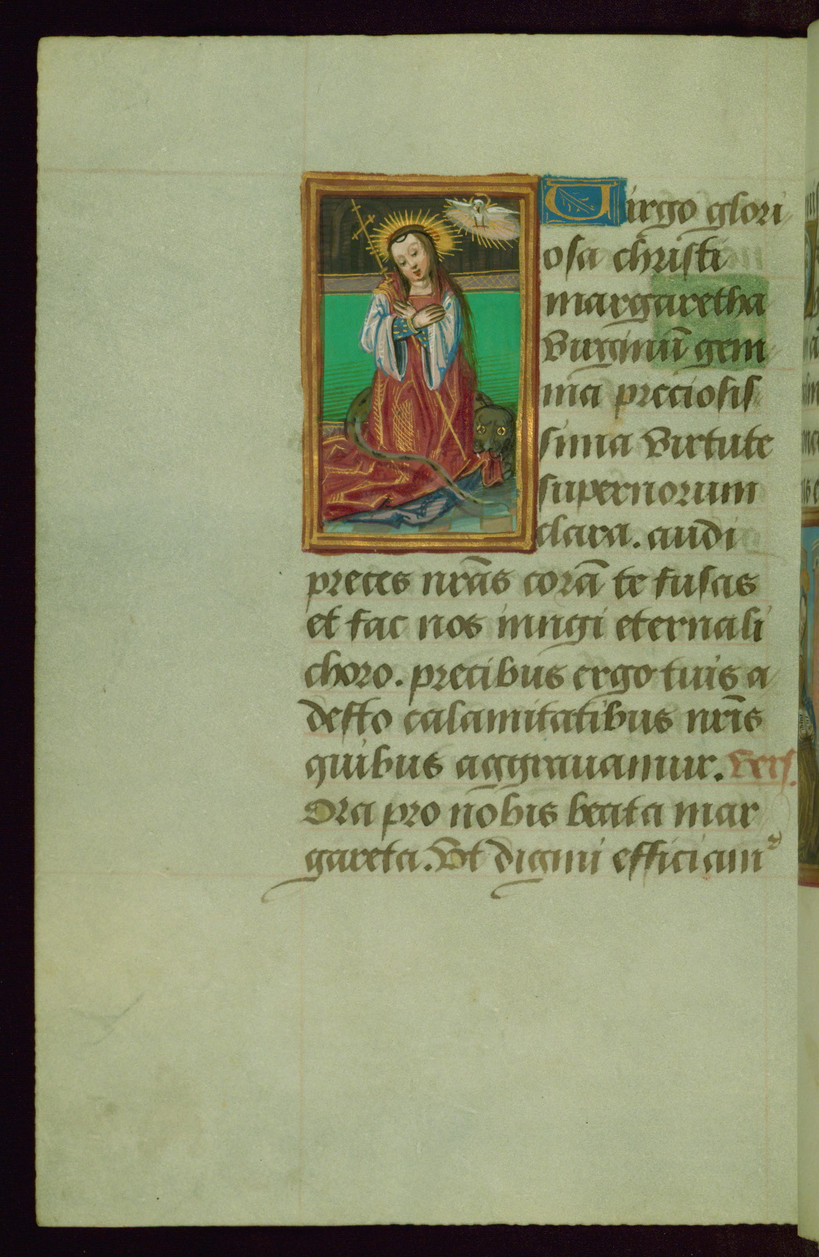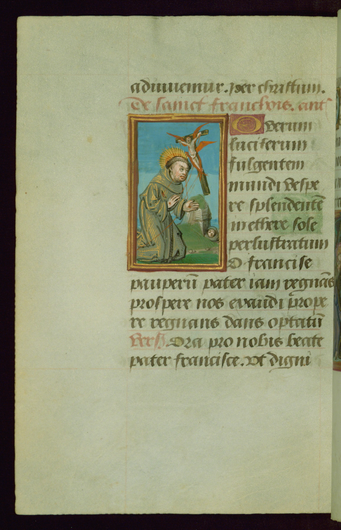- Contents: Devotional sequence; fols. 161r-180v: twenty-one suffrages, sixteen to male saints (one pair) and six to female saints; typically headed "De Saint . . . sainct" and "De sainte . . . saincte . . . ."; intercalated quatrains to All Apostles, Andrew, Vincent, Martin: Michael, John the Baptist, John the Evangelist, Peter and Paul, Andrew quatrain, James the Greater, Stephen, Lawrence, Christopher, Sebastian, Nicholas, Claudius, Jerome, Francis, Anthony, Adrian, Martin, Anne, Mary Magdalene, Catherine, Margaret (heading cites to Barbara by mistake, "De sainte barbe."), "Virgo gloriosa Christi margaretha virginum gemma preciosissima . . . .," Barbara, and Apollonia; fols. 180v-181v: two communion prayers; fols. 181v-183r: prayer lamenting sorrow of the Virgin by the Cross; fol. 183r-v: "Versus"; fols. 184r-185v: Seven Prayers of St. Gregory; fol. 185v: closing prayer; fols. 185v-186r: Communion prayers; fols. 186r-v: Prayer to the Virgin; fols. 187v-188r: Prayers to Christ on the Cross, beginning with quatrain, recitation of fourth prayer on the Passion yields unspecified period of indulgence, "Salutation quand on pense a dieu crucifie. In cruce pendentem. rogo te deum omnipotentem. Ut michi des mentem. Semper te amare volentem"; fol. 188r-v: "Oroison"