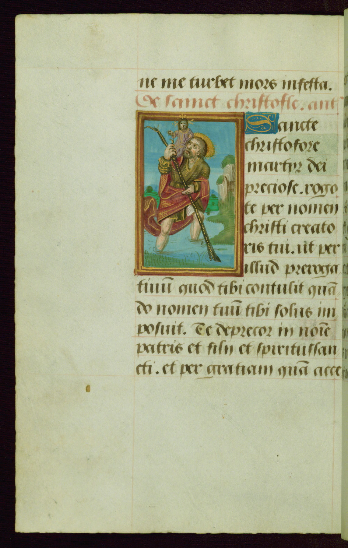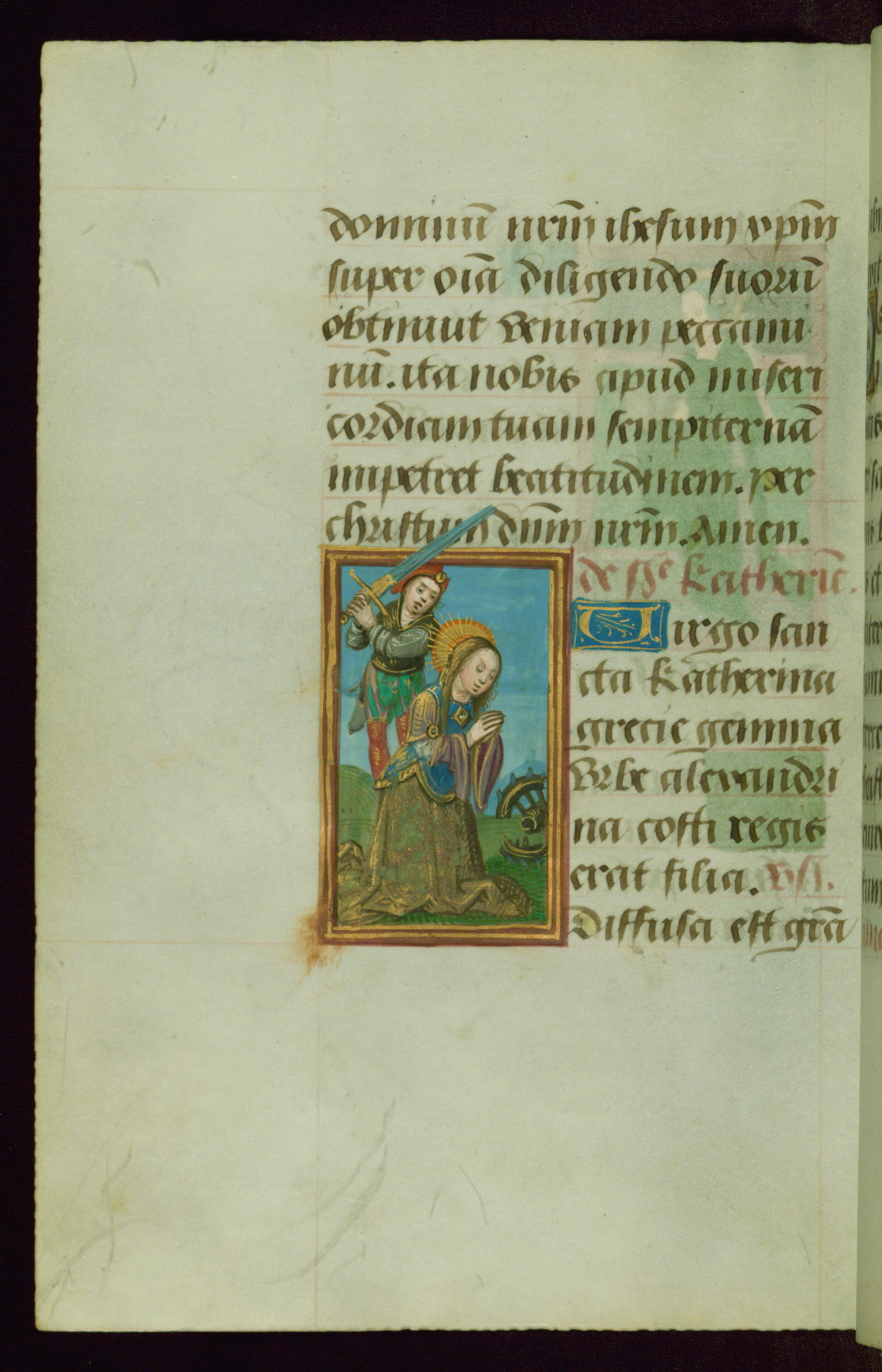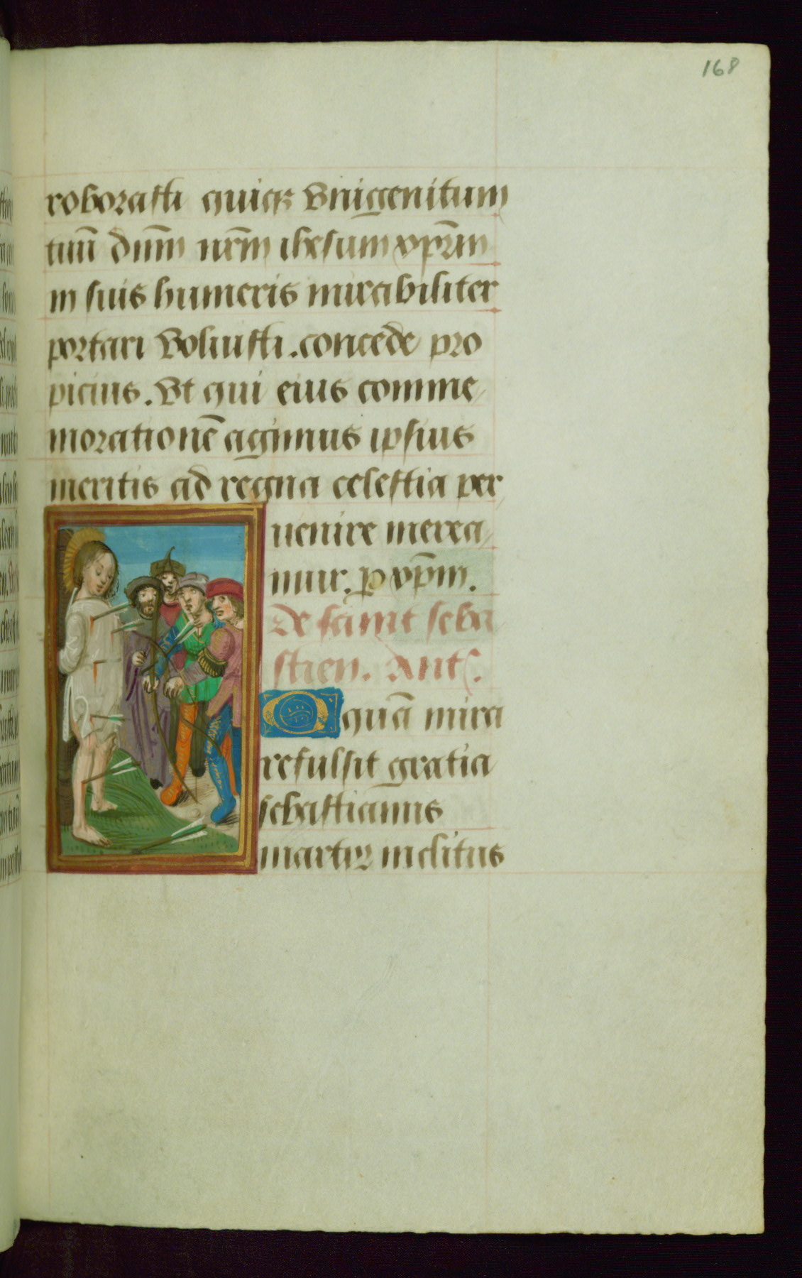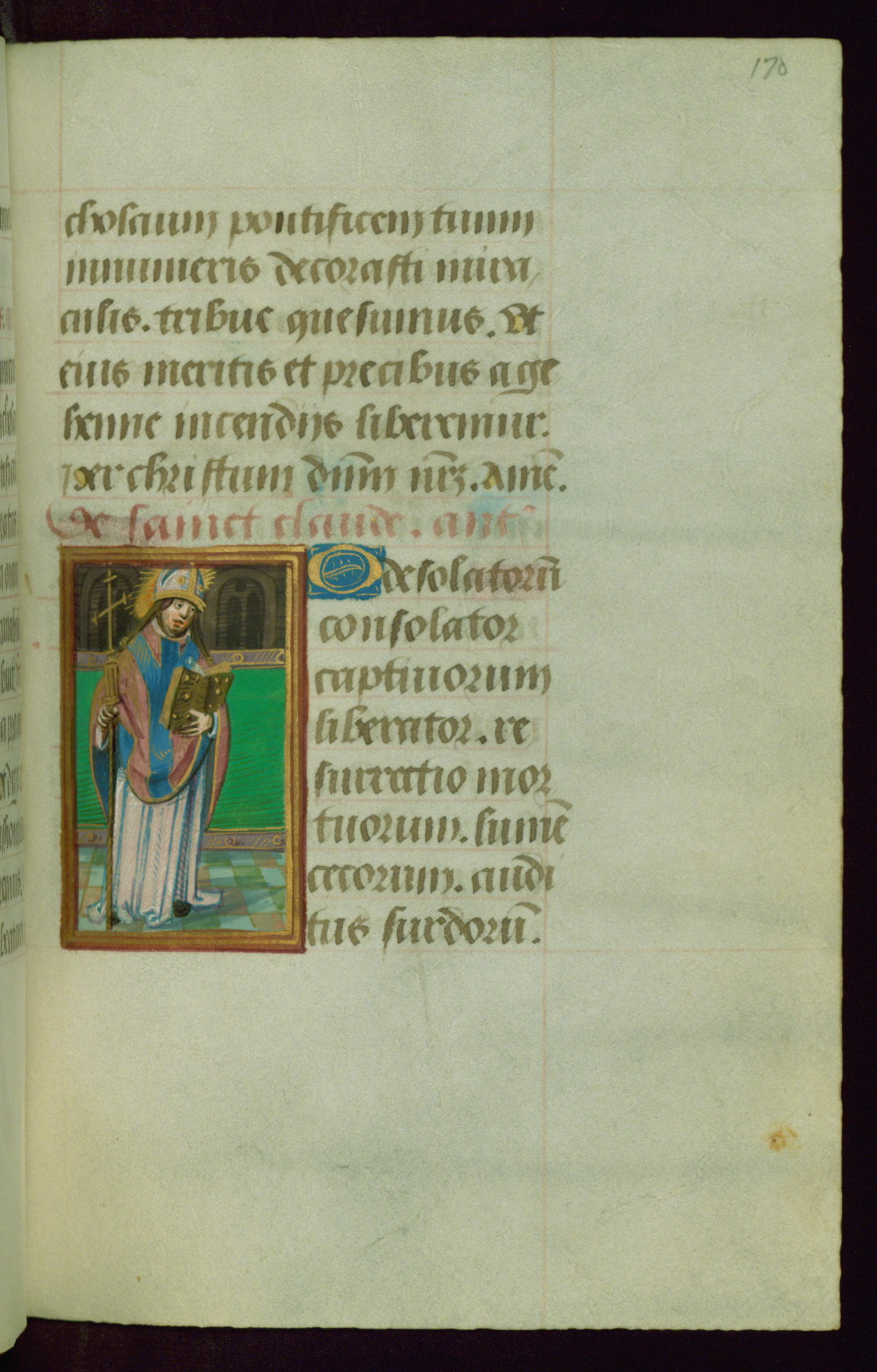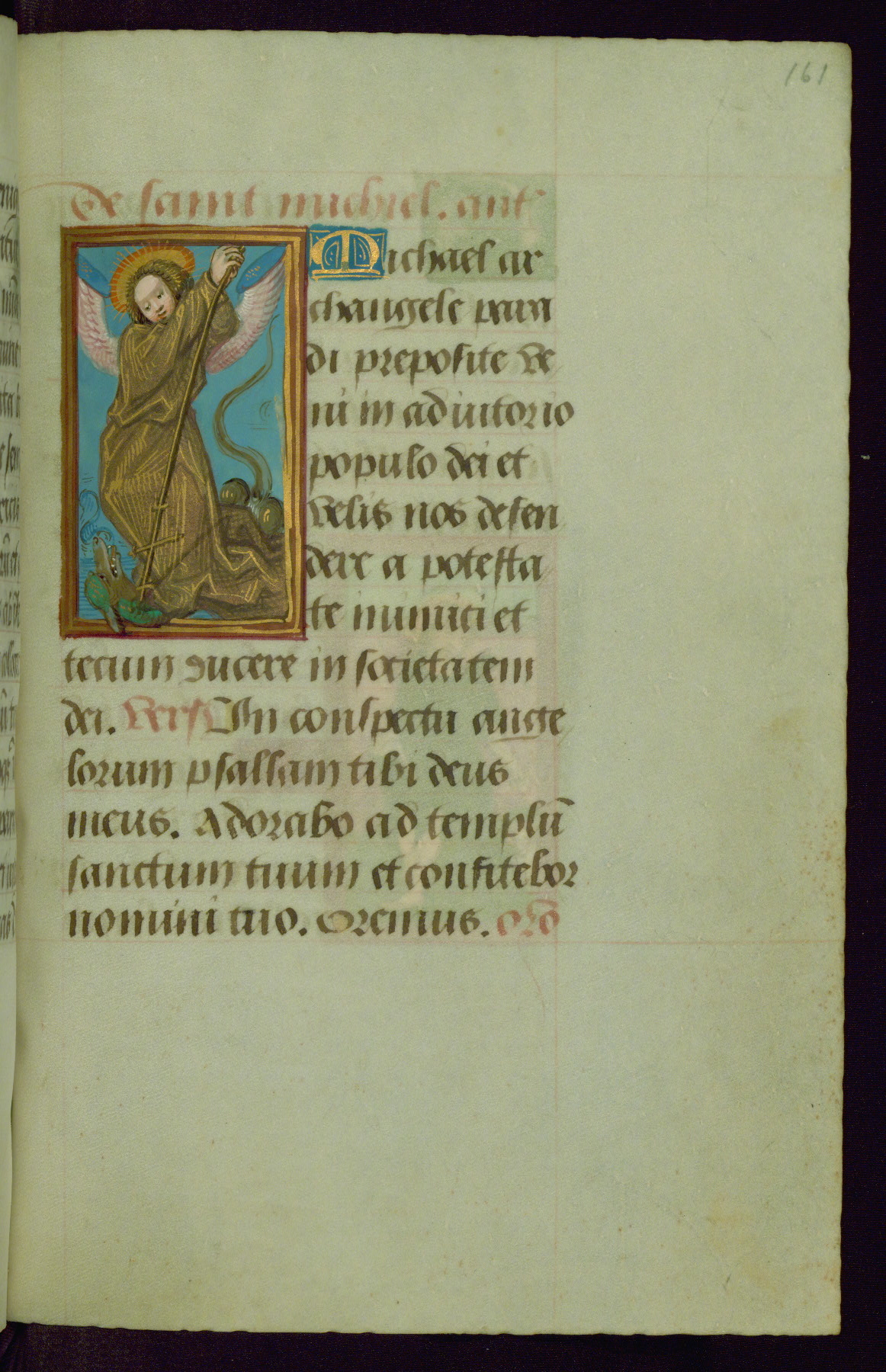 - Contents: Devotional sequence; fols. 161r-180v: twenty-one suffrages, sixteen to male saints (one pair) and six to female saints; typically headed "De Saint . . . sainct" and "De sainte . . . saincte . . . ."; intercalated quatrains to All Apostles, Andrew, Vincent, Martin: Michael, John the Baptist, John the Evangelist, Peter and Paul, Andrew quatrain, James the Greater, Stephen, Lawrence, Christopher, Sebastian, Nicholas, Claudius, Jerome, Francis, Anthony, Adrian, Martin, Anne, Mary Magdalene, Catherine, Margaret (heading cites to Barbara by mistake, "De sainte barbe."), "Virgo gloriosa Christi margaretha virginum gemma preciosissima . . . .," Barbara, and Apollonia; fols. 180v-181v: two communion prayers; fols. 181v-183r: prayer lamenting sorrow of the Virgin by the Cross; fol. 183r-v: "Versus"; fols. 184r-185v: Seven Prayers of St. Gregory; fol. 185v: closing prayer; fols. 185v-186r: Communion prayers; fols. 186r-v: Prayer to the Virgin; fols. 187v-188r: Prayers to Christ on the Cross, beginning with quatrain, recitation of fourth prayer on the Passion yields unspecified period of indulgence, "Salutation quand on pense a dieu crucifie. In cruce pendentem. rogo te deum omnipotentem. Ut michi des mentem. Semper te amare volentem"; fol. 188r-v: "Oroison"