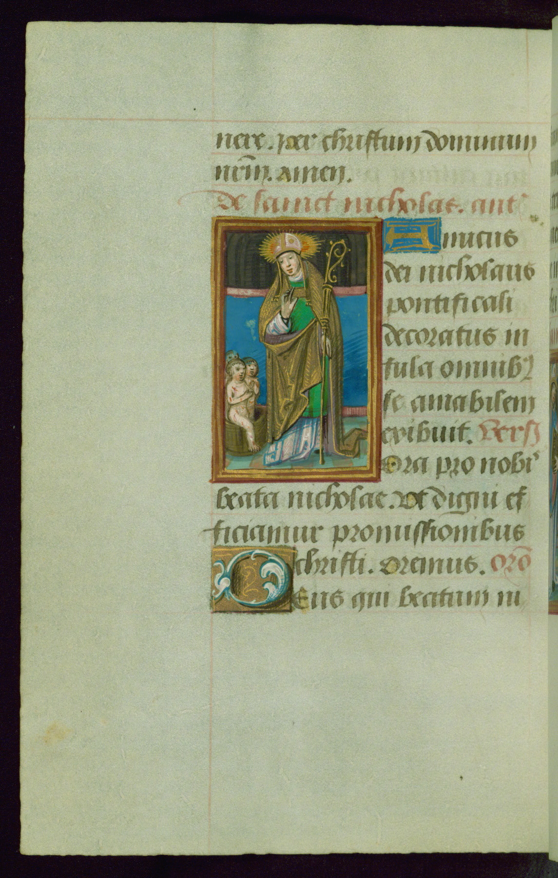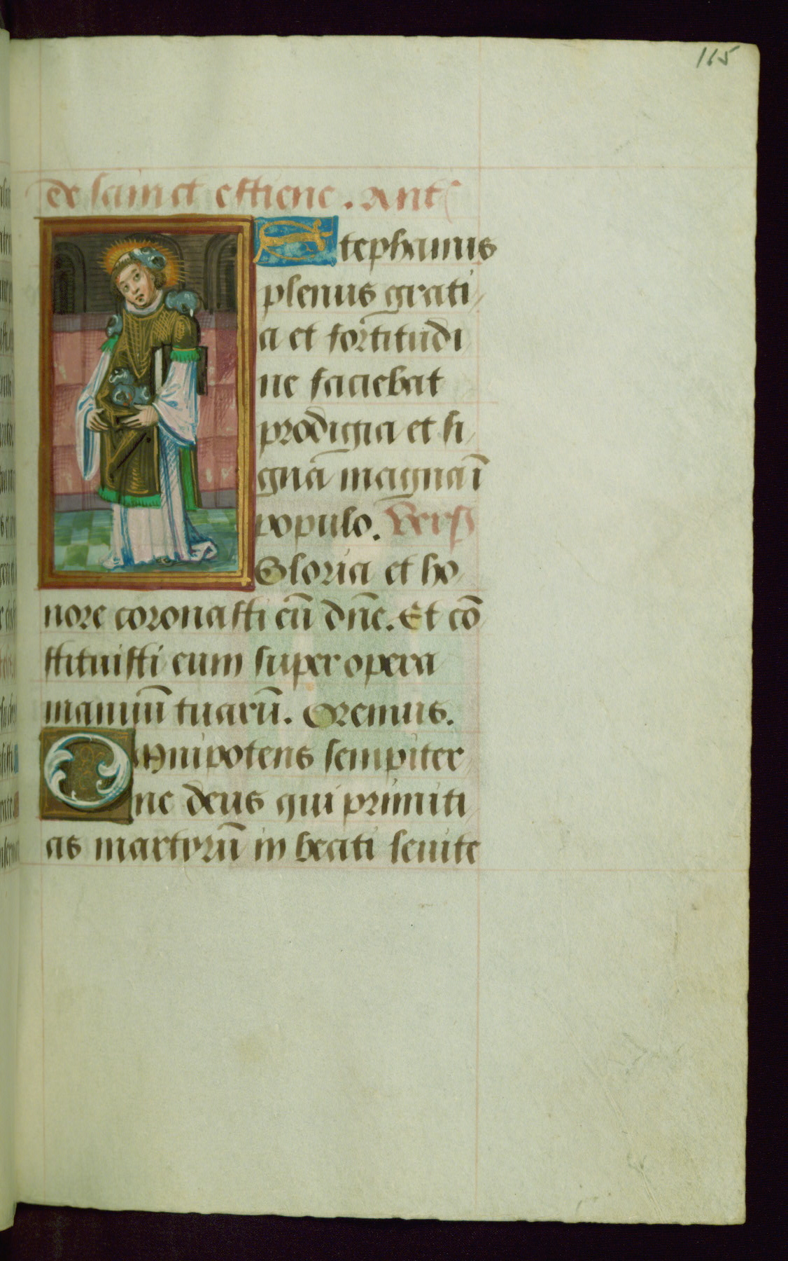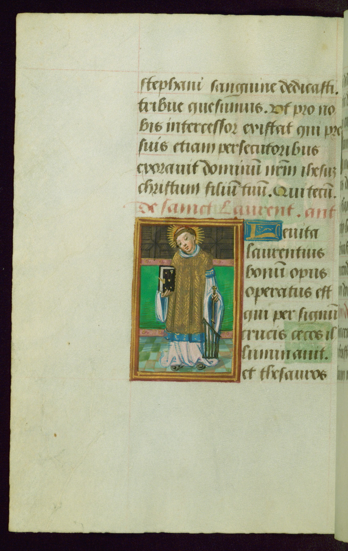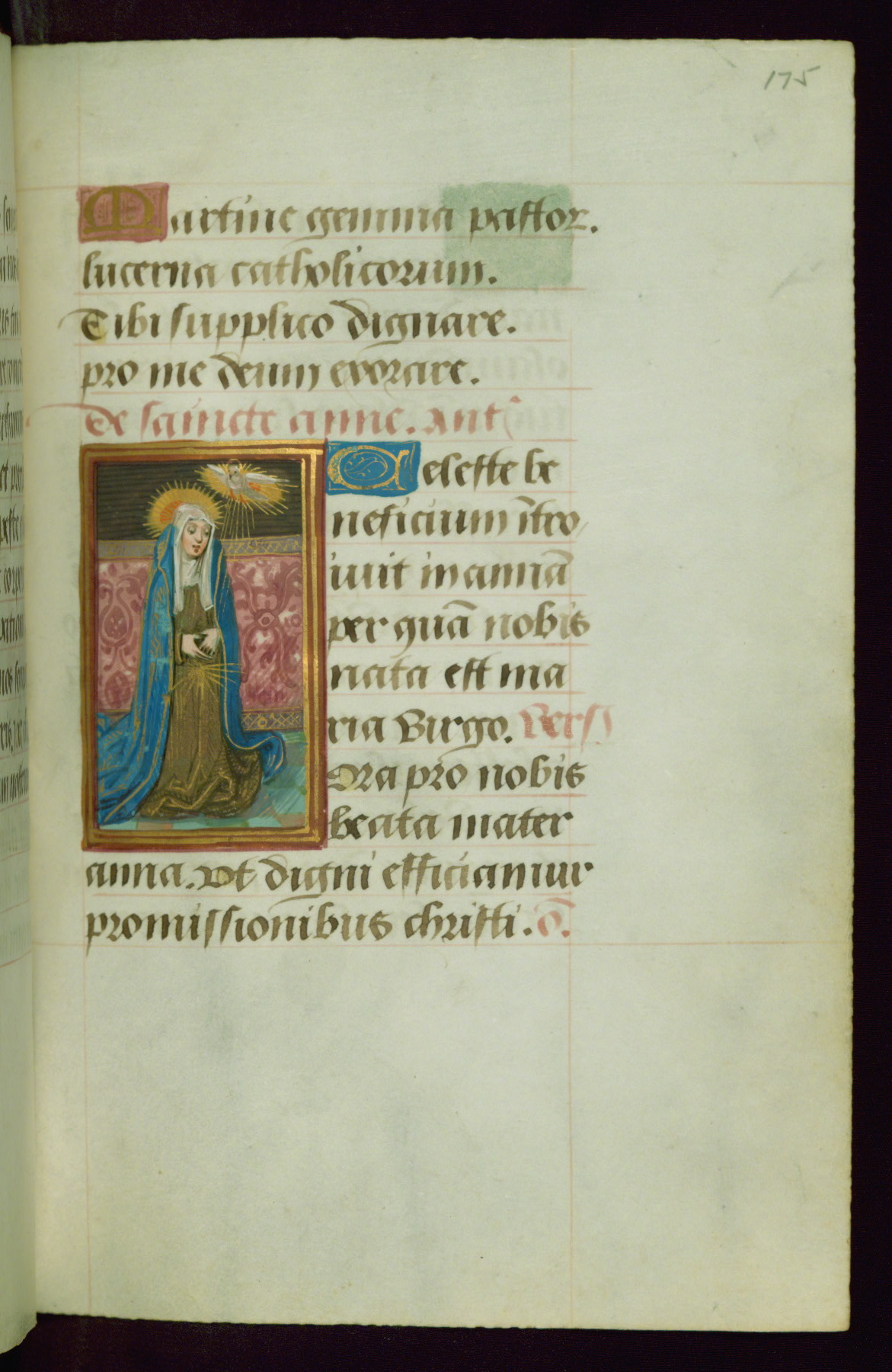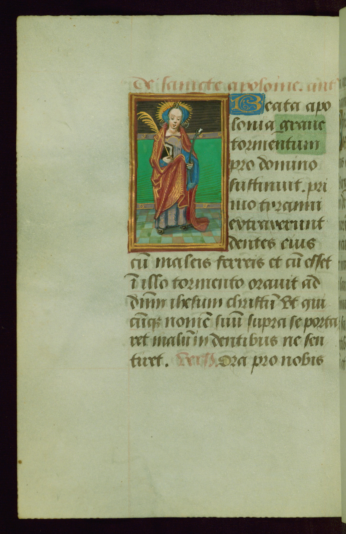 - Contents: Calendar in French, one-fourth to one-half filled; graded in pale red and brown ink; names preceded by "Saint" or "Sainte," followed by punctus; contents composite, including saints of the dioceses of Tournai and Cambrai with some English saints; feasts of note include: William (Jan. 1, "guillame," bishop of Bourges), Vincent (Jan. 22), Aldegund (Jan. 30), Audebert (Feb. 27), Thomas Aquinas (Mar. 7, Dominican), Leo I (Mar. 14), Sabina (Mar. 31), Helen (Apr. 5, irregular date), Autbert (Apr. 10; also Feb. 27), Maximus (Apr. 15), Firminus (Apr. 18; cf. Sept. 14), Peter (Apr. 29, martyr, Dominican), Victor (May 14), Honoratus (May 22, "honnoure"), Bede (May 27), Petronilla (May 31, "pieronnelle"), Quirinus (Jun. 4), Basil (Jun. 14), Romanus (Jun. 17), Vedast (Jul. 15), Christina (Jul. 24), James the Greater and Christopher (Jul. 25), Dominic (Aug. 4, "dominicque"), Arnold (Aug. 16), Louis of France (Aug. 25), Firminus (Sept. 25, bishop of Amiens), Remigius and Piatus (Oct. 1, latter indicative of Tournai), Dionysius and Ghislain (Oct. 9, latter indicative of Tournai), Edward (Oct. 13), Leonard (Nov. 6, "lienard"), Brictius (Nov. 13, "brice"), Lucy (Dec. 13, "Luce"), Thomas Becket (Dec. 29, "thomas de catorbie"); fol. 16r-v, blank