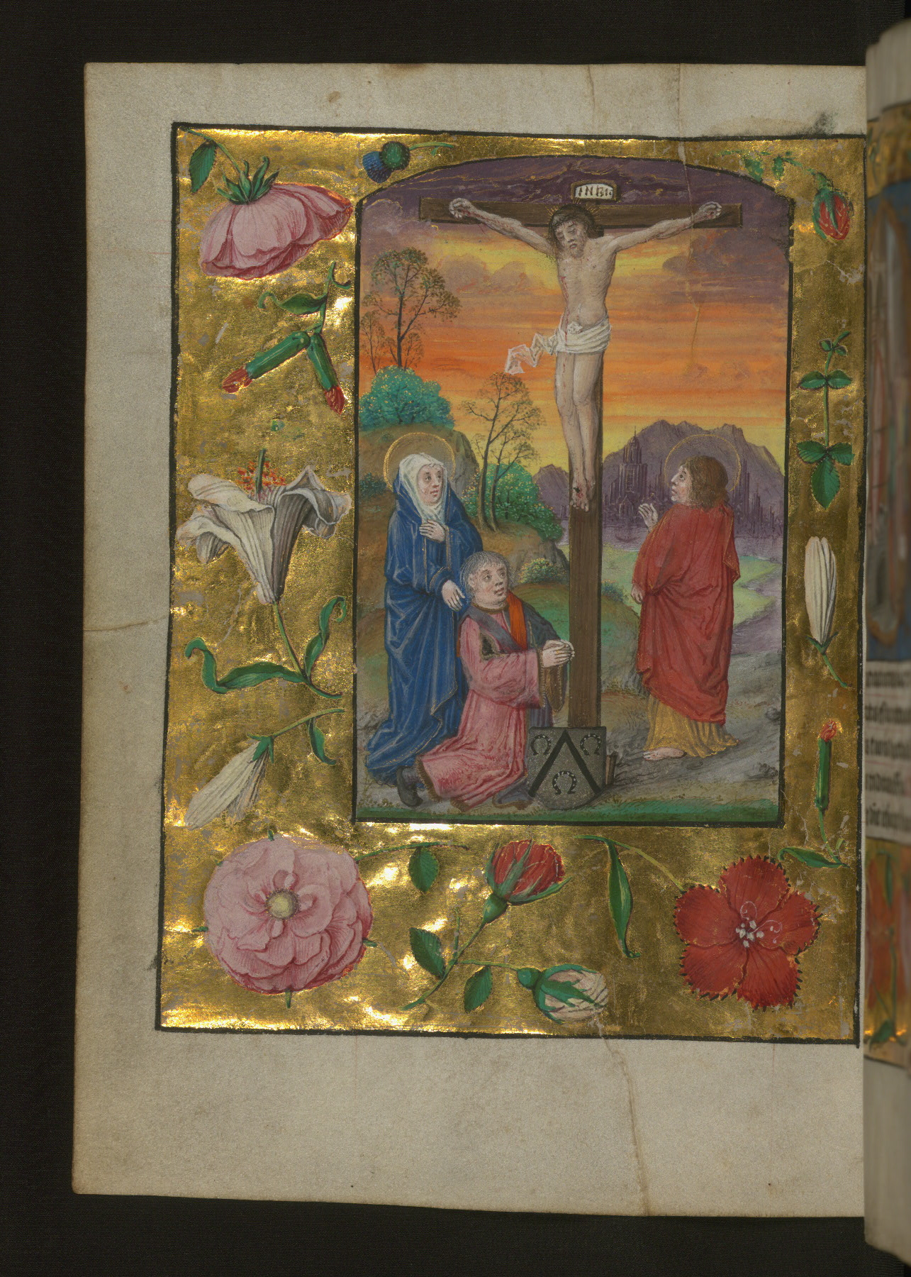 - Title: Crucifixion with Mary, John, and a donor with Aussem coat of arms, with gold and floral margins