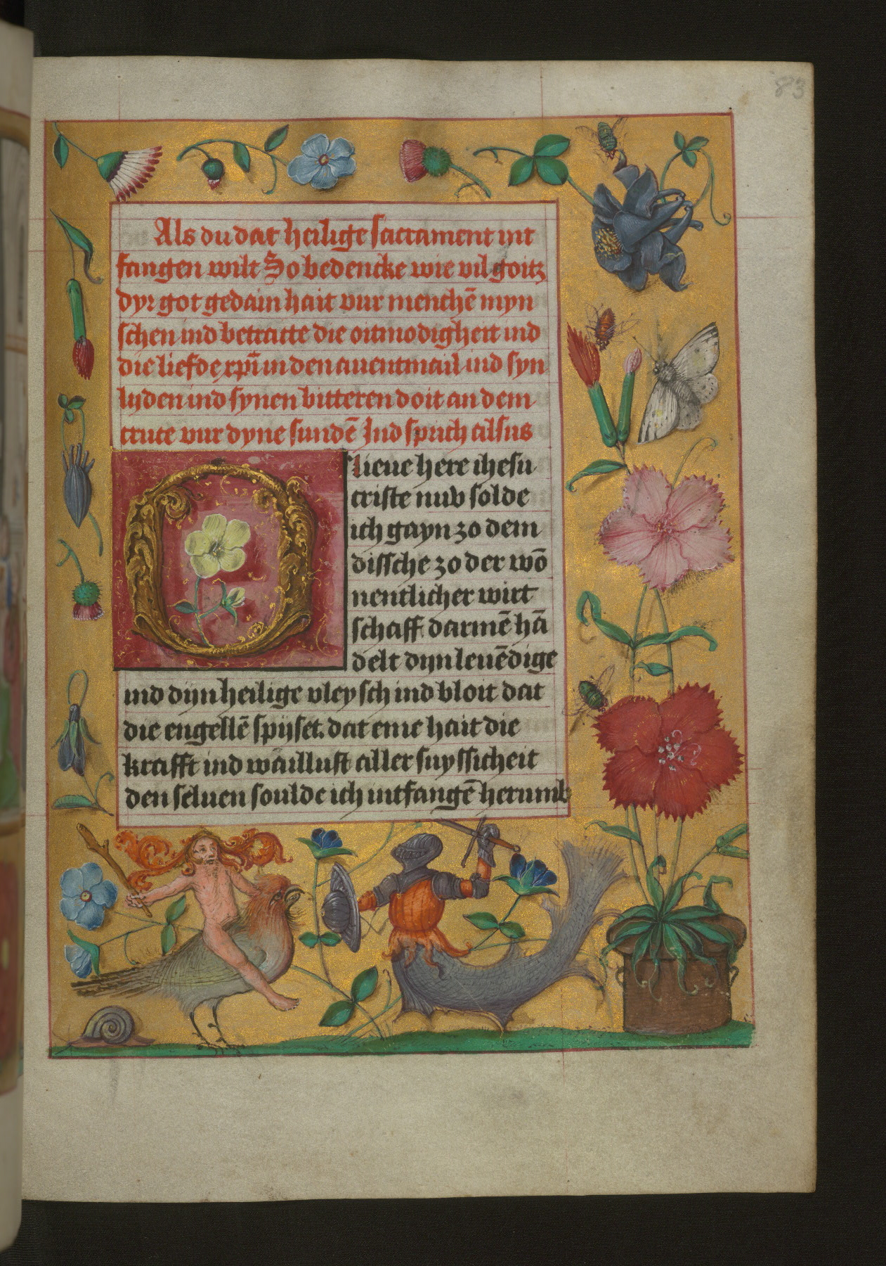 - Title: Foliate initial "O" with flowers and hybrid creatures in margins