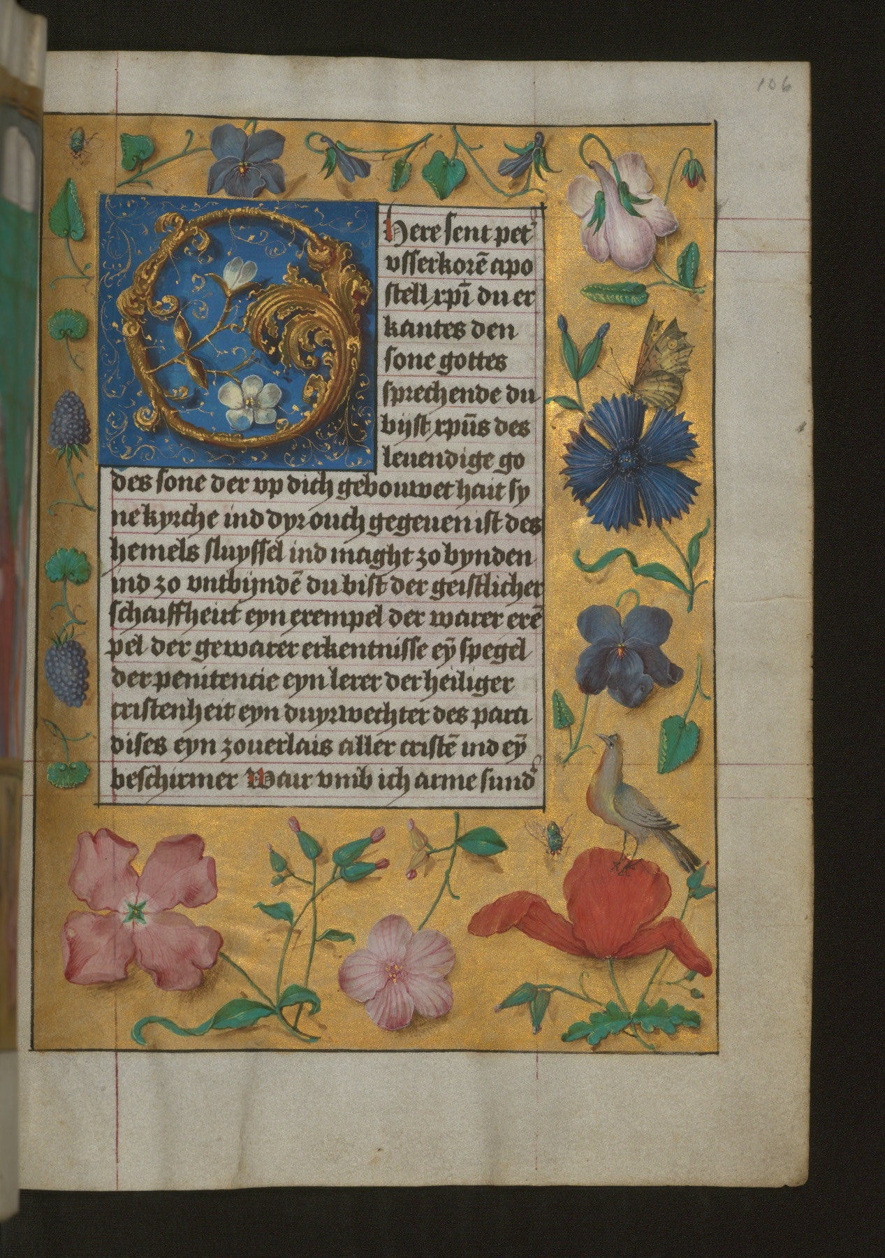 - Decoration note: Full-page miniature, fol. 105v; decorated initial within matching foliate marginal illumination, fol. 106r