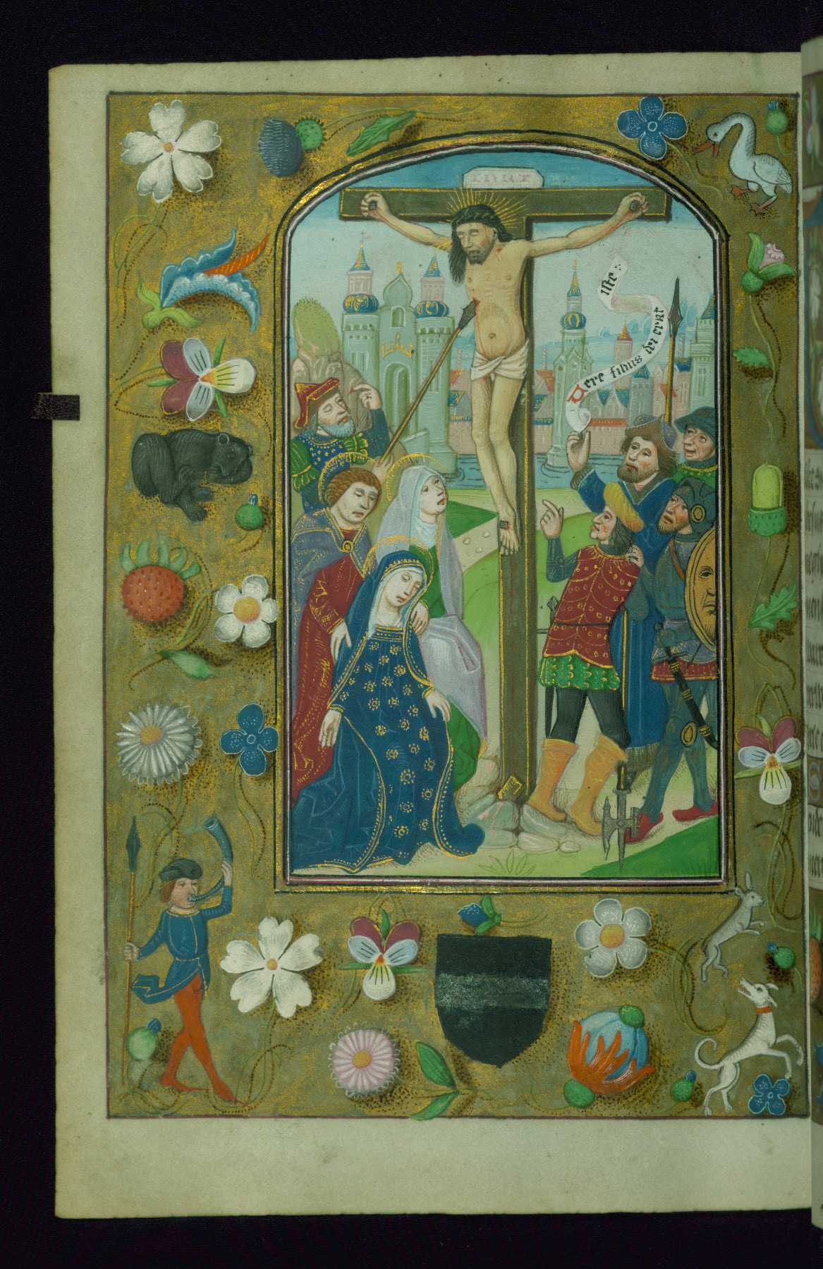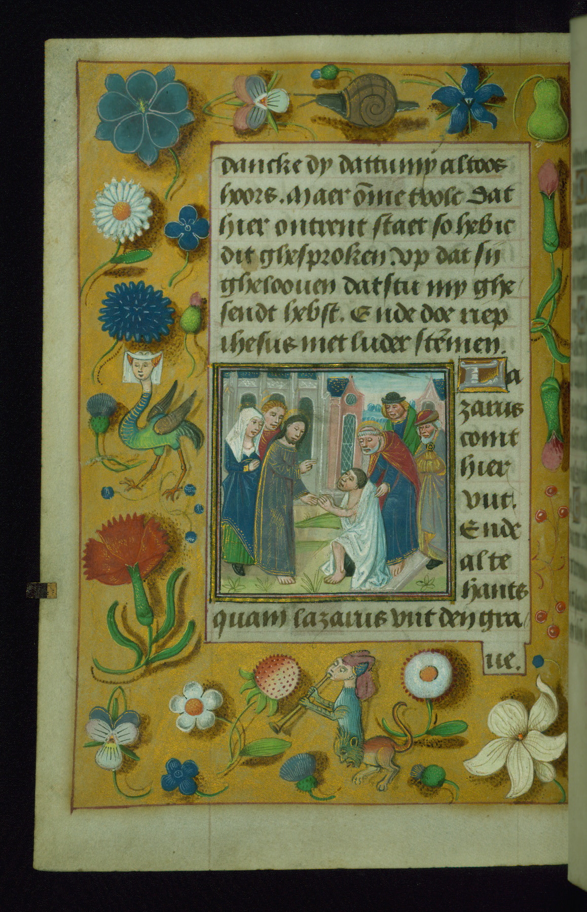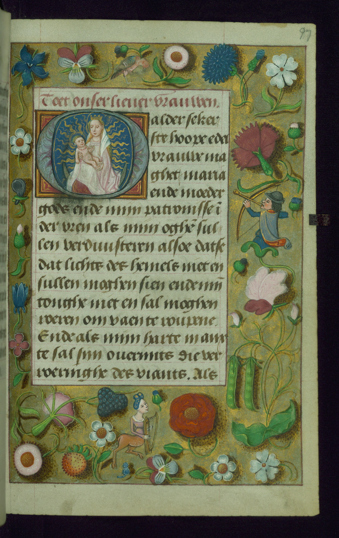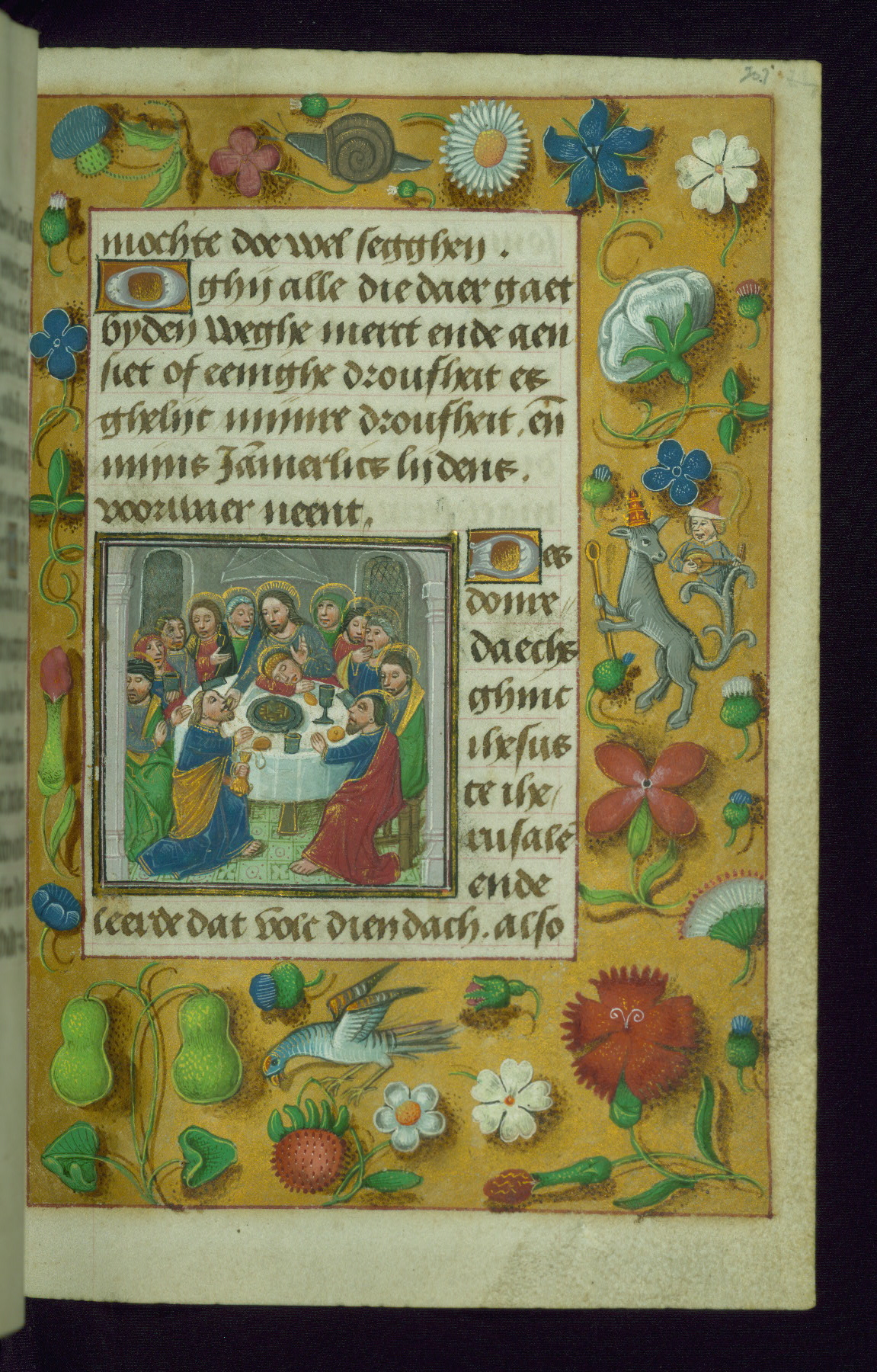 - Decoration note: Fourteen full-page miniatures; six miniatures (8 lines); eight historiated initials (5-7 lines); decorated illuminated initials with gray and blue letters against a gold background (6 lines); initials opposite full-page miniatures alternate between blue and silver-leaf letters and rust and gold letters, and same applies to backgrounds of said initials (5-6 lines); secondary decorated initials with white acanthus-formed letters against brown, gold-specked backgrounds (2-3 lines); grisaille line fillers in litany (fols.116v-121r), alternating between disks and half-blossom petals; liquid gold borders throughout text, depictions include: angels, musicians, lewd drolleries, and many motifs reminiscent of Master of the Playing Cards (most prominently fols. 100r, 101v, 159v, 166v, 263v, 344v); rubrics in red; text in varying light-dark brown ink