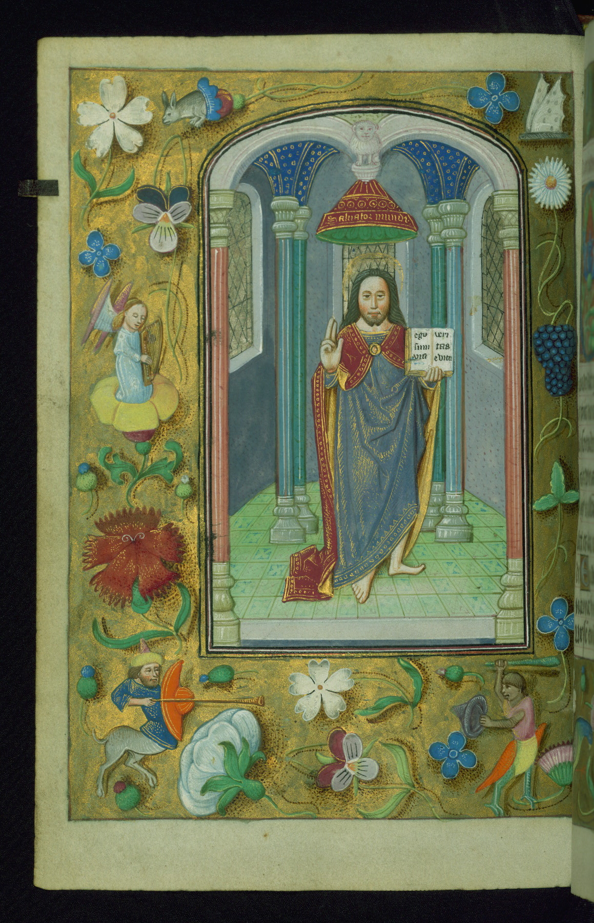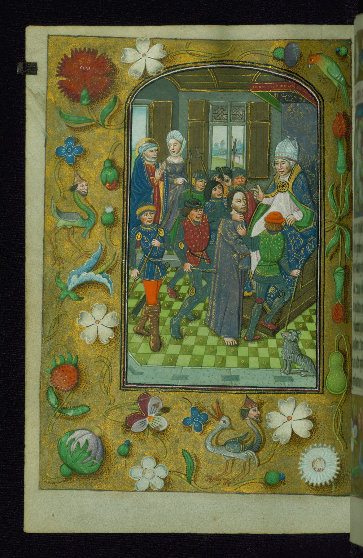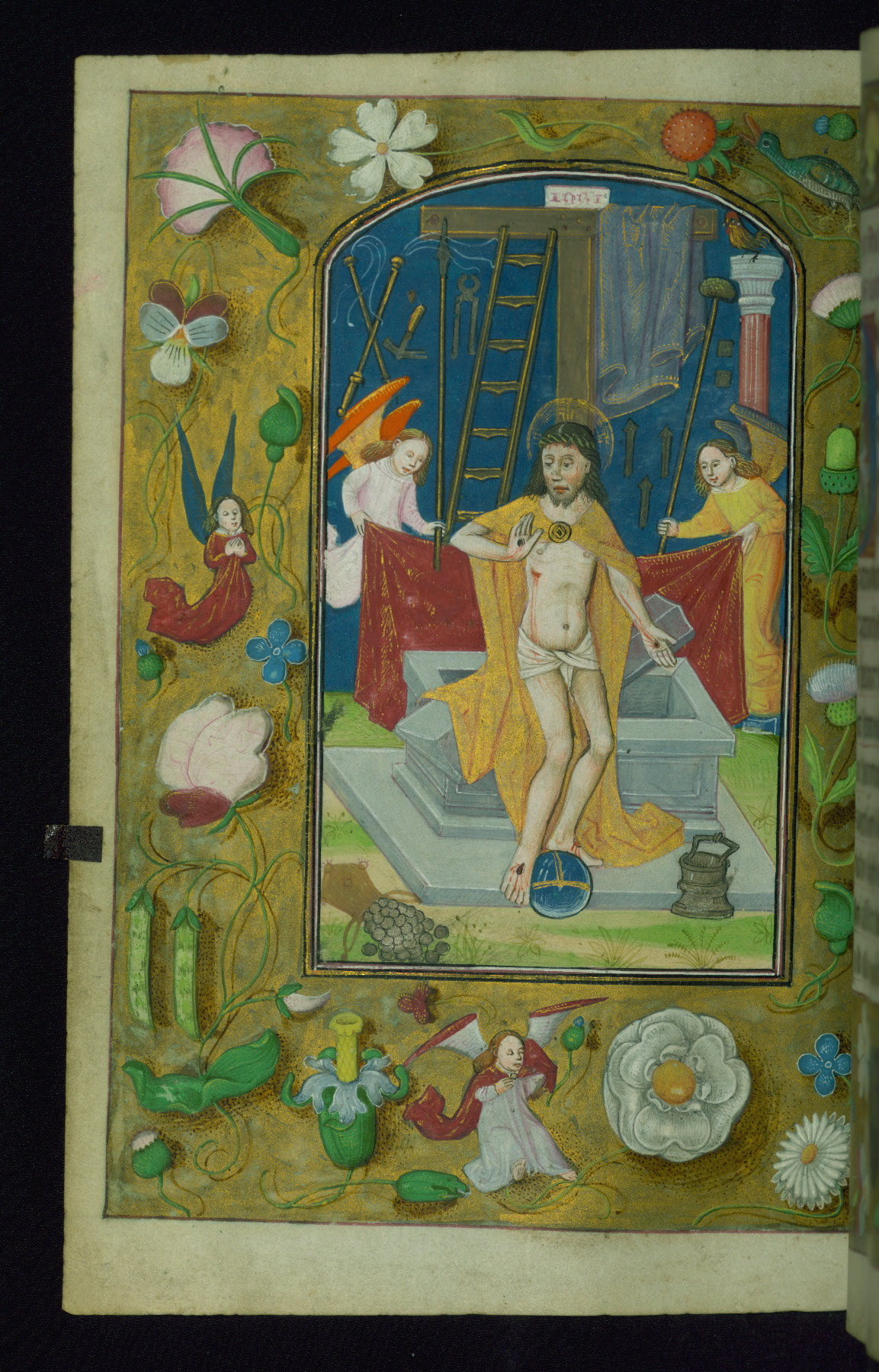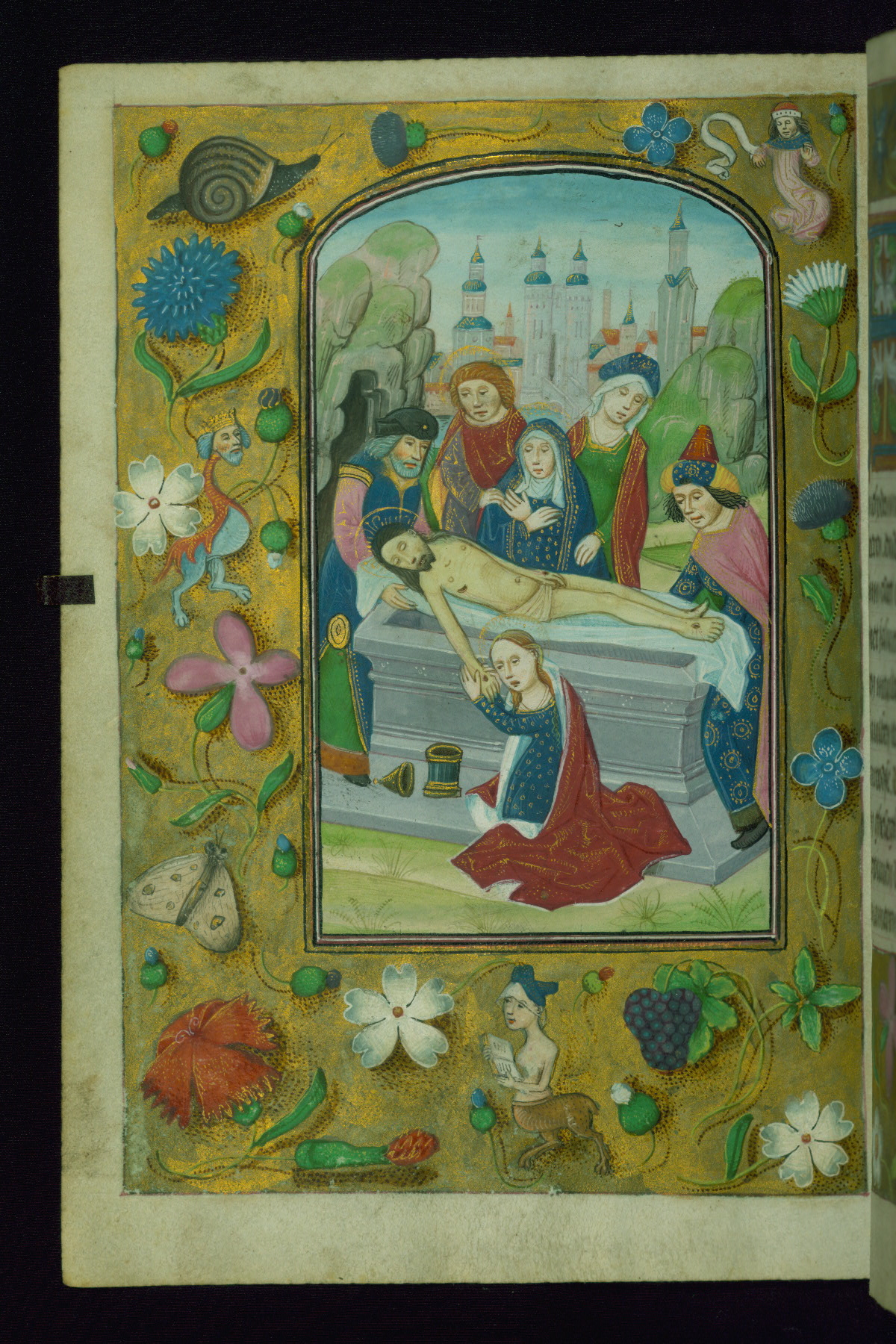 - Decoration note: Fourteen full-page miniatures; six miniatures (8 lines); eight historiated initials (5-7 lines); decorated illuminated initials with gray and blue letters against a gold background (6 lines); initials opposite full-page miniatures alternate between blue and silver-leaf letters and rust and gold letters, and same applies to backgrounds of said initials (5-6 lines); secondary decorated initials with white acanthus-formed letters against brown, gold-specked backgrounds (2-3 lines); grisaille line fillers in litany (fols.116v-121r), alternating between disks and half-blossom petals; liquid gold borders throughout text, depictions include: angels, musicians, lewd drolleries, and many motifs reminiscent of Master of the Playing Cards (most prominently fols. 100r, 101v, 159v, 166v, 263v, 344v); rubrics in red; text in varying light-dark brown ink