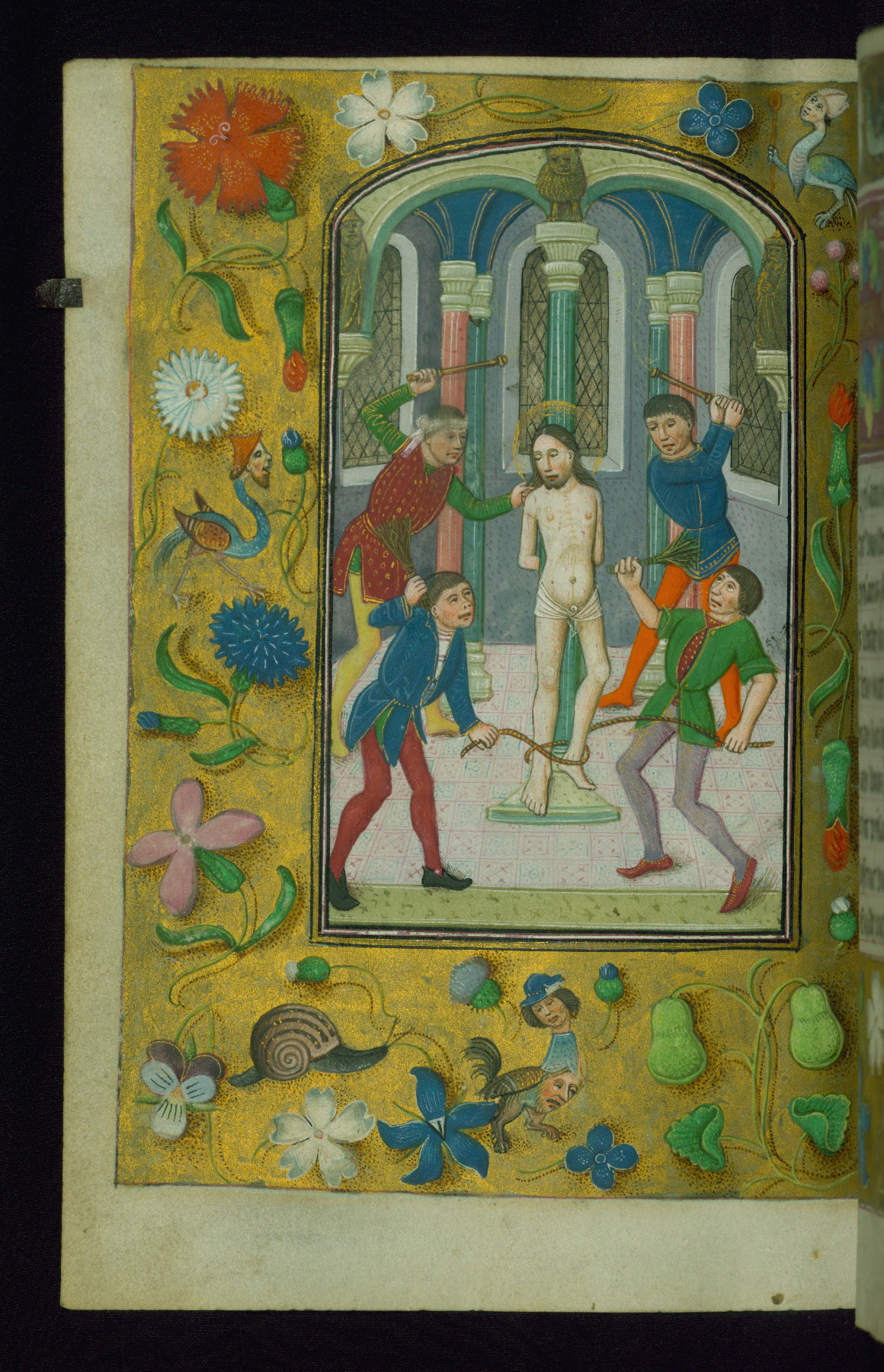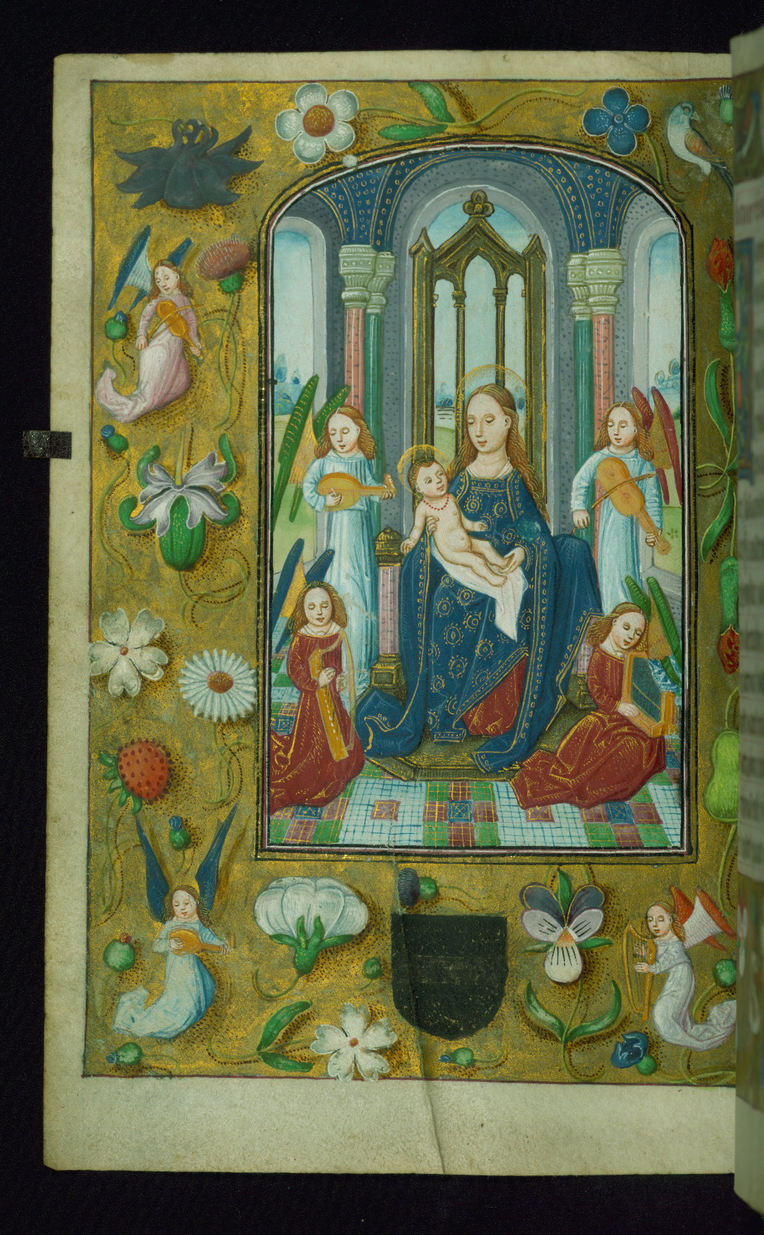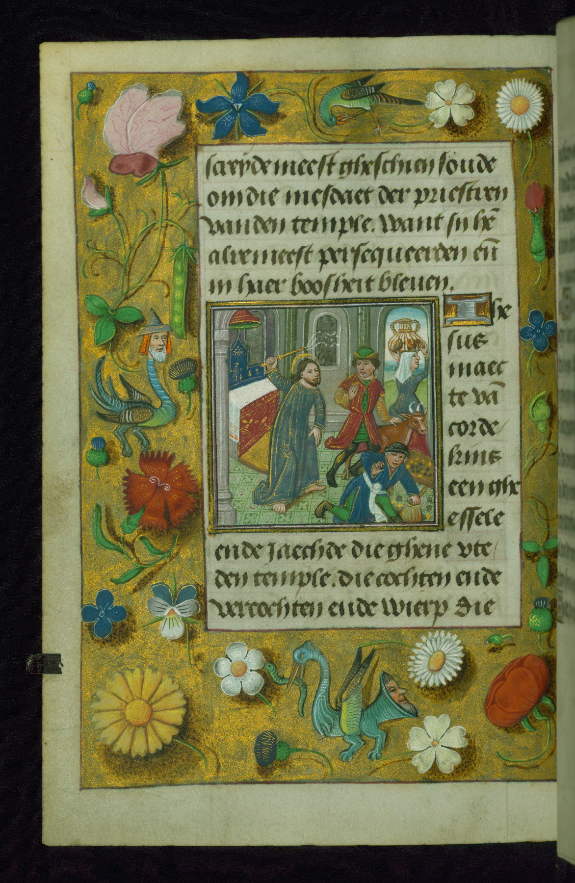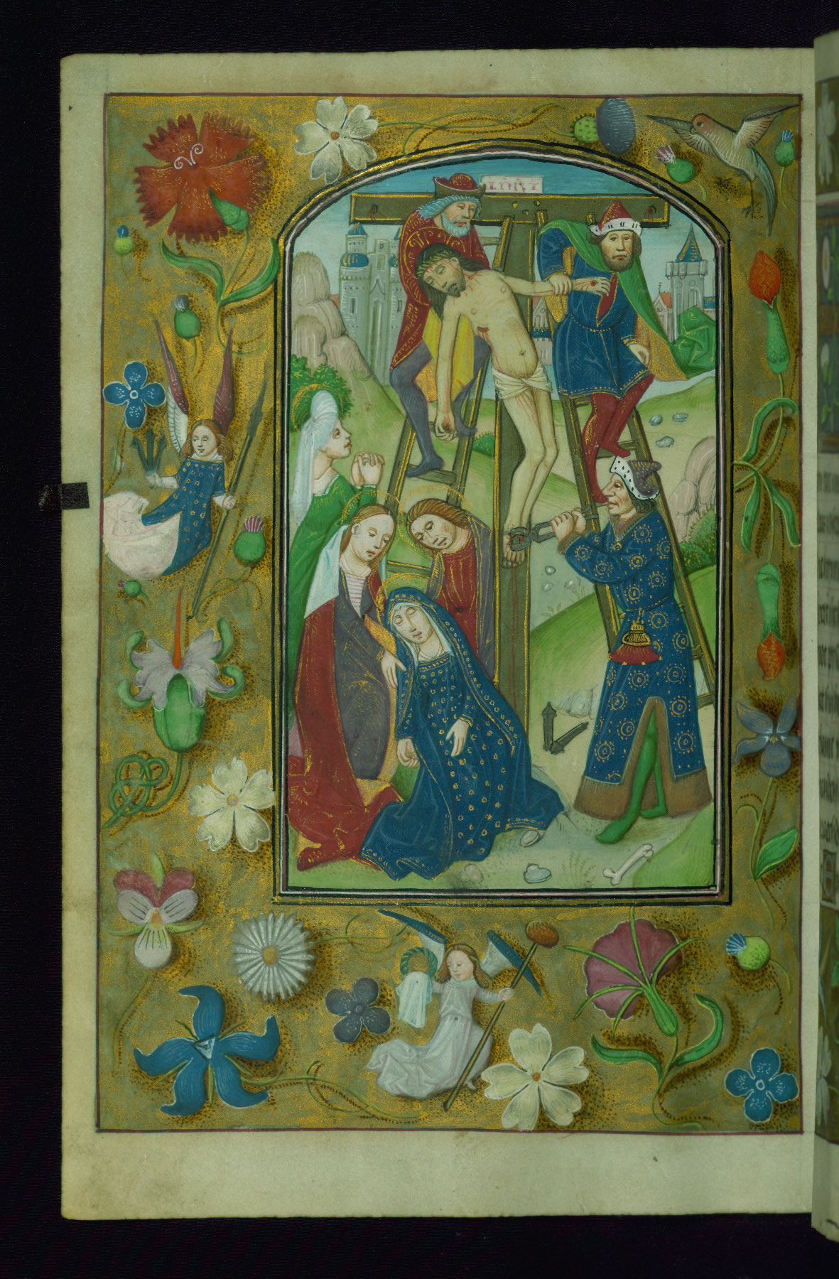 - Decoration note: Fourteen full-page miniatures; six miniatures (8 lines); eight historiated initials (5-7 lines); decorated illuminated initials with gray and blue letters against a gold background (6 lines); initials opposite full-page miniatures alternate between blue and silver-leaf letters and rust and gold letters, and same applies to backgrounds of said initials (5-6 lines); secondary decorated initials with white acanthus-formed letters against brown, gold-specked backgrounds (2-3 lines); grisaille line fillers in litany (fols.116v-121r), alternating between disks and half-blossom petals; liquid gold borders throughout text, depictions include: angels, musicians, lewd drolleries, and many motifs reminiscent of Master of the Playing Cards (most prominently fols. 100r, 101v, 159v, 166v, 263v, 344v); rubrics in red; text in varying light-dark brown ink