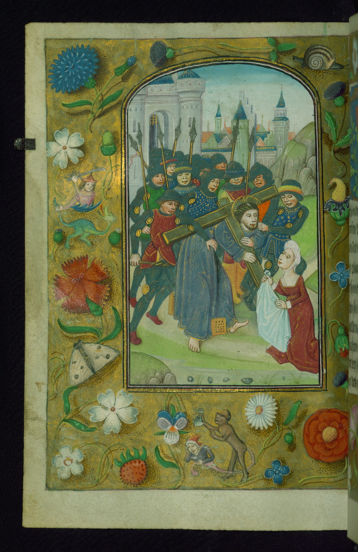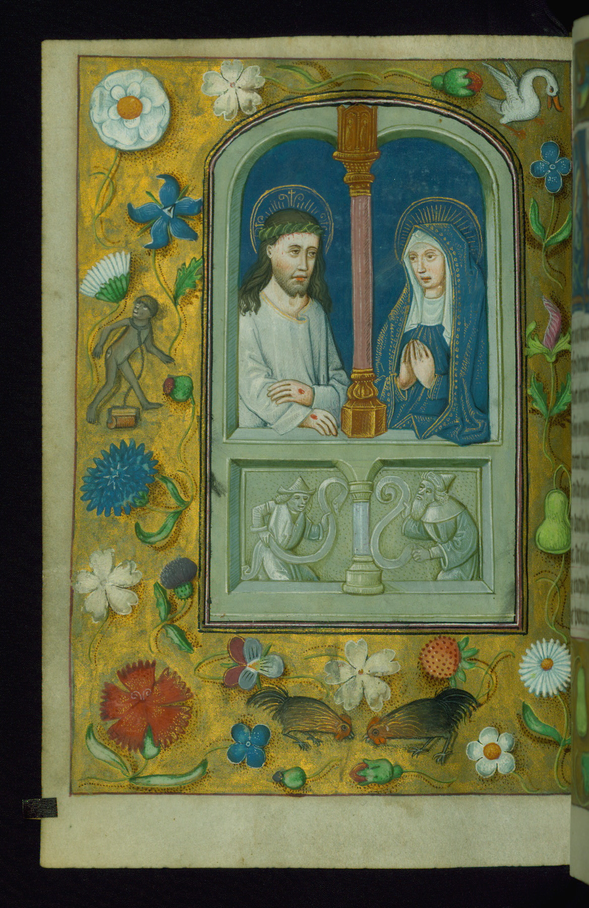 This late fifteenth-century Prayer Book was made for the Use of Rome and illuminated by followers of Willem Vrelant of Bruges. The manuscript was probably created for the couple depicted in two full-page miniatures (fols. 13v and 103r). The representation of the bride in the full-page miniatures, as well as references to her in suppliant prayers, indicates that the manuscript was commissioned primarily for the bride’s use. Further evidence of this is the prominence of women throughout the illuminations and drolleries, from one who was caught in adultery being brought before Christ, to Veronica extending her veil to Christ as he carries the cross. The decorative aspects of the manuscript stray from the typical border designs of this time period, focusing more on illusionistic Ghent-Bruges’ illumination (post-1475) and less on the Vrelant acanthus-floral borders. Among the number of full-page miniatures, fol. 229v stands out as an exceptional example of an imitation of a late fifteenth-century panel painting.