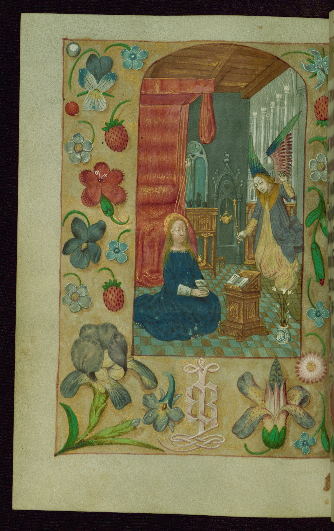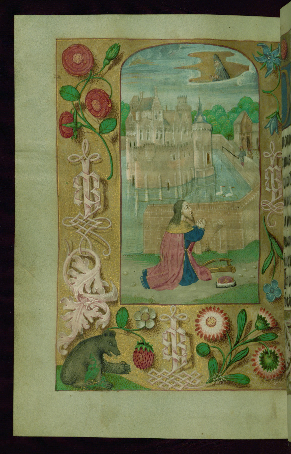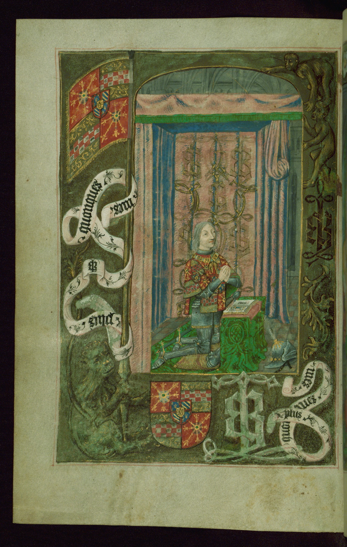 This Book of Hours was completed in the 1480s for Adolph, duke of Cleves, count of La Mack, lord of Ravenstein and Wijnendale (1425-92), and member of the entourage of the dukes of Burgundy until 1477 and thereafter in a position of personal trust under Archduke Maximilian, husband of Mary of Burgundy (d. 1482). The manuscript is highly illuminated and includes two portraits of Adolph of Ghent: a full-page miniature portraying the duke kneeling before a portrait of the Virgin and Child (fol. 13v), and a smaller portrait of Adolph revering the Virgin in an initial at the opening of a prayer to Mary (fol. 80v, "O beatissima virgo Maria"). The manuscript was likely made after the year 1470, when Adolph of Cleves married his second wife Anne of Burgundy (1441-1508). The presence of an inscription by Anne of Burgundy (fol. 71r: "A / B votre mieulx aimee / Anne") suggests that she may have commissioned the volume. A full-page illumination of Adolph of Cleves' heraldry includes the collar of the Order of the Golden Fleece, an order of chivalry founded in Bruges by Philip III, duke of Burgundy.
