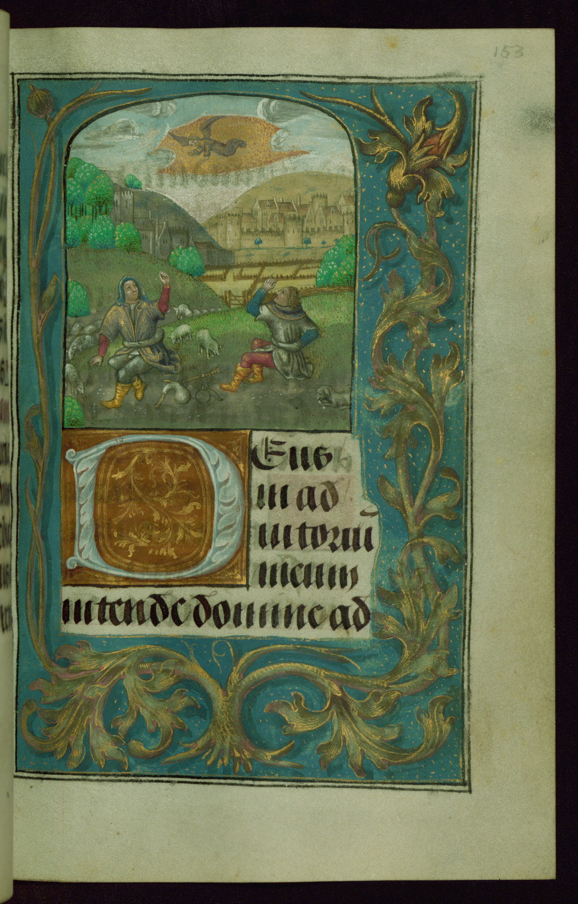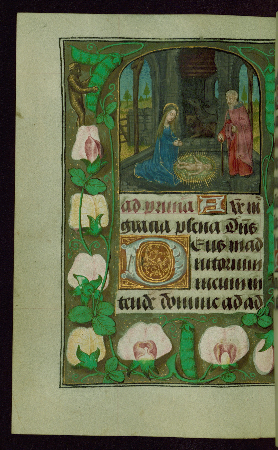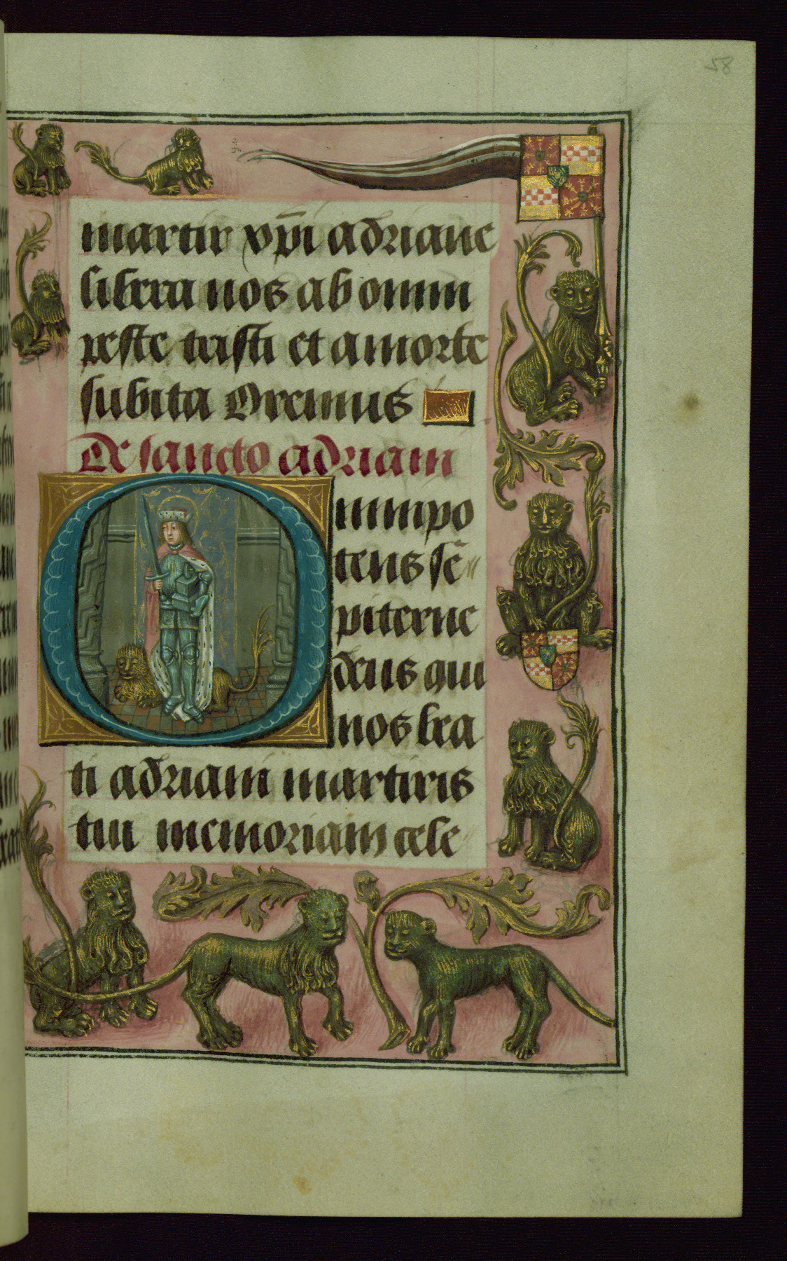 This Book of Hours was completed in the 1480s for Adolph, duke of Cleves, count of La Mack, lord of Ravenstein and Wijnendale (1425-92), and member of the entourage of the dukes of Burgundy until 1477 and thereafter in a position of personal trust under Archduke Maximilian, husband of Mary of Burgundy (d. 1482). The manuscript is highly illuminated and includes two portraits of Adolph of Ghent: a full-page miniature portraying the duke kneeling before a portrait of the Virgin and Child (fol. 13v), and a smaller portrait of Adolph revering the Virgin in an initial at the opening of a prayer to Mary (fol. 80v, "O beatissima virgo Maria"). The manuscript was likely made after the year 1470, when Adolph of Cleves married his second wife Anne of Burgundy (1441-1508). The presence of an inscription by Anne of Burgundy (fol. 71r: "A / B votre mieulx aimee / Anne") suggests that she may have commissioned the volume. A full-page illumination of Adolph of Cleves' heraldry includes the collar of the Order of the Golden Fleece, an order of chivalry founded in Bruges by Philip III, duke of Burgundy.