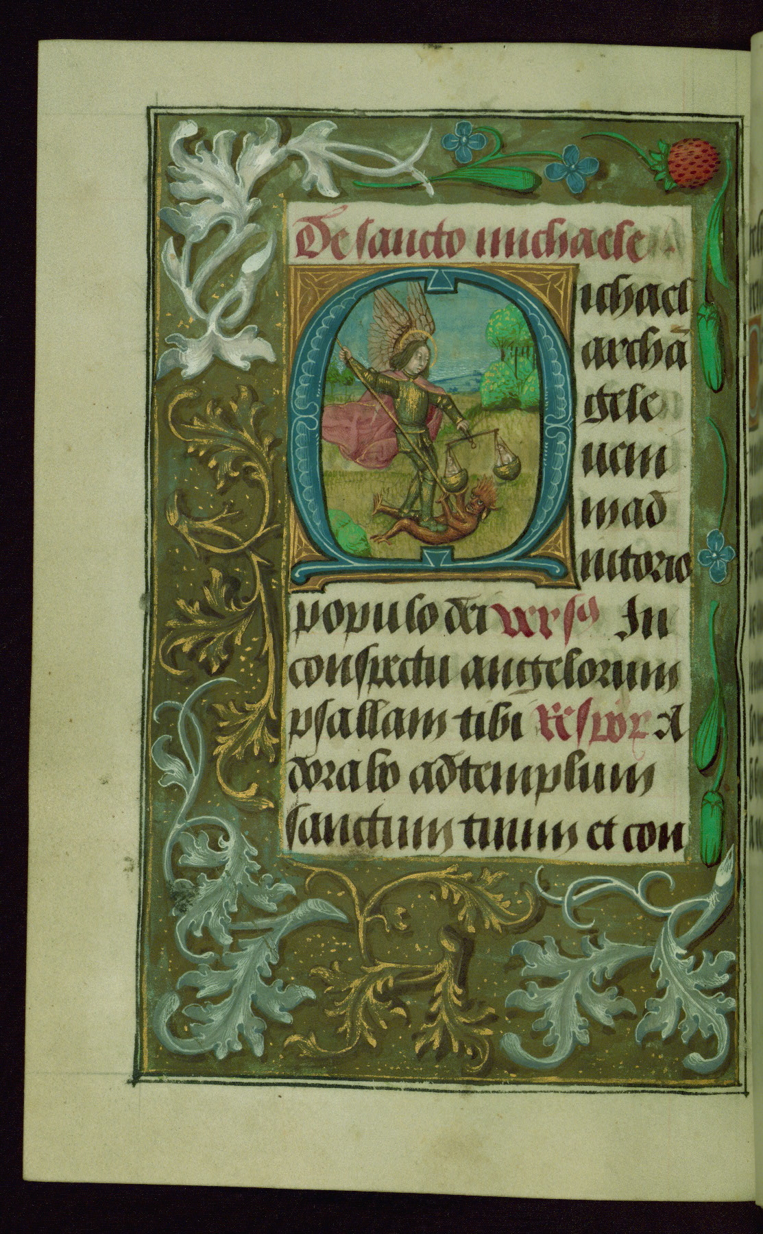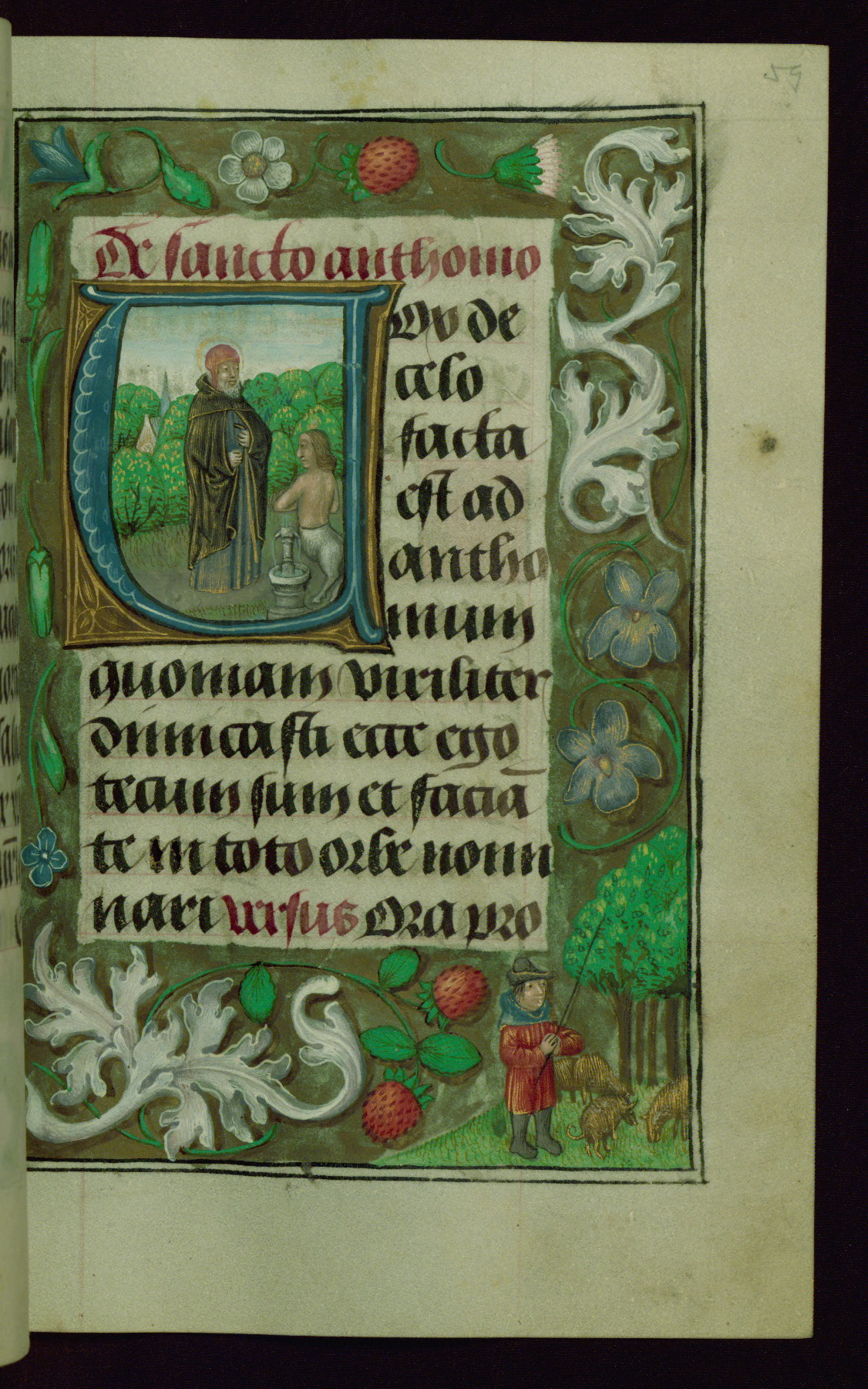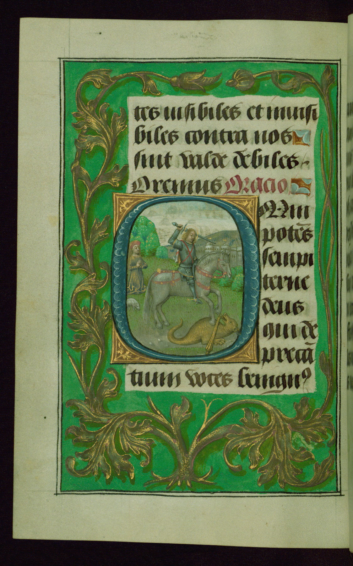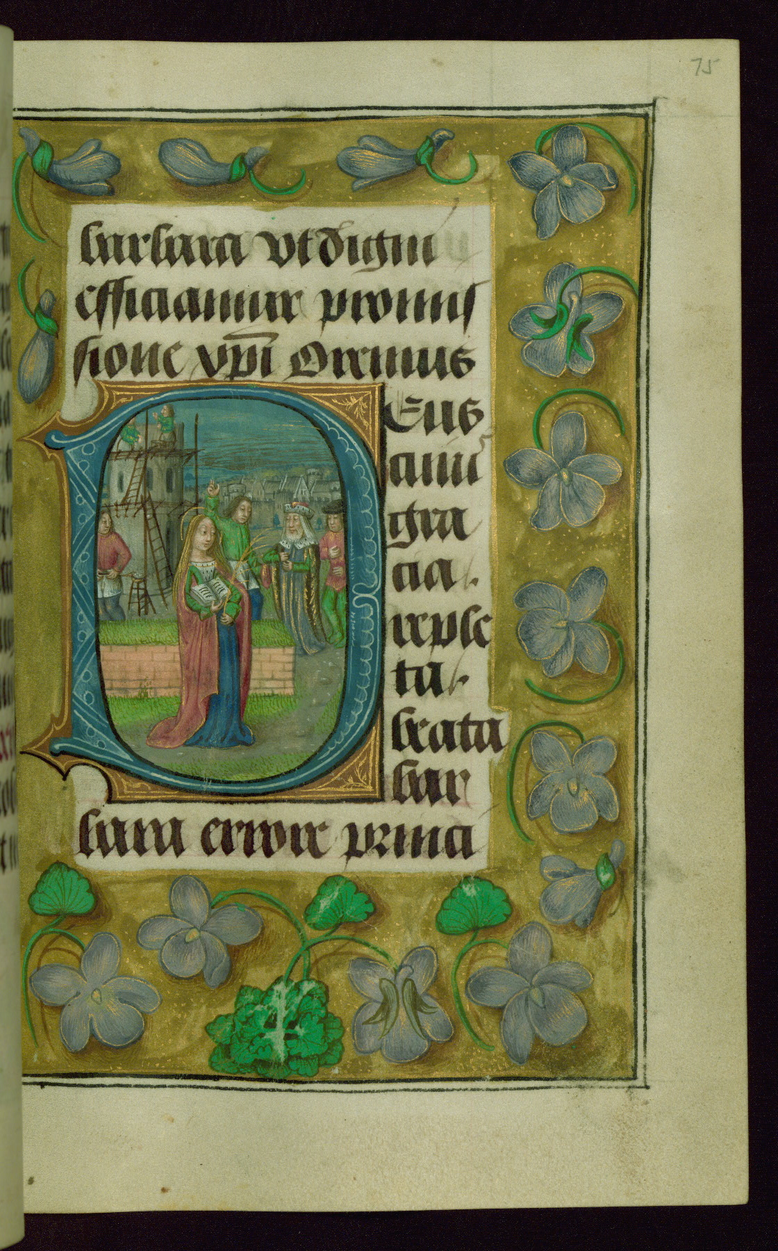 - Contents: Suffrages: fols. 51v-54r: Claudius: O desolatorum concolator. . .; fols. 54r-57r: Sebastian: O sancte sebastiane. . .; fols. 57r-58v: Adrian: Ave sancte Adriane. . .; fols. 59r-60v: Anthony: Vox de celo facta est. . .; fols. 60v-62v: Michael: Michael archangele veni adiutorio. . .; fols. 62v-63v: George: Omnipotens sempiterne Deus. . .; fols. 63v-65r: Nicholas: De sancto Nicholas. . .; fols. 65rv: Christopher: Deus qui beatum xristoforum. . .; fols. 65v-70r: Erasmus: Sancte Erasme martir. . .; fols. 70r-71r: Anne: De sancta Anna a[n]t[iphona]. . .; fols. 71v-72v: Margaret: De sancta Margareta veni sponsa xristi. . .; fols. 72r-74r: Catherine: Ave gemma claritatis. . .; fols. 74r-75v: Barbara: Ave martir Barbara. . .; fols. 75v-78r: Prayer to God, used to combat the power of devil in accordance with the revelation to st. Augustine: Oracio multum bona. . .; fols. 78r-80r: Prayer to Christ: Domine Ihesu xriste. . .; fols. 80r-87v: Four prayers to the Virgin