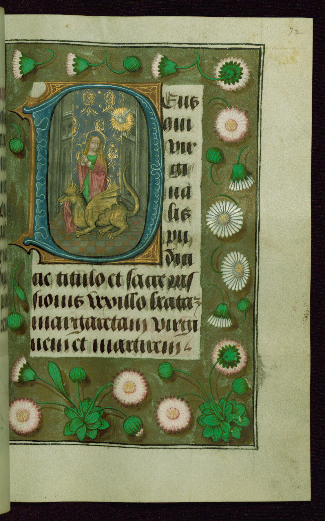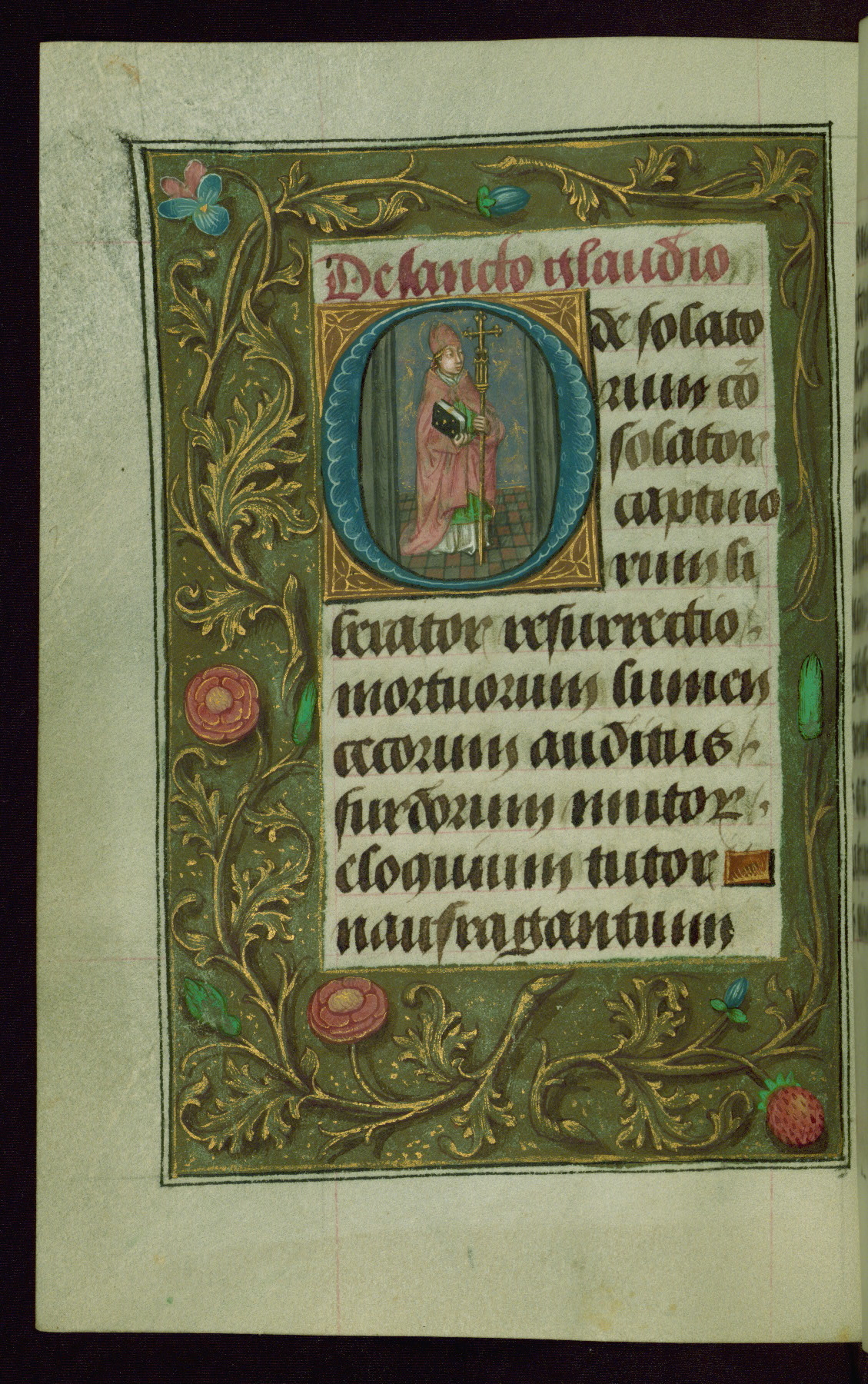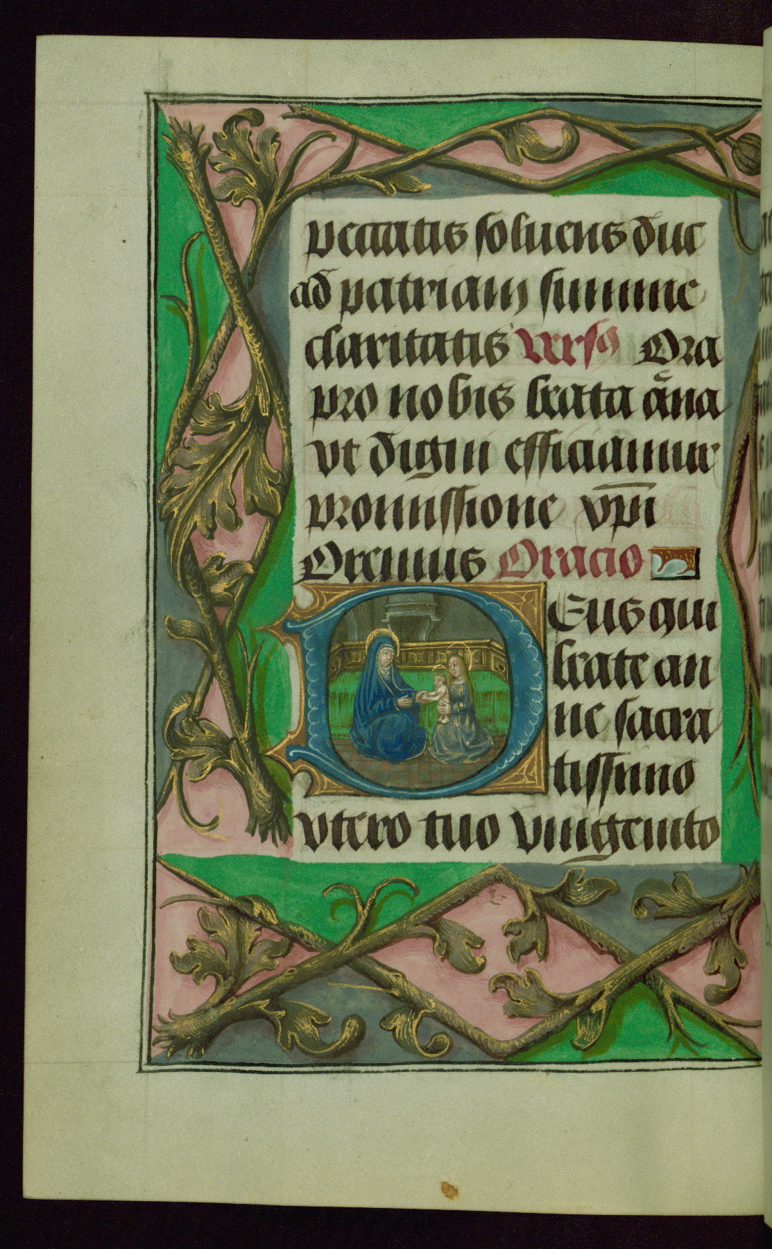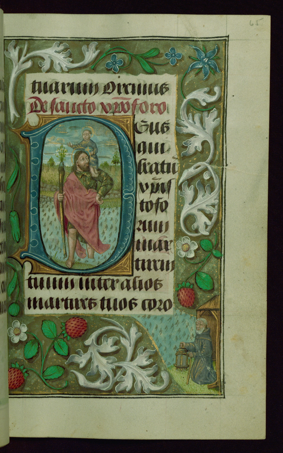 - Contents: Suffrages: fols. 51v-54r: Claudius: O desolatorum concolator. . .; fols. 54r-57r: Sebastian: O sancte sebastiane. . .; fols. 57r-58v: Adrian: Ave sancte Adriane. . .; fols. 59r-60v: Anthony: Vox de celo facta est. . .; fols. 60v-62v: Michael: Michael archangele veni adiutorio. . .; fols. 62v-63v: George: Omnipotens sempiterne Deus. . .; fols. 63v-65r: Nicholas: De sancto Nicholas. . .; fols. 65rv: Christopher: Deus qui beatum xristoforum. . .; fols. 65v-70r: Erasmus: Sancte Erasme martir. . .; fols. 70r-71r: Anne: De sancta Anna a[n]t[iphona]. . .; fols. 71v-72v: Margaret: De sancta Margareta veni sponsa xristi. . .; fols. 72r-74r: Catherine: Ave gemma claritatis. . .; fols. 74r-75v: Barbara: Ave martir Barbara. . .; fols. 75v-78r: Prayer to God, used to combat the power of devil in accordance with the revelation to st. Augustine: Oracio multum bona. . .; fols. 78r-80r: Prayer to Christ: Domine Ihesu xriste. . .; fols. 80r-87v: Four prayers to the Virgin