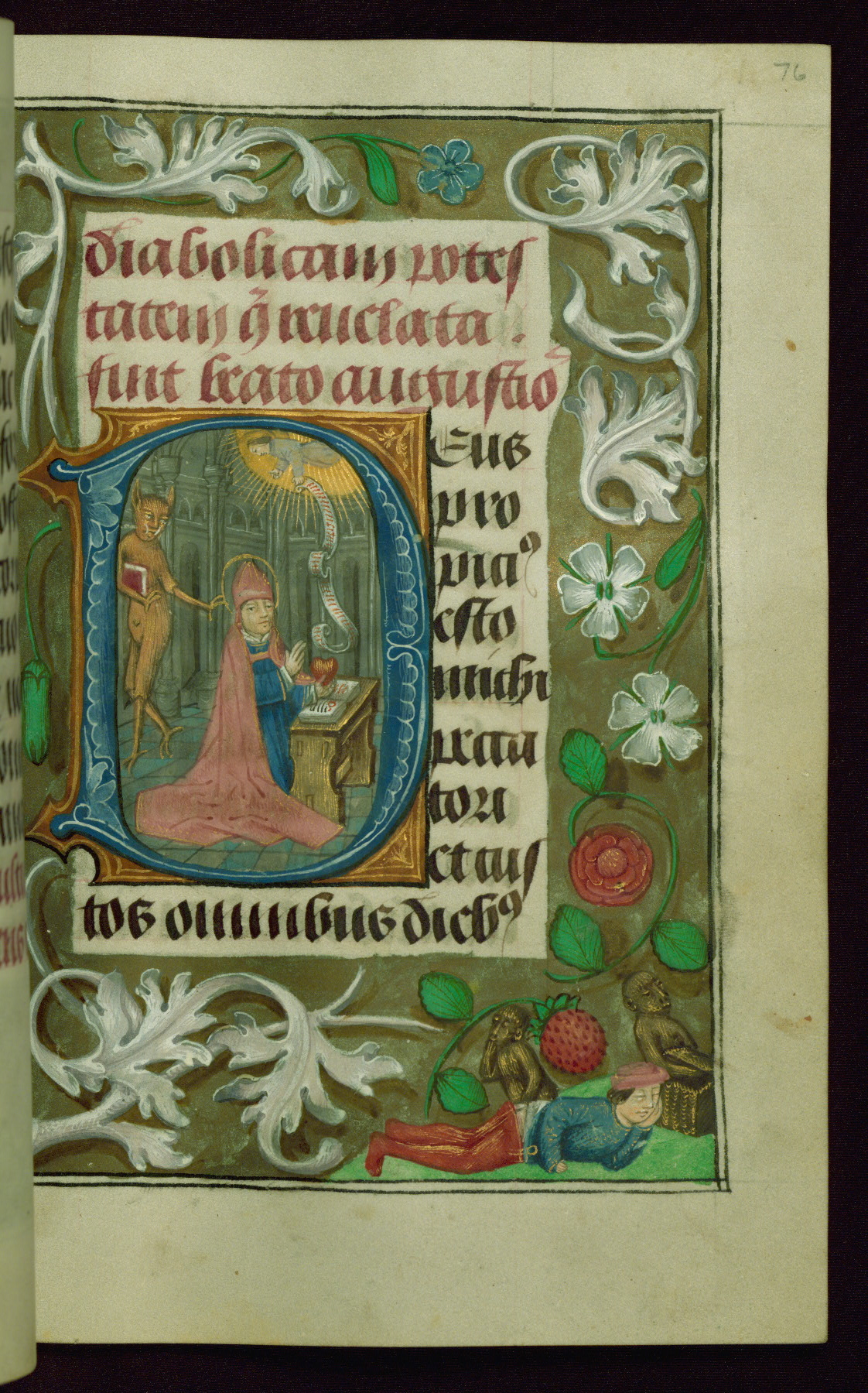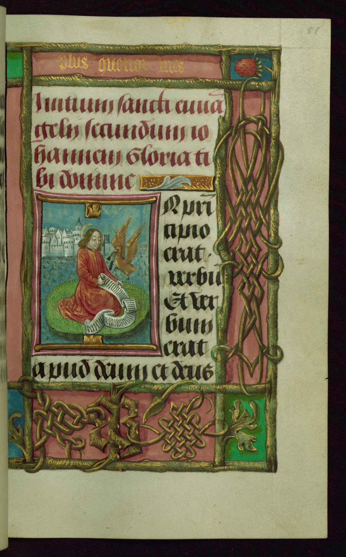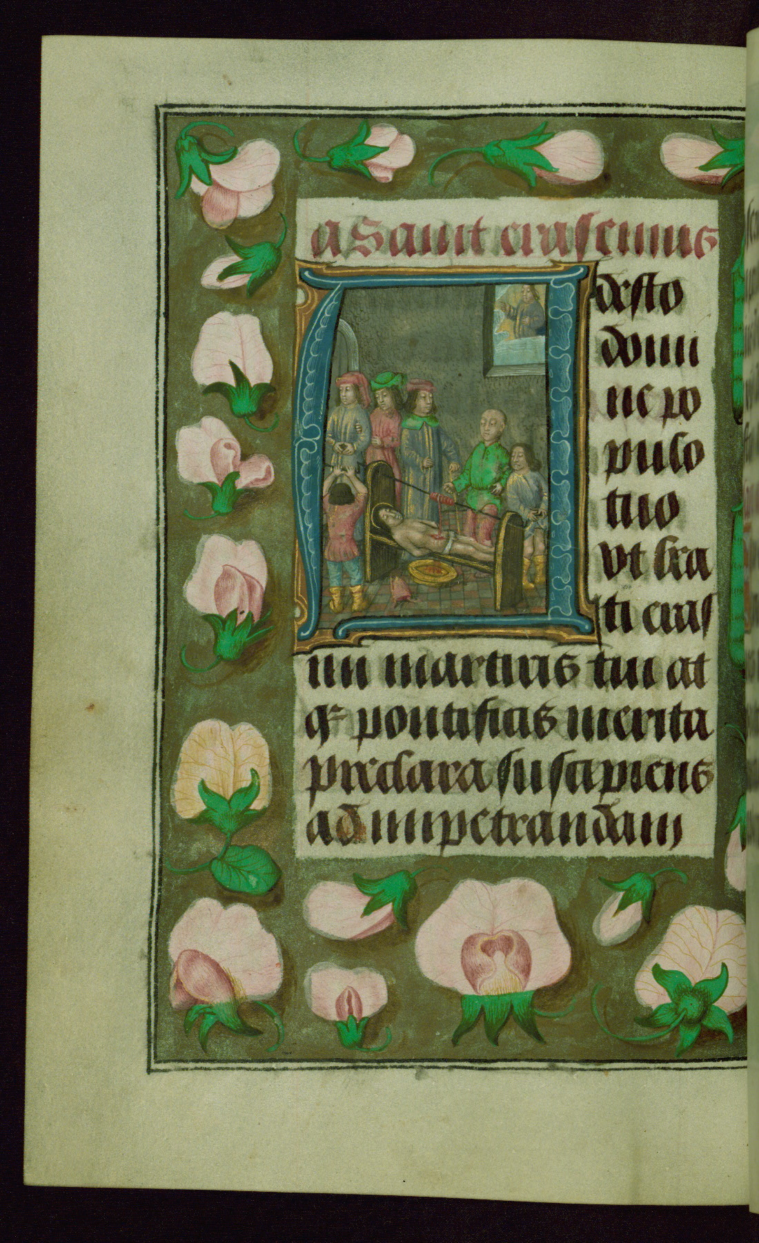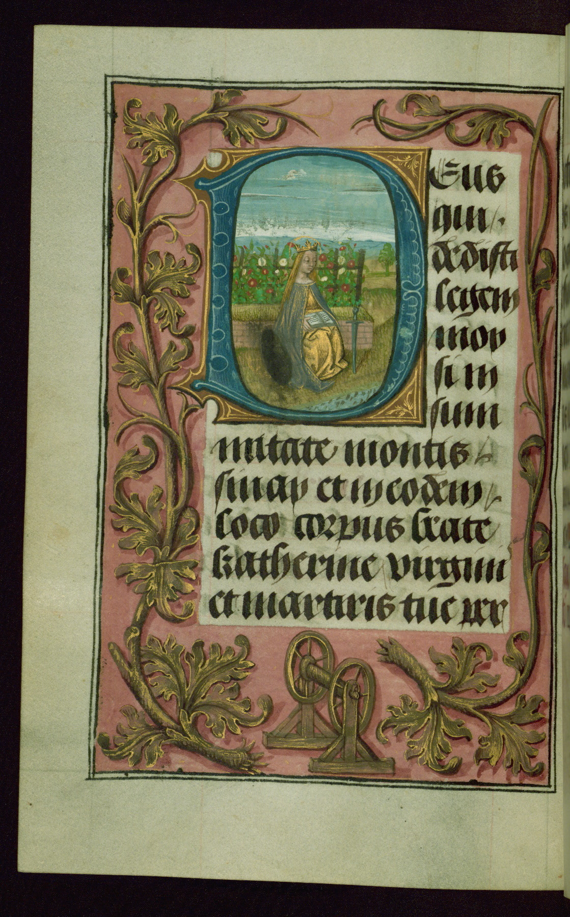 - Contents: Suffrages: fols. 51v-54r: Claudius: O desolatorum concolator. . .; fols. 54r-57r: Sebastian: O sancte sebastiane. . .; fols. 57r-58v: Adrian: Ave sancte Adriane. . .; fols. 59r-60v: Anthony: Vox de celo facta est. . .; fols. 60v-62v: Michael: Michael archangele veni adiutorio. . .; fols. 62v-63v: George: Omnipotens sempiterne Deus. . .; fols. 63v-65r: Nicholas: De sancto Nicholas. . .; fols. 65rv: Christopher: Deus qui beatum xristoforum. . .; fols. 65v-70r: Erasmus: Sancte Erasme martir. . .; fols. 70r-71r: Anne: De sancta Anna a[n]t[iphona]. . .; fols. 71v-72v: Margaret: De sancta Margareta veni sponsa xristi. . .; fols. 72r-74r: Catherine: Ave gemma claritatis. . .; fols. 74r-75v: Barbara: Ave martir Barbara. . .; fols. 75v-78r: Prayer to God, used to combat the power of devil in accordance with the revelation to st. Augustine: Oracio multum bona. . .; fols. 78r-80r: Prayer to Christ: Domine Ihesu xriste. . .; fols. 80r-87v: Four prayers to the Virgin