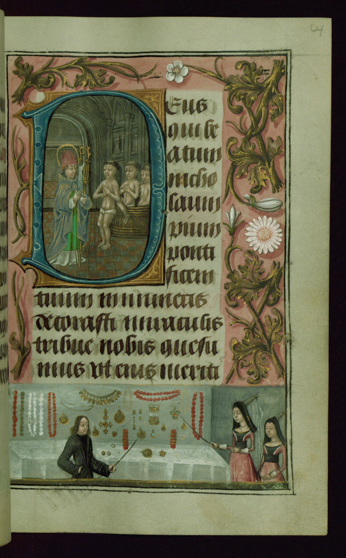 Created in Ghent in the 1480s for Adolph, Duke of Cleves, count of La Marck, lord of Ravenstein and Wijnendale (1425-92) (fols. 13v, 14v and 58r: arms of three members of the family of Cleves (Engelbert, Catherine of Cleves' nephew, Adolph, and his son Philip); fol. 13v: portrait of Adolph of Cleves wearing the collar of the Order of the Golden Fleece (Adolph was the only one of the three members of the family who became a knight of the order); fol. 80v: initial with another portrait of Adolph of Cleves; fol. 71r, lower margin: entry by Anne of Burgundy, second wife of Adolph of Cleves: "A B / votre mieulx aimee / Anne"