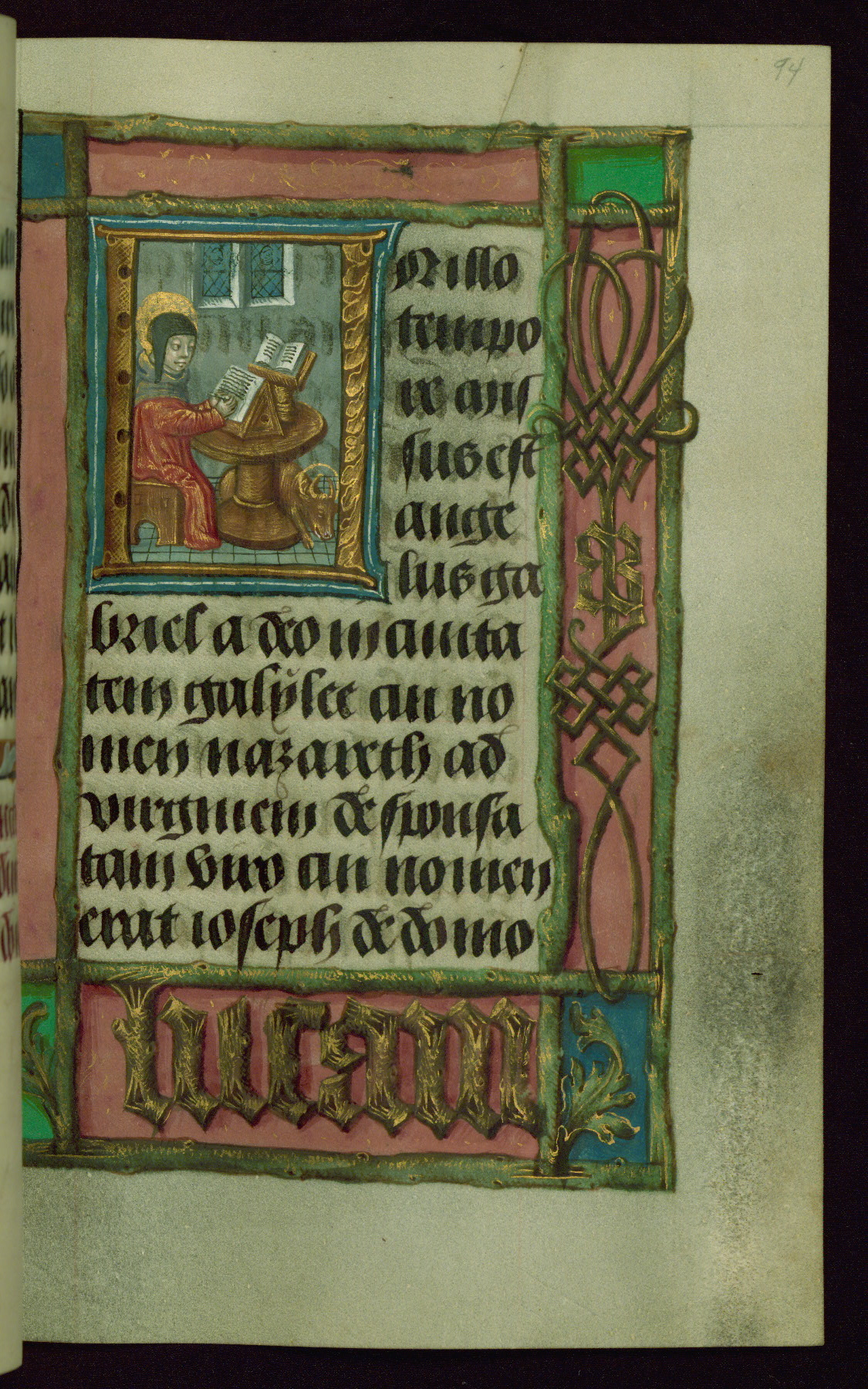 - Decoration note: Two full-page miniatures facing each other at the opening of the book; four full-page miniatures with decorated margins on three sides and facing opening pages of text with matching decorated margins; five large miniatures with historiated and decorated margins above and below the textblock; eighteen historiated initials (6-8 lines); light blue and white initials (1-4 lines) against red ground mark the secondary text divisions; geometric line fillers in red and white; rubrics and major feasts days in red; text in black ink