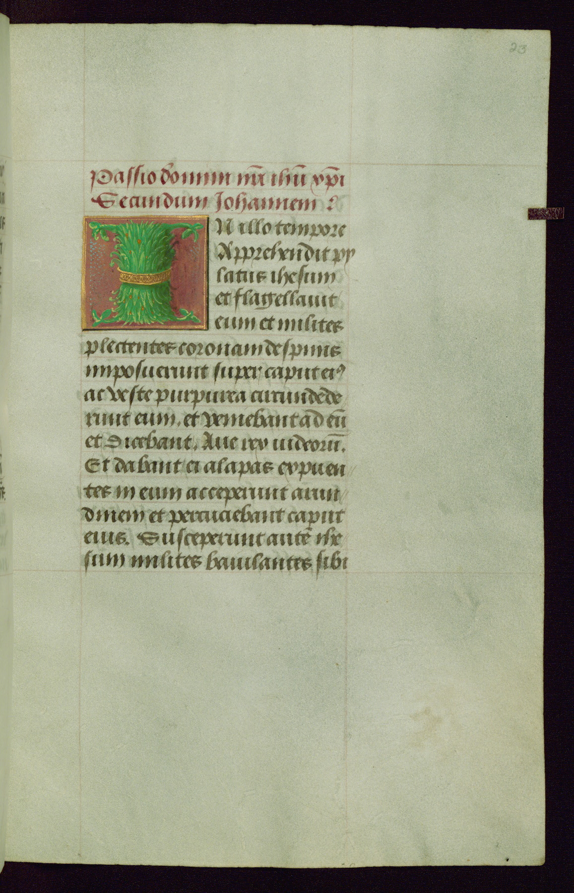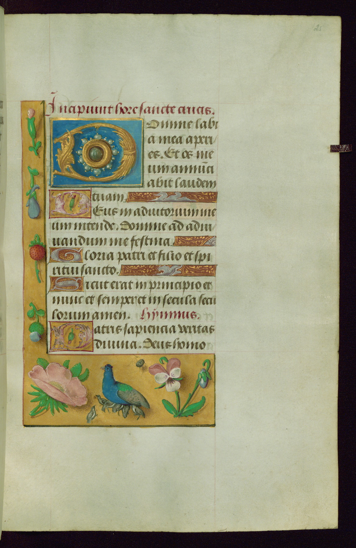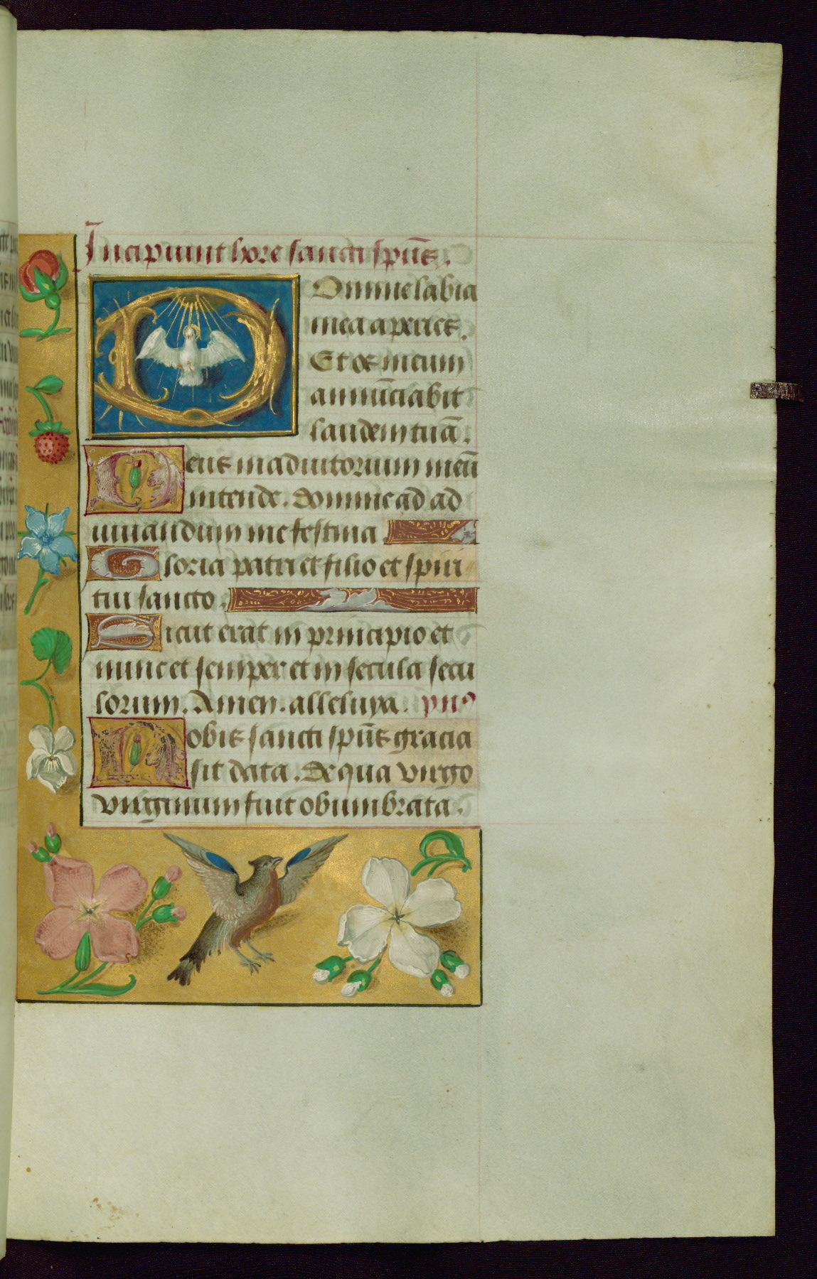 - Decoration note: No full-page miniatures are extant but were likely there and are now missing; remaining illuminations appear to be by Ghent Associates; twelve illusionistic borders, some with drolleries; fifty-one extant decorated illuminated initials (5 lines), with one missing at the beginning of Hours of the Virgin (after fol. 37); smaller, less carefully painted foliate initials at secondary text divisions and for KL in calendar (2-3 lines); grisaille, red-brown, and gold initials for versals (1 line); occasional line filler throughout in same colors as versals; rubrics in red; text in dark brown ink