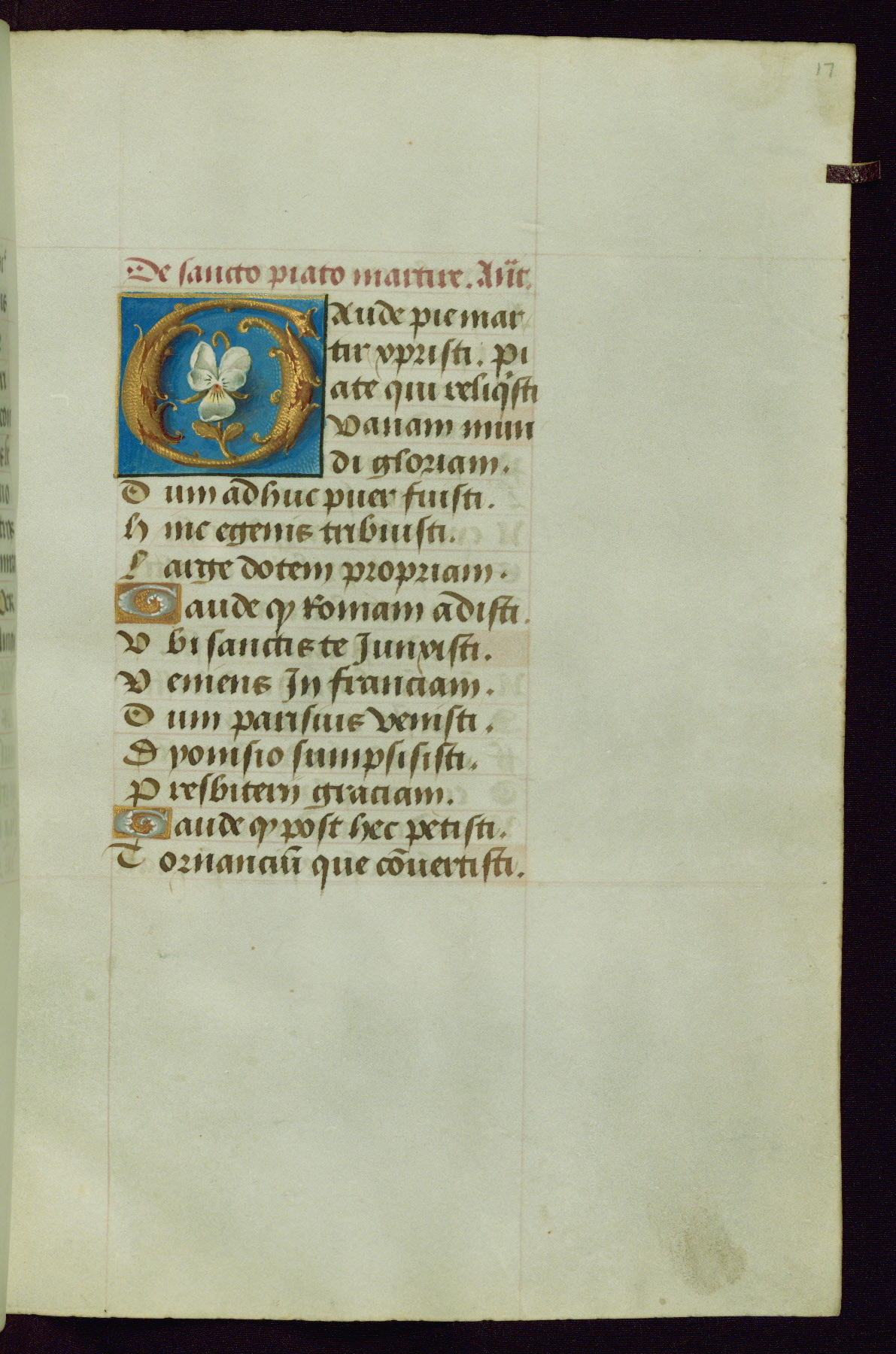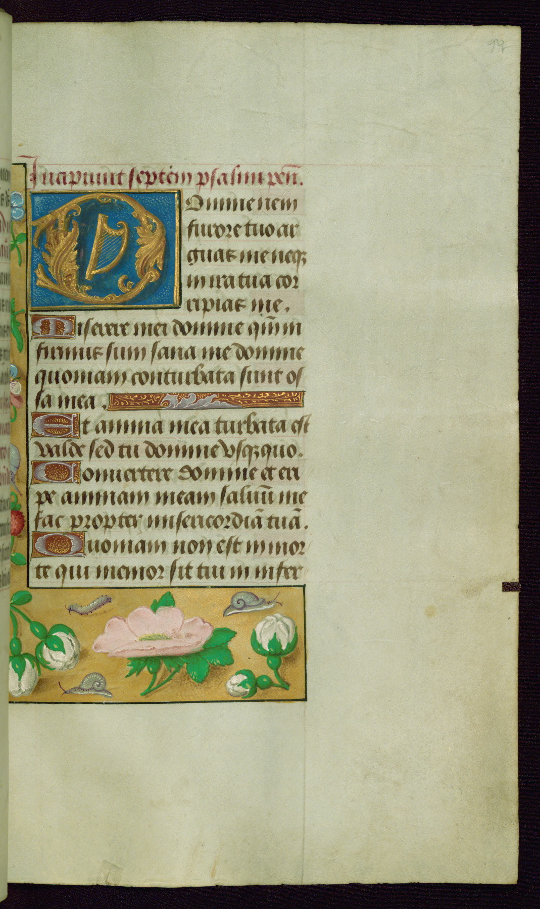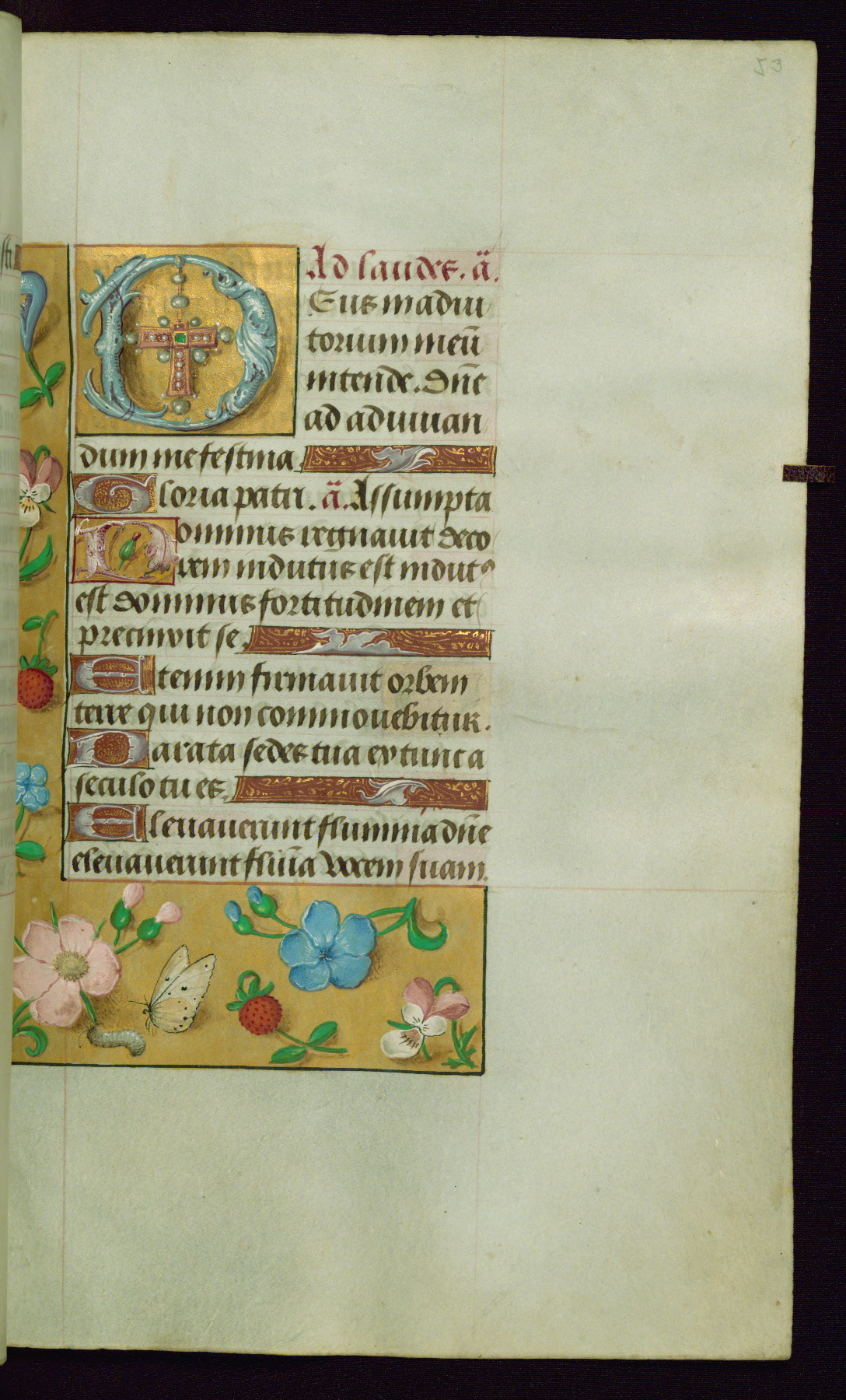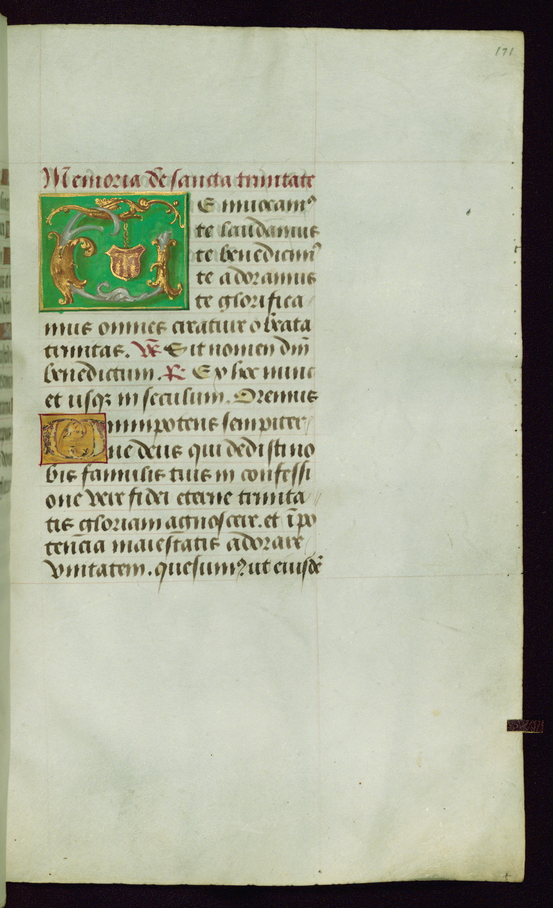 - Decoration note: No full-page miniatures are extant but were likely there and are now missing; remaining illuminations appear to be by Ghent Associates; twelve illusionistic borders, some with drolleries; fifty-one extant decorated illuminated initials (5 lines), with one missing at the beginning of Hours of the Virgin (after fol. 37); smaller, less carefully painted foliate initials at secondary text divisions and for KL in calendar (2-3 lines); grisaille, red-brown, and gold initials for versals (1 line); occasional line filler throughout in same colors as versals; rubrics in red; text in dark brown ink
