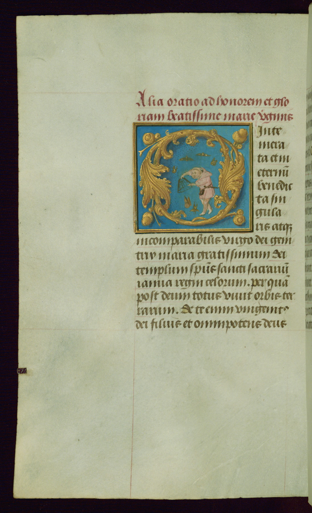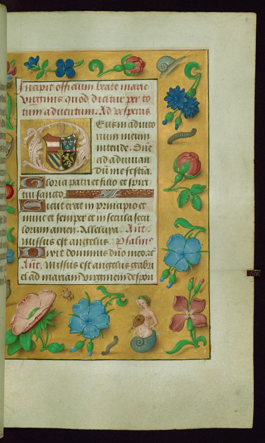 This Book of Hours was created by the artists known as the Ghent Associates ca. 1490-1500. The manuscript appears to have been originally made for Philip the Handsome, also known as Philip the Fair (1478-1506), duke of Austria, Brabant, and Burgundy, and count of Flanders and Hainaut. Although there are no longer extant miniatures, many of the fifty-one decorated illuminated initials contain images that refer to its prominent owner. Most notably, Philip's heraldry is found on fol. 91r, and some of the many jewels depicted throughout the initials can be traced to jewelry worn by women in his family in portraits, such as his mother, Mary of Burgundy, and his wife, Joanna of Castille (see Randall p. 464 for details). As there are a large number of decorated initials, only those with known special significance have been cataloged here.