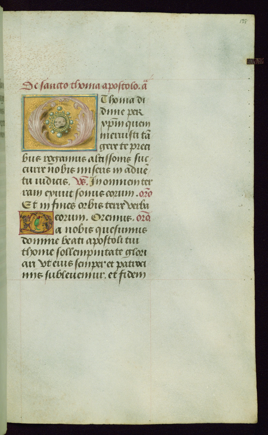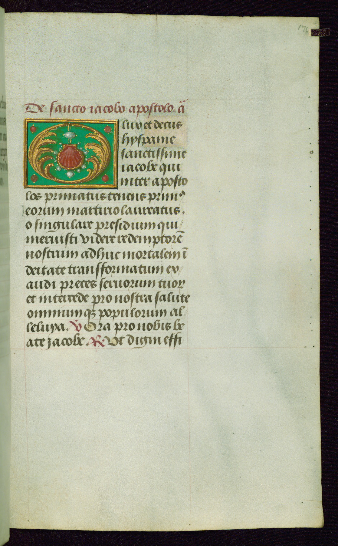 - Contents: Suffrages to: fol. 171r-v: the Trinity; fol. 172r-v: St. Michael; fol. 173r-v: St. John the Baptist; fol. 174r-v: SS. Peter and Paul; fol. 175r-v: St. Andrew; fol. 176r-v: St. James the Greater; fol. 177r-v: St. John the Evangelist; fol. 178r-v: St. Thomas; fol. 179r: SS. Philip and James; fol. 180r-v: St. Bartholomew; fol. 181r-v: Matthias; fol. 182r-v: St. Barnabas