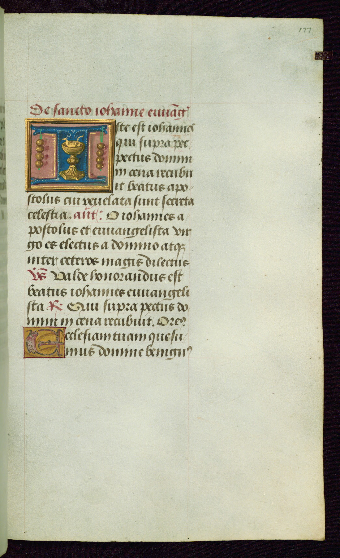 - Contents: Gospel sequences and other aspects of the manuscript are possibly misbound according to Randall, who suggests John and Luke on fols. 183-186 originally comprised the first quire based on signatures "a2" and "a3" that she sees on fols. 183 and 184; however, she does not provide a suggestion as to how the folios were originally ordered, and it is not clear where those folios belong, as they do not comprise their own quire but are flanked by suffrages within the quire; therefore, a reconstruction has not been attempted, and the contents are recorded here as they are currently found in the manuscript