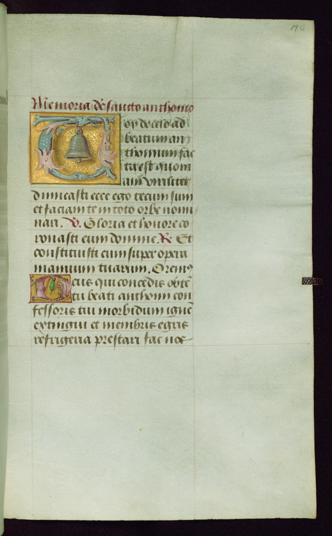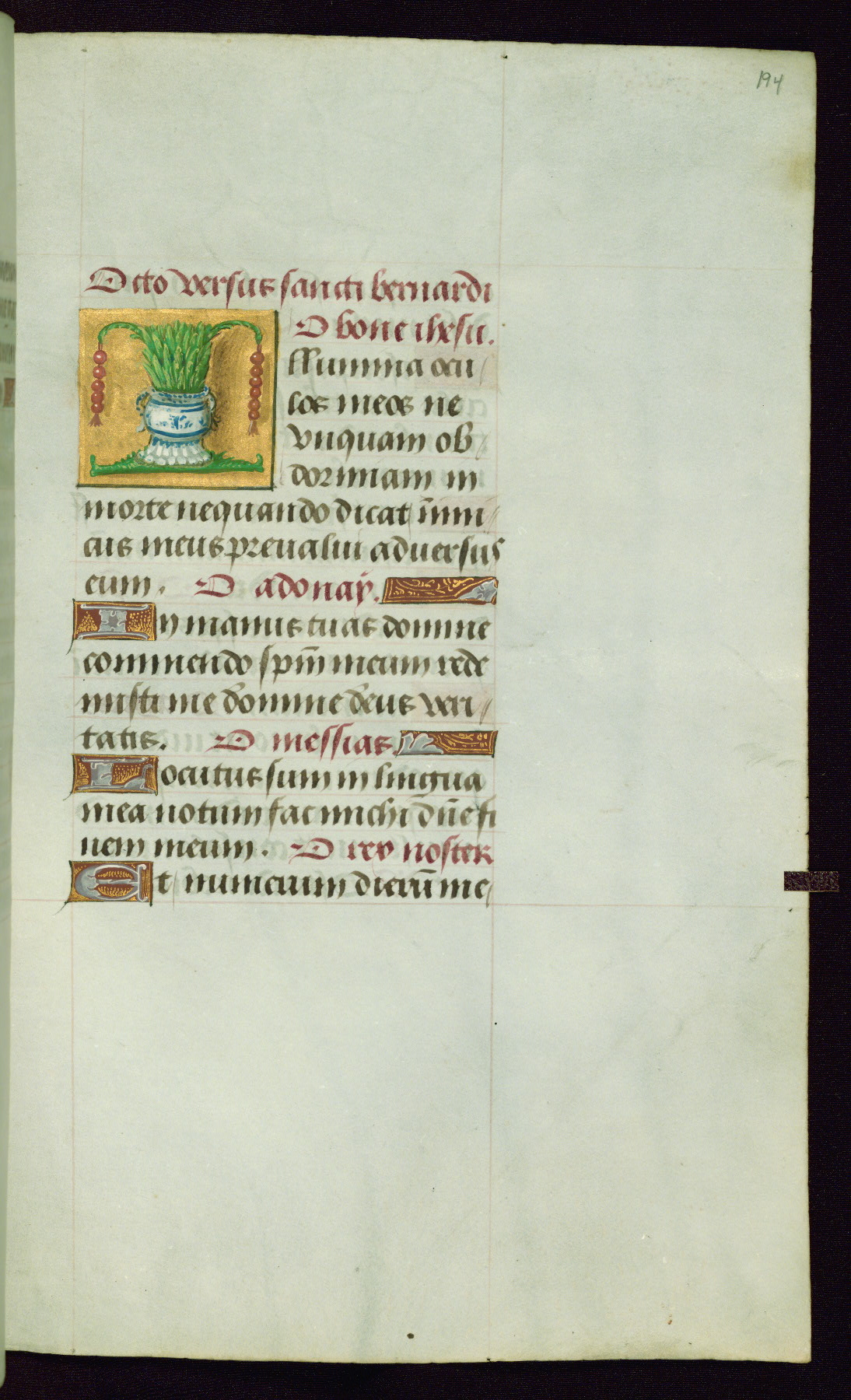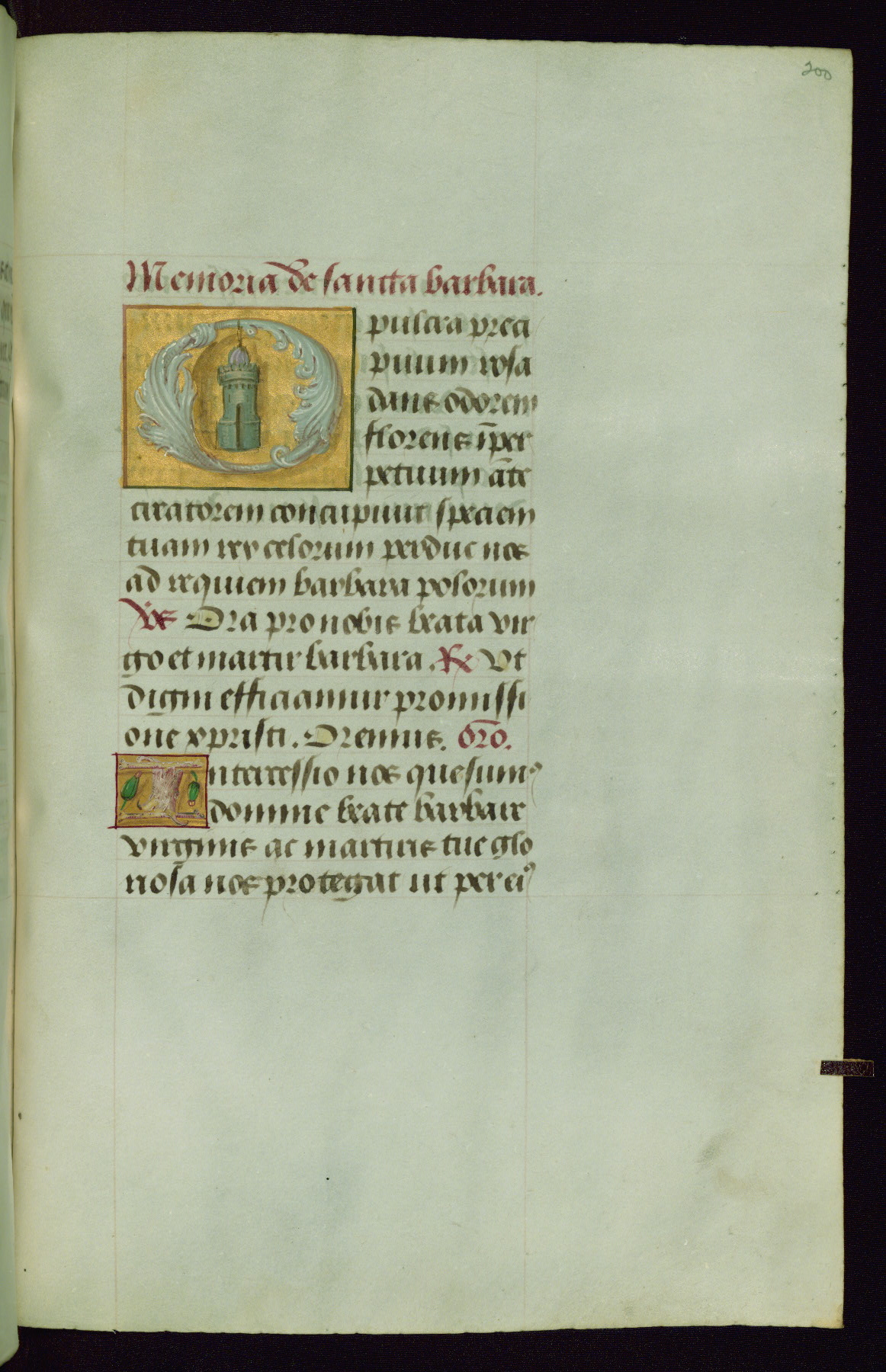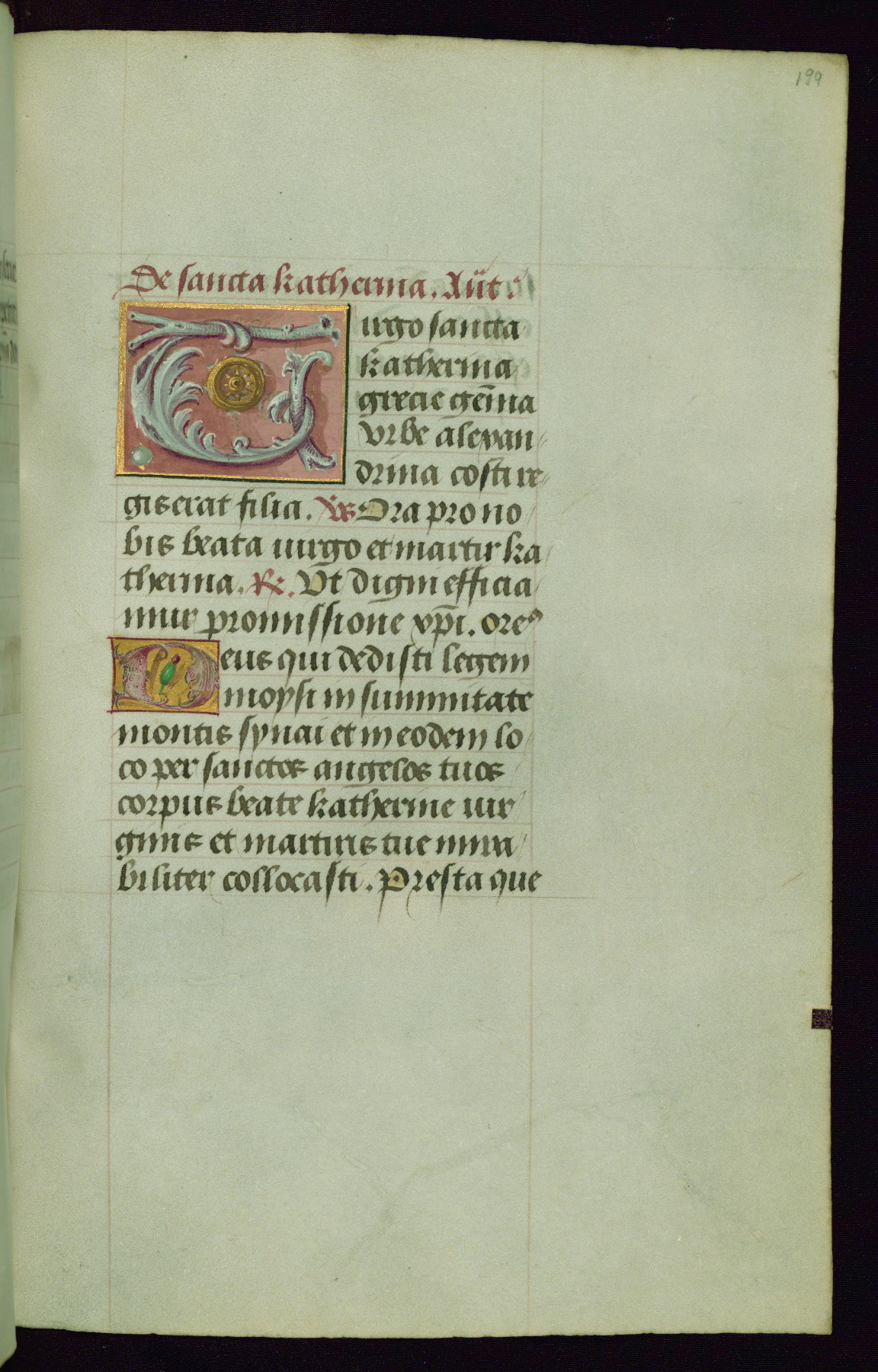 - Contents: Suffrages with interspersed prayers: fol. 187r-v: St. Sebastian; fol. 188r-v: St. Stephen; fol. 189r-v: St. Lawrence; fol. 190r-v: St. Anthony; fols. 191r-192r: St. Claudius; fol. 193r-v: St. Francis; fol. 194r-v: Eight Verses of St. Bernard; fol. 195r-v: Omnipotens sempiterne deus; fols. 196r-197v: St. Anne; fol. 198r-v: St. Mary Magdalene; fol. 199r-v: St. Catherine; fol. 200r-v: St. Barbara; fol. 201r-v: St. Margaret; fols. 202r-206r: Prayer to the Virgin for reading on Saturday, attached to prayer to the Virgin as intercessor; fols. 206v-207r: Oratio. De deprecor ego mitissimam; fols. 208r-211r: Prayer to Christ for forgiveness of sins