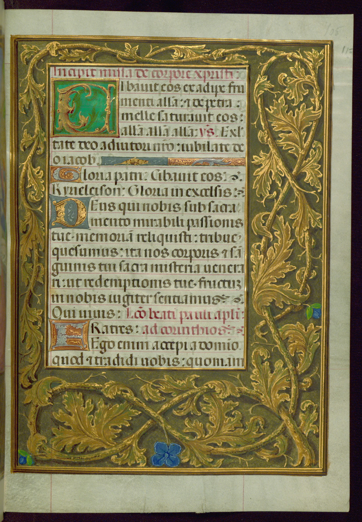 Originating in Ghent or Bruges, Flanders, in the early sixteenth century, this Dominican Book of Hours focuses on the Passion of Christ and the Corpus Christi. This book masquerades as a purely authentic medieval manuscript, when in fact it is a modern and medieval hybrid. The majority of the manuscript was made ca. 1500, but it had remained unfinished. Its nineteenth-century owner, John Boykett Jarman, commissioned English illustrator William Caleb Wing to "finish" the manuscript ca. 1850. Known for his manuscript illumination skills, Wing recreated imagery typical of a fifteenth- to sixteenth-century Flemish Book of Hours. Henry Walters was aware that the manuscript was partially painted in the nineteenth century when he purchased it, as the manuscript is noted as a "forgery" in the James C. Anderson inventory, December 7th, 1913. Whether pages and images are original or nineteenth century has been indicated both within the individual text parts as well as within the image cataloging.