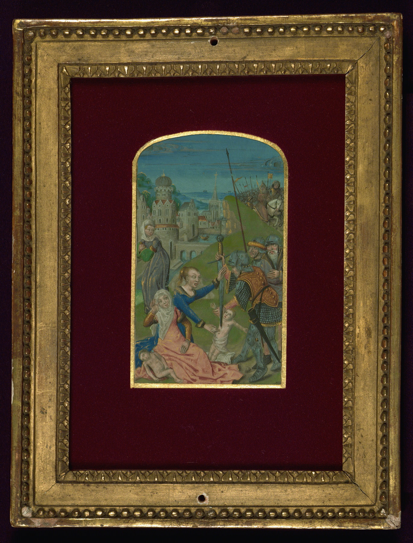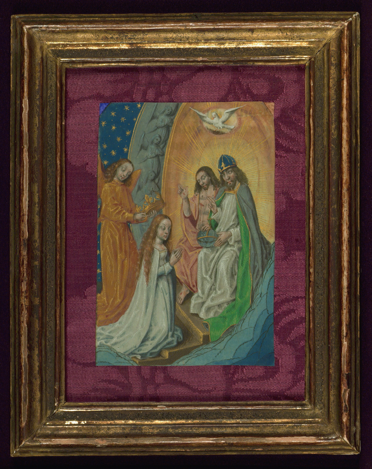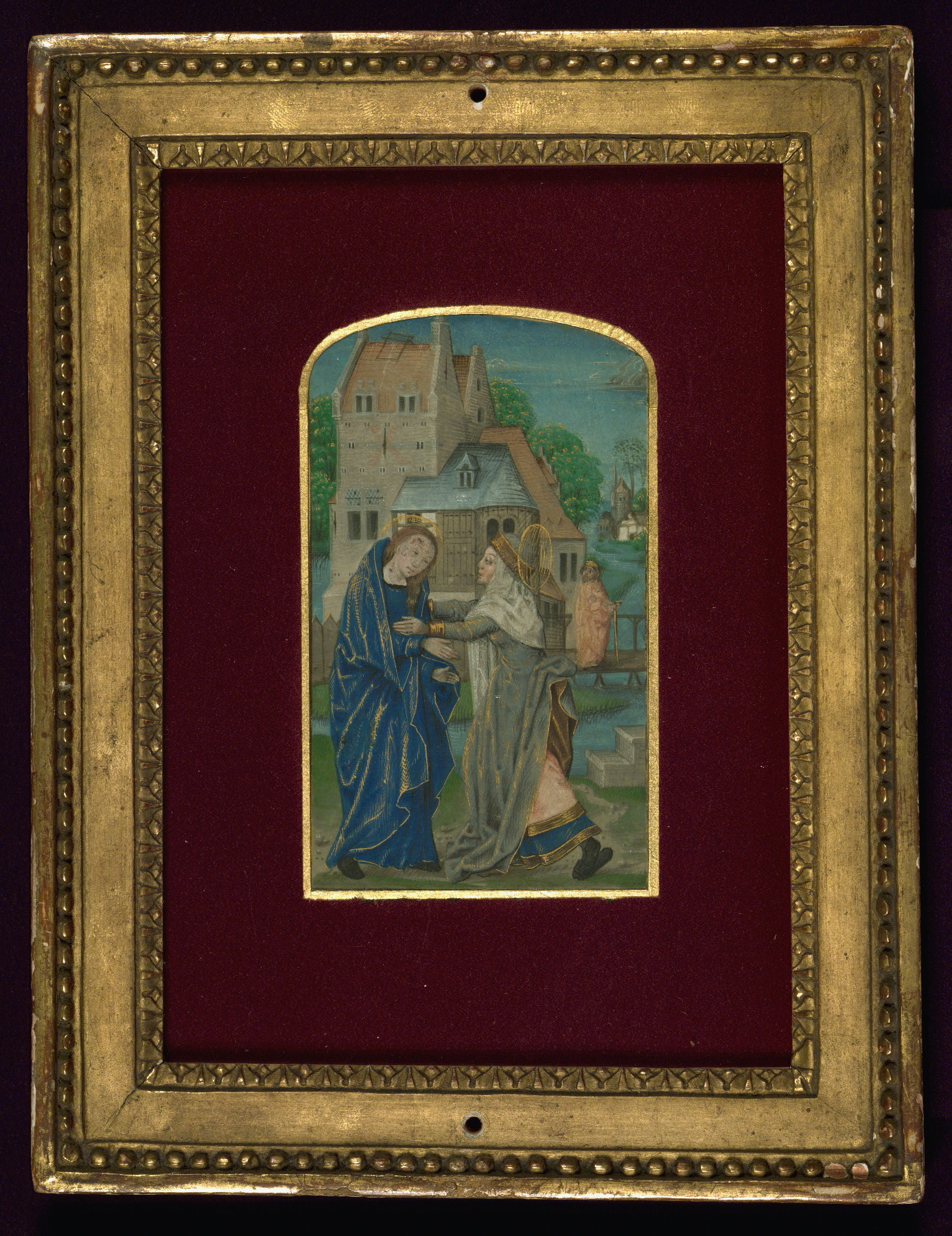 These six full-page miniatures were originally part of a Book of Hours created in Bruges ca. 1480-90. It is unknown at what point the images were excised from the book, but at least four of them were mounted and framed ca. 1900 by the Parisian bookdealer and binder Léon Gruel. Although the book they were part of has not been identified, and may be lost, Roger Wieck has suggested a stylistic relationship between these miniatures and works by the Master of Edward IV, an artist working in Bruges ca. 1470-90. For another example of work by this artist and his circle, see Walters manuscript W.435. As there is no text remaining with the images, their original positions within the text of the manuscript they once illuminated are conjectural, and the text identifiers included here are those proposed by Lilian Randall in her catalog.